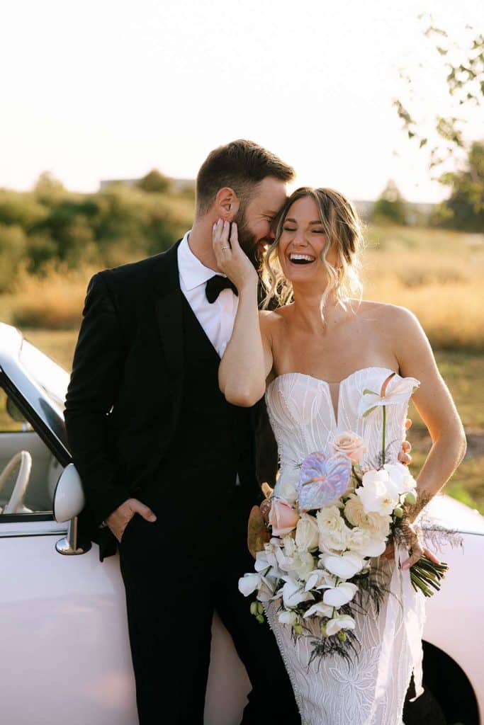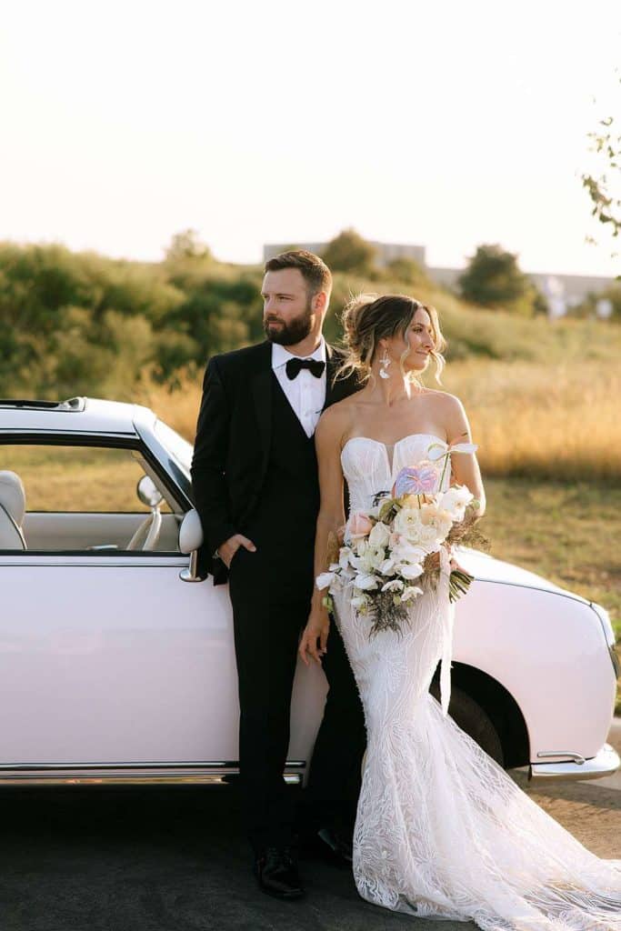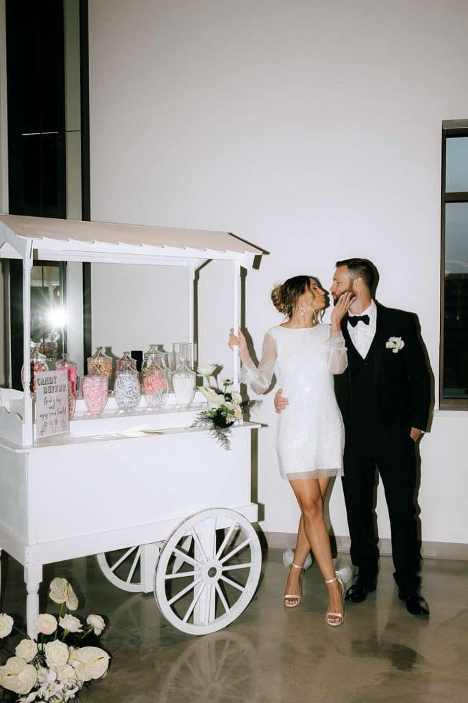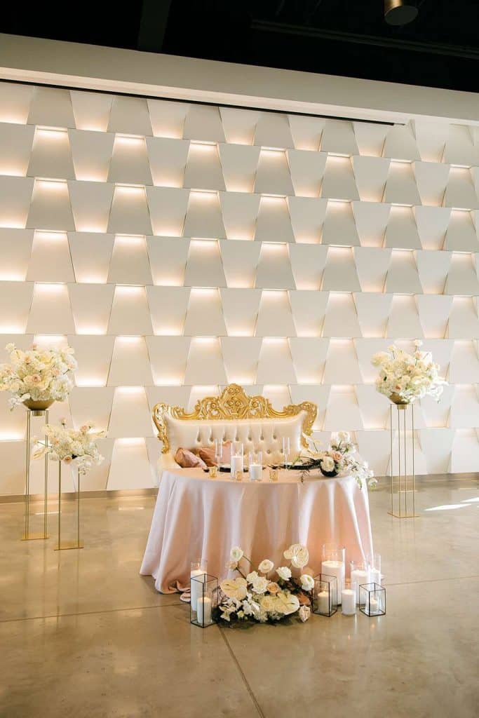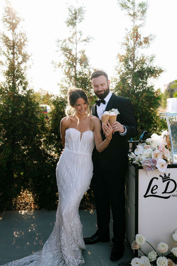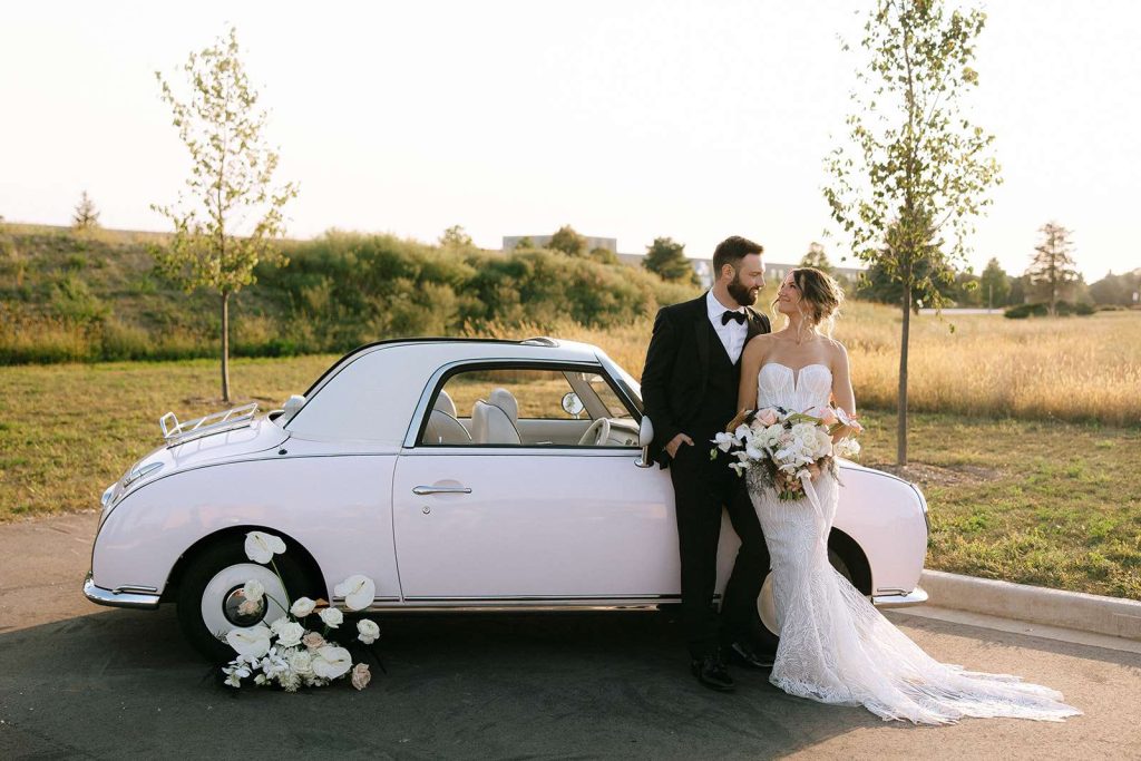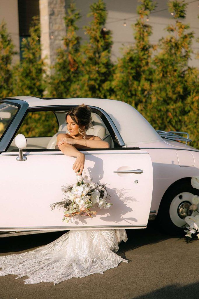 Cascading floral arrangements, created by Reflections of You, adorned the head table framing it perfectly with color and texture. Linens, from Windy City Linen, played a nice complimentary role to the florals. The addition of a pink vintage car, from Once Upon a Figgy, added that perfect pop of flair to the scene. And, an ice cream cart on the patio to add some sweetness. All together, it hinted at timeless charm yet felt refreshingly modern.