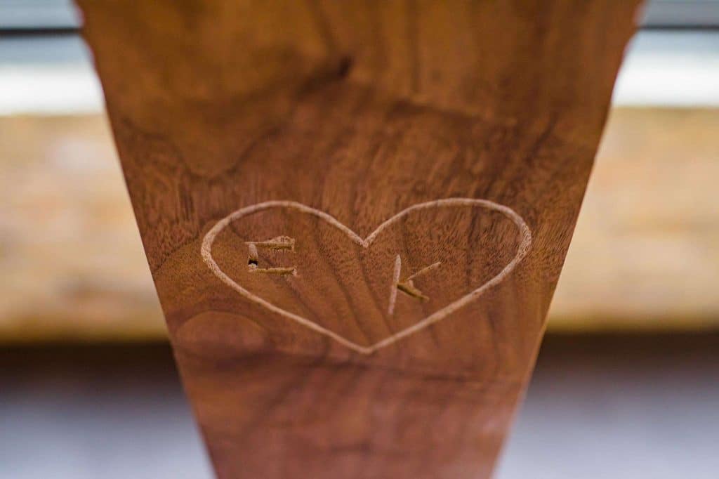 Courtney and Kevin worked with Belle Fiori on floral designs, including a ceremony arch and hanging display. “Kevin built the arch we were married under and it was decorated by Belle Fiori,” Courtney says. “For our unity ceremony, we carved our initials into the arch. Now we have it in our backyard.”