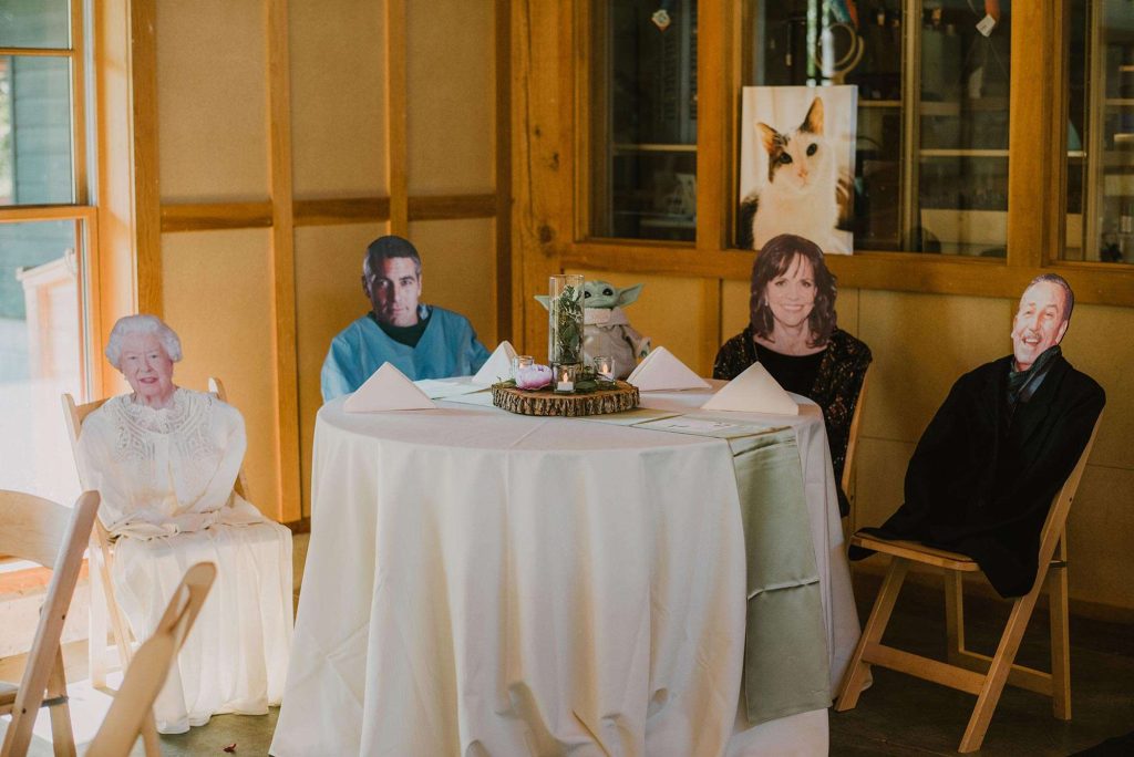 That’s right—Scott and Courtney had quite the string of celebrity appearances at their wedding. “The Queen of England, Baby Yoda, Sally Field, Walt Disney, and George Clooney made surprise appearances for our reception! We were so happy to see that they could make it and enjoy the reception as much as our other guests.” Courtney’s sister, brother-in-law, and parents had cardboard cutouts seated at a special table for these guests of honor. “They were more than willing to sit for photographs with our wonderful guests!”