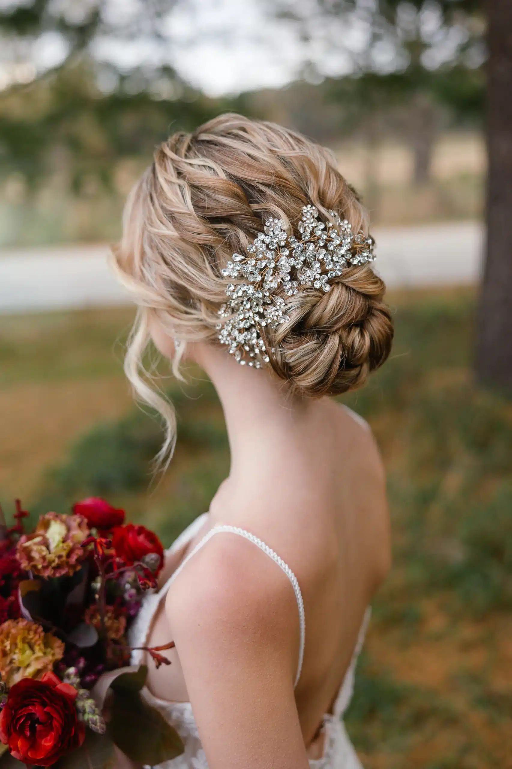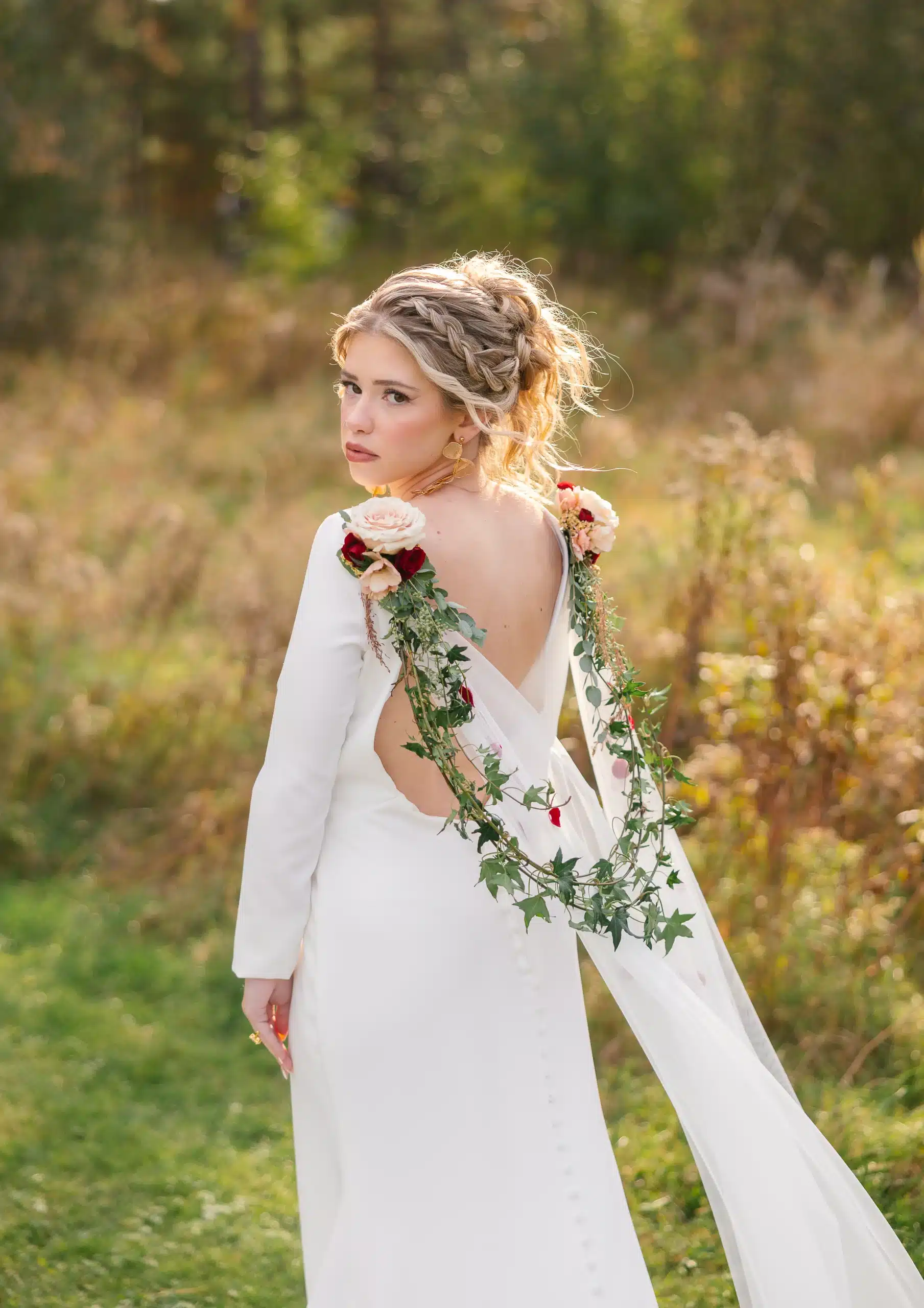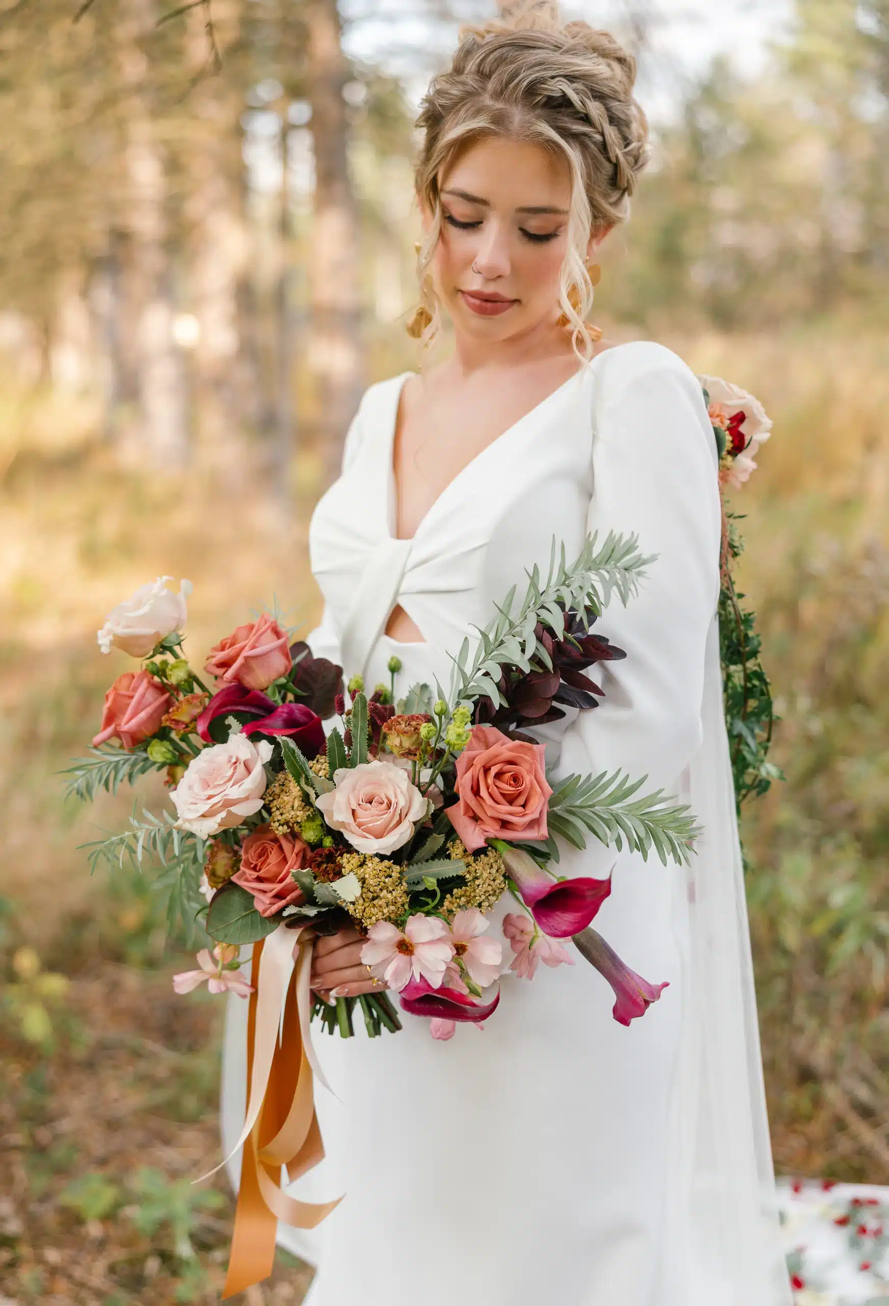 Couture gowns from Bliss Bridal were the perfect complement to the bold floral palette—modern silhouettes with refined details that felt both editorial and wearable. Styled effortlessly against the natural textures of Lapham Peak, the gowns proved that high fashion and outdoor weddings are a perfect match.