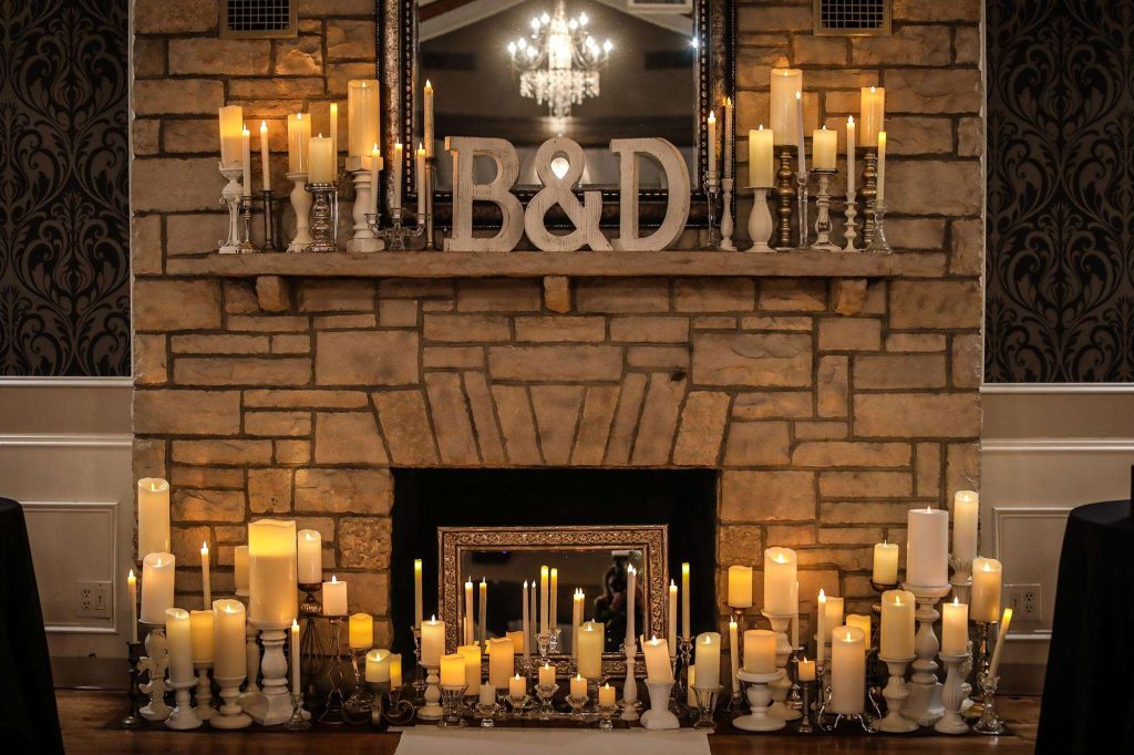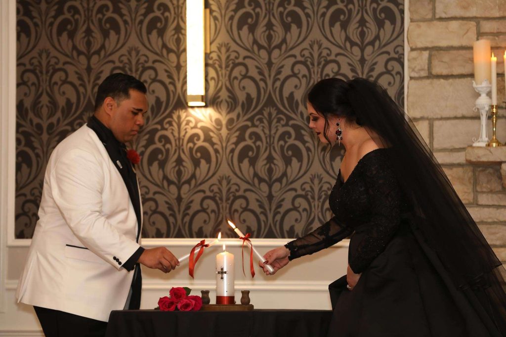 For the ceremony, there was a gorgeous aisle runner leading to a fireplace flooded with candles.The white runner and other linens came courtesy of Ambrosia Events. The flower girl and ring bearer were Brittany and Dimitrios’ niece Charlotte and nephew Nickolas. “She was dressed as an angel and he was dressed as the devil. Nickolas carried the rings in a coffin-shaped ring box.” The kids were pulled down the aisle in Brittany’s childhood wagon, which she and Dimitrios disassembled, sanded, stained, painted, and refinished for the wedding.
