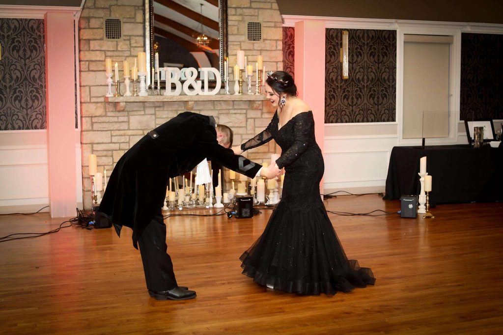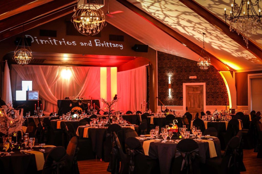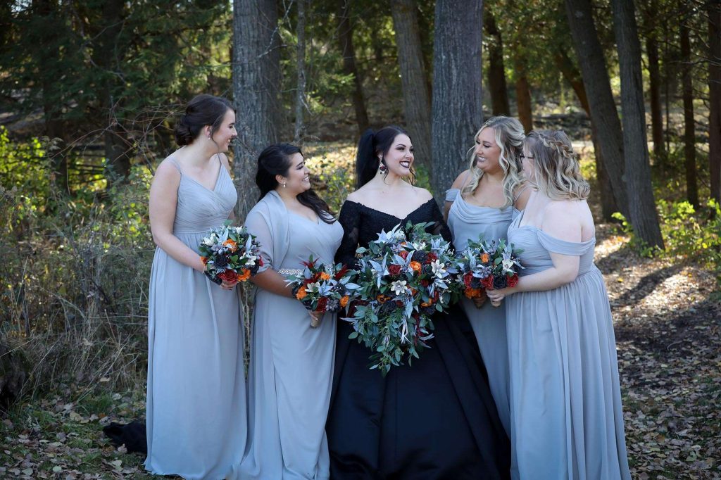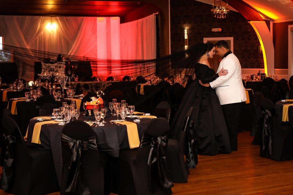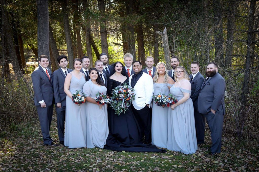 The wedding colors were dark and moody—anything that worked within the Halloween theme was acceptable. The bridesmaids wore light grey and men wore darker grey. Brittany’s three bridesmen wore orange ties to help them stand out from the groomsmen, who wore black ties. Both the ceremony and reception were held at Tuscan Hall in Waukesha, Wisconsin.