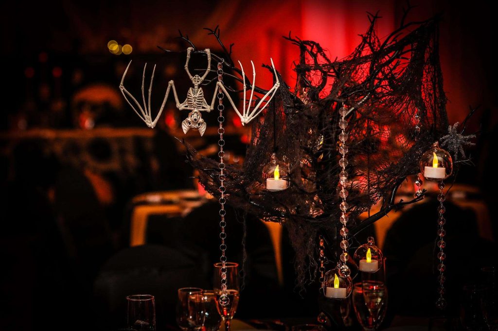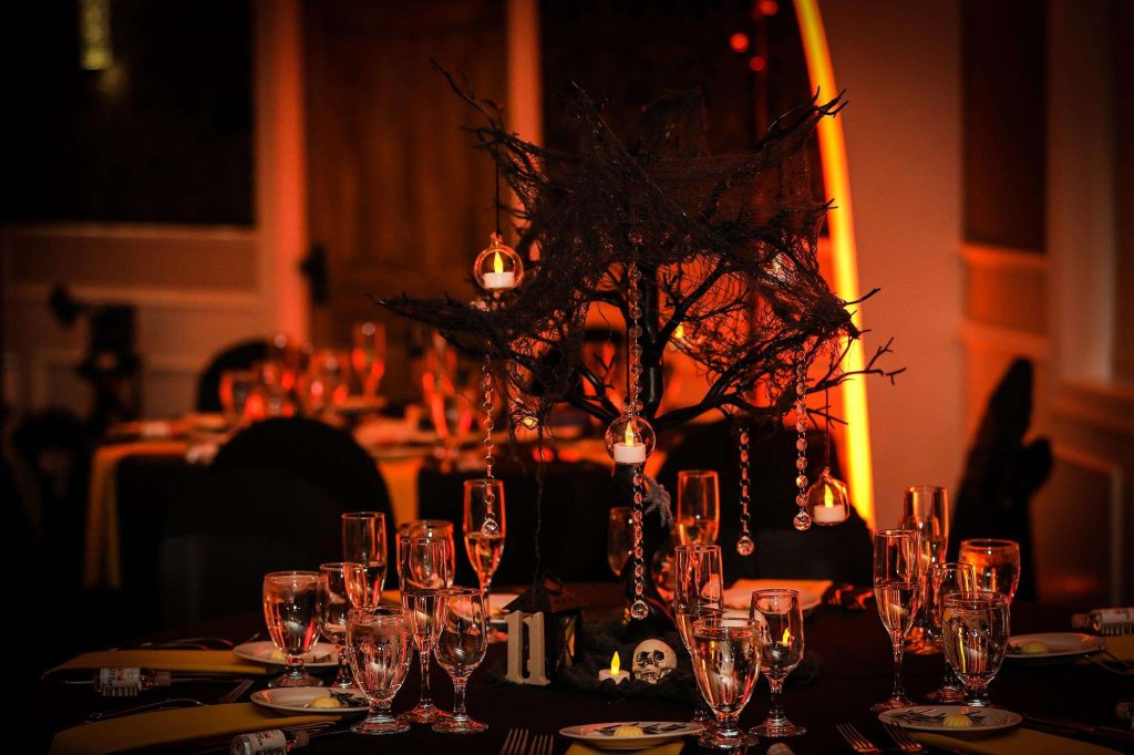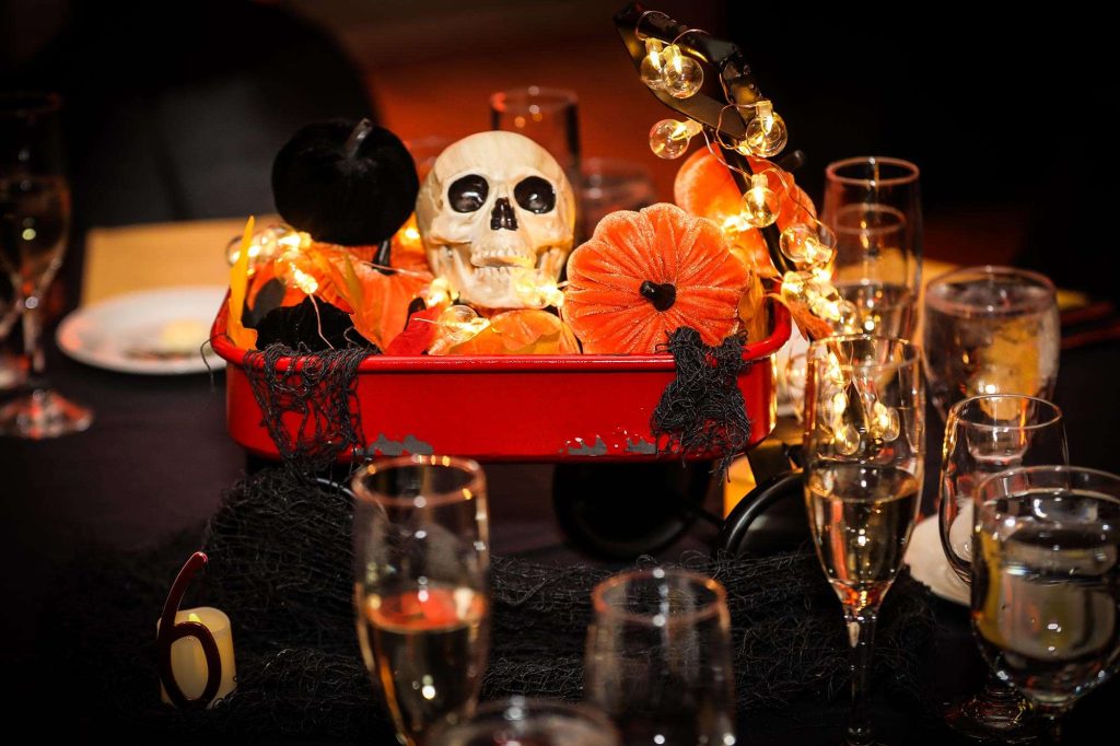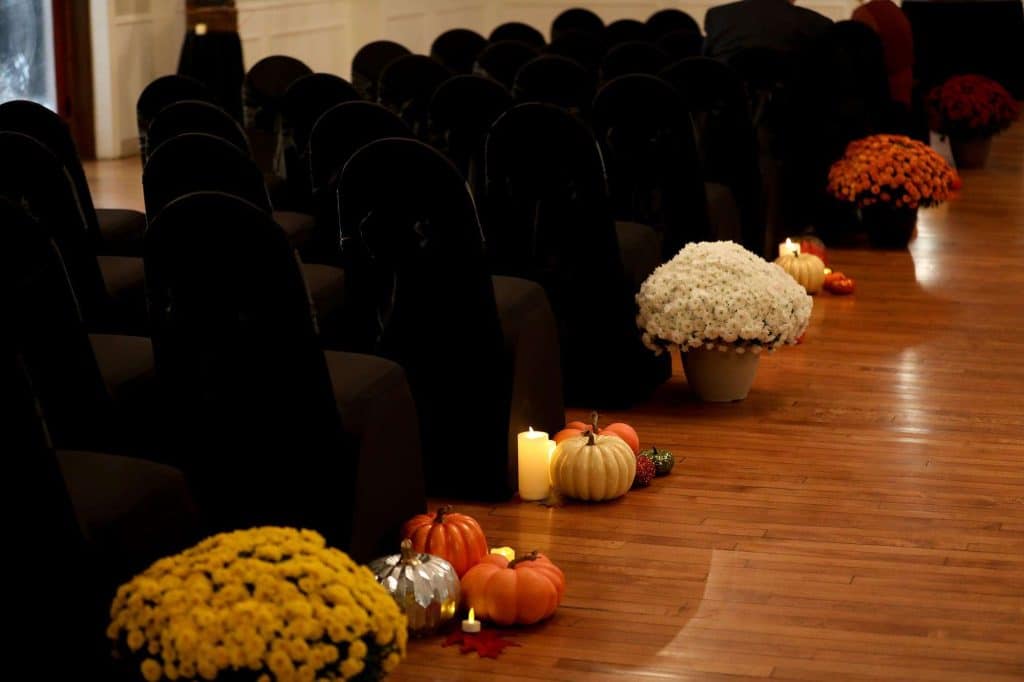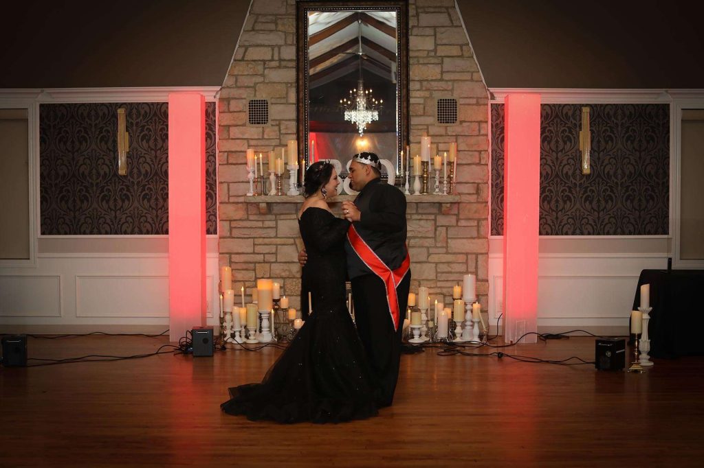 The wedding colors were dark and moody—anything that worked within the Halloween theme was acceptable. The bridesmaids wore light grey and men wore darker grey. Brittany’s three bridesmen wore orange ties to help them stand out from the groomsmen, who wore black ties. Both the ceremony and reception were held at Tuscan Hall in Waukesha, Wisconsin.
