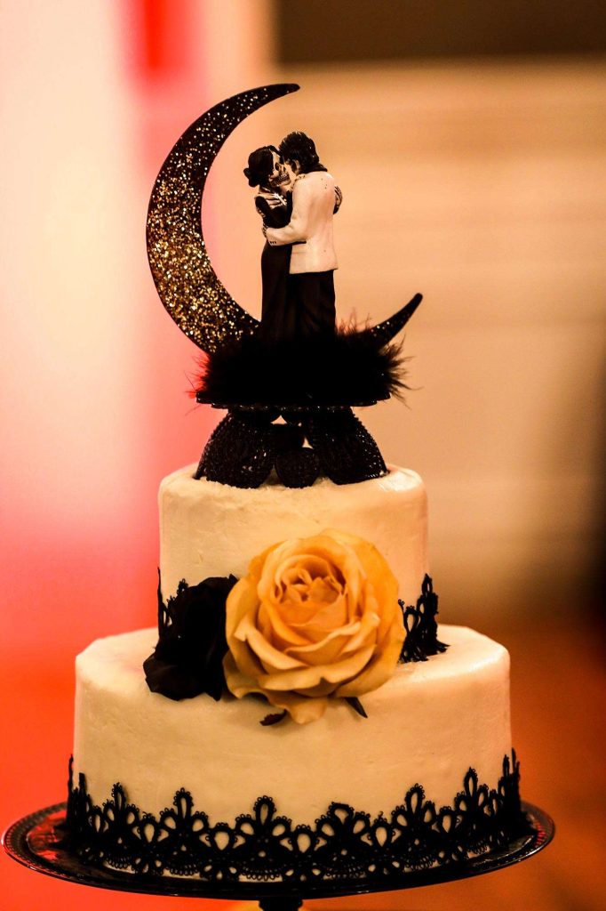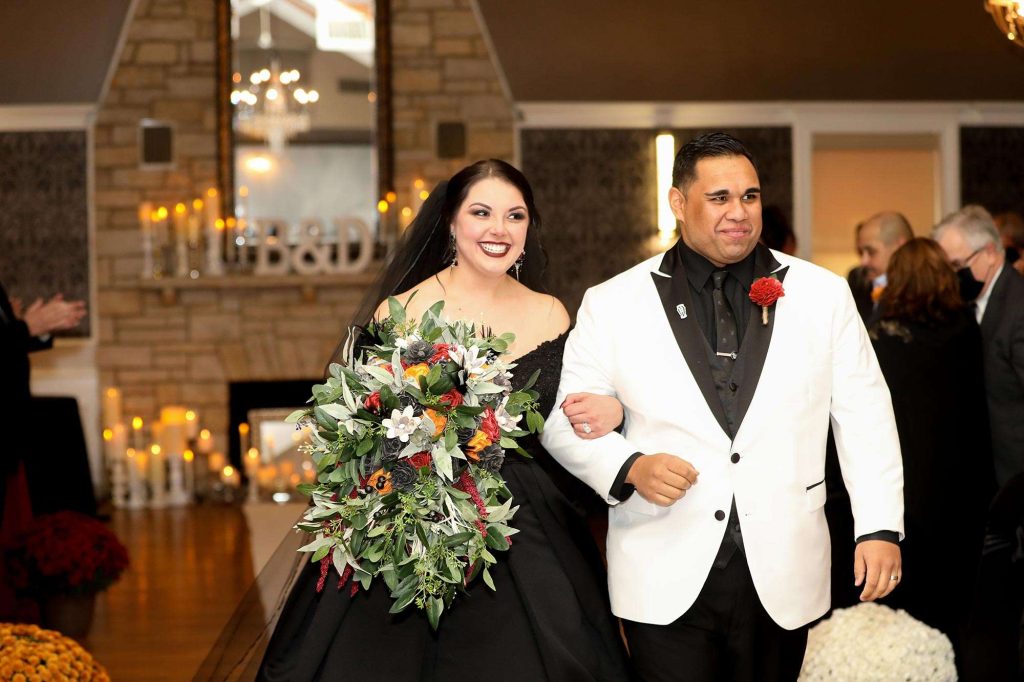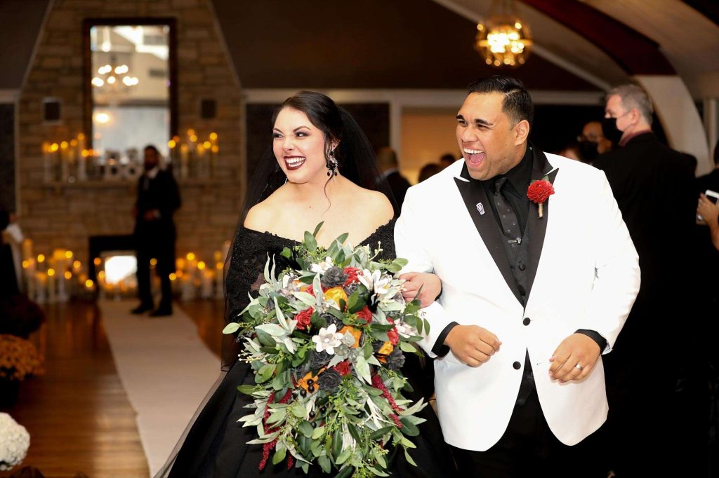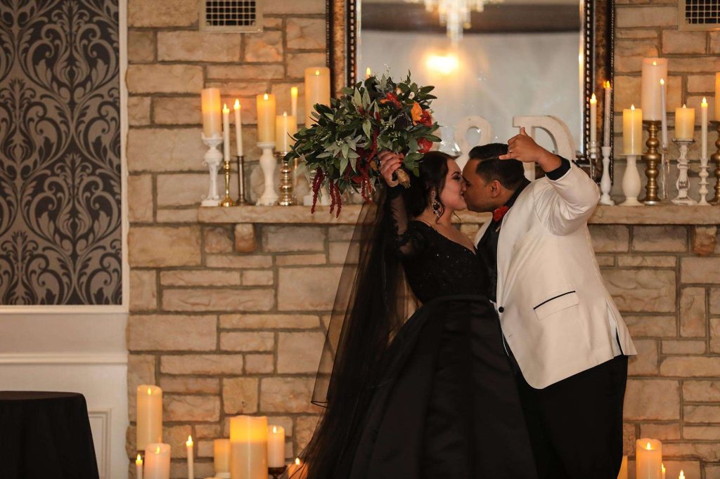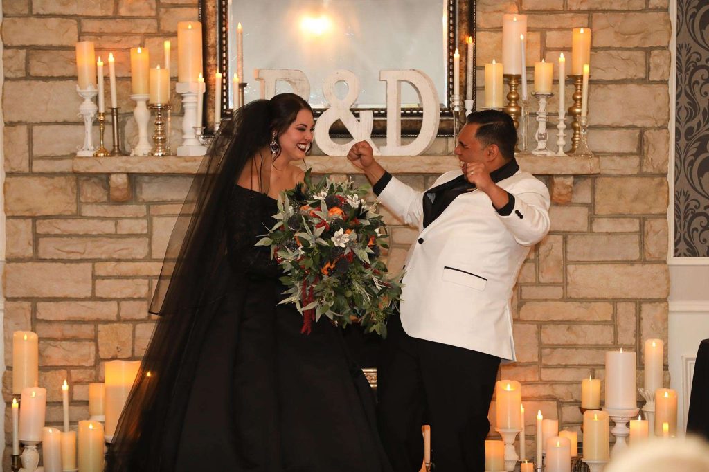 From the bride’s beautiful and bold black gown to a costume party reception, there was nothing about this wedding that didn’t have a fun Halloween twist. It’s Brittany’s absolute favorite holiday. “Halloween falls on a Saturday only every six years,” she says. “It was tough to convince Dimitrios to have a Halloween wedding, but after some coaxing, he gave the green light.”