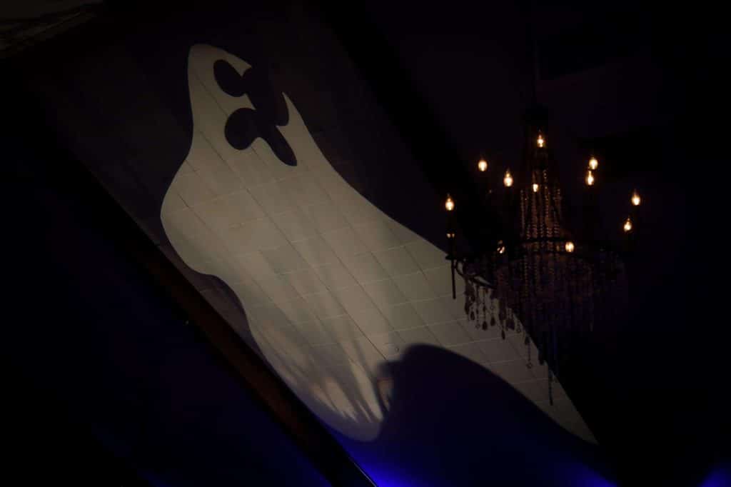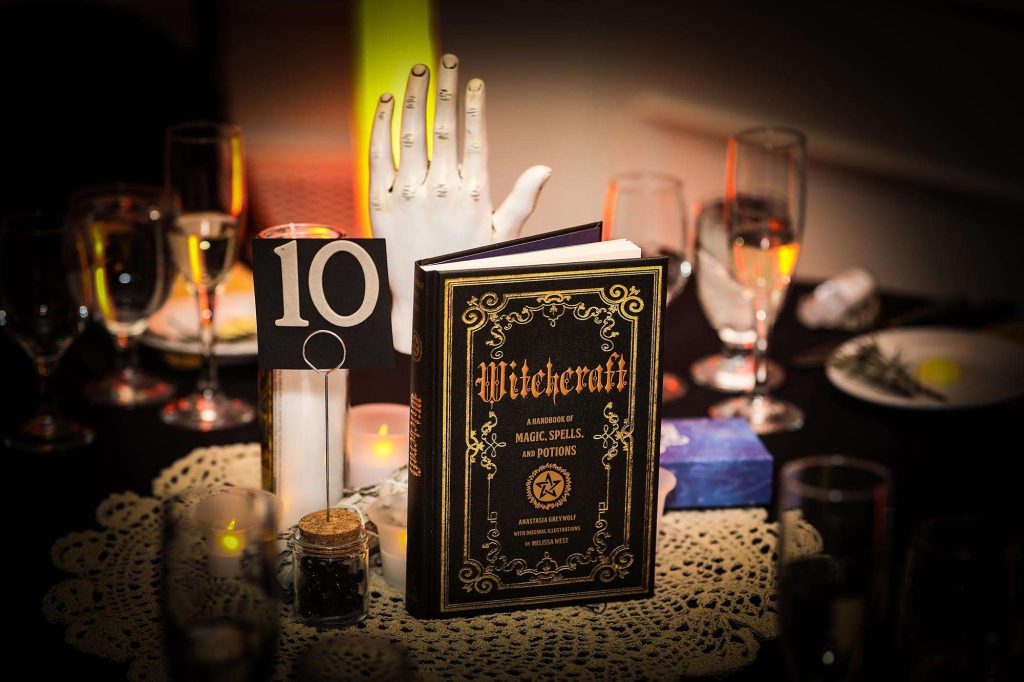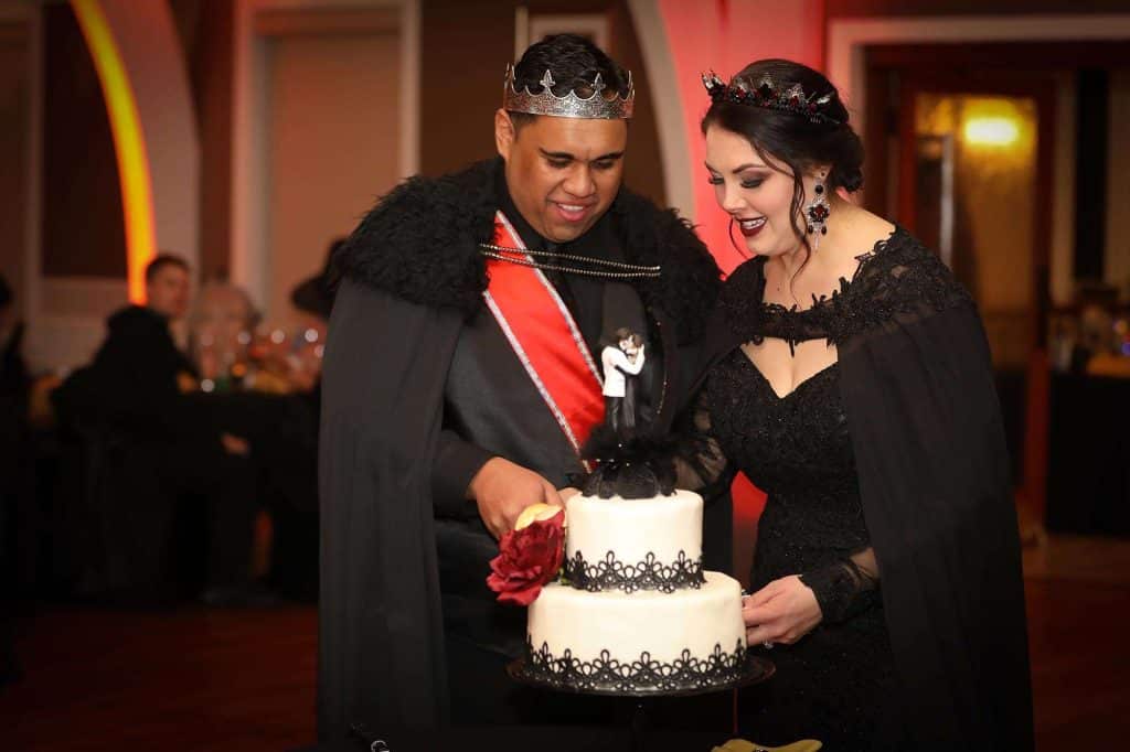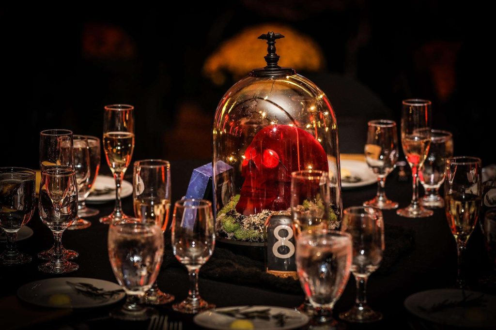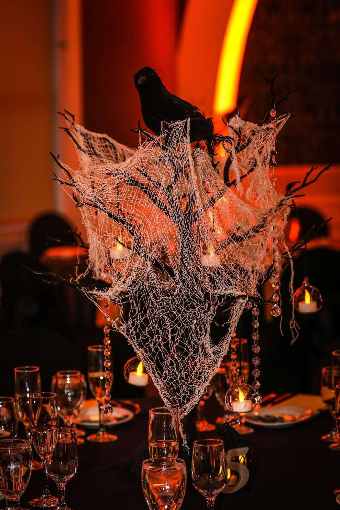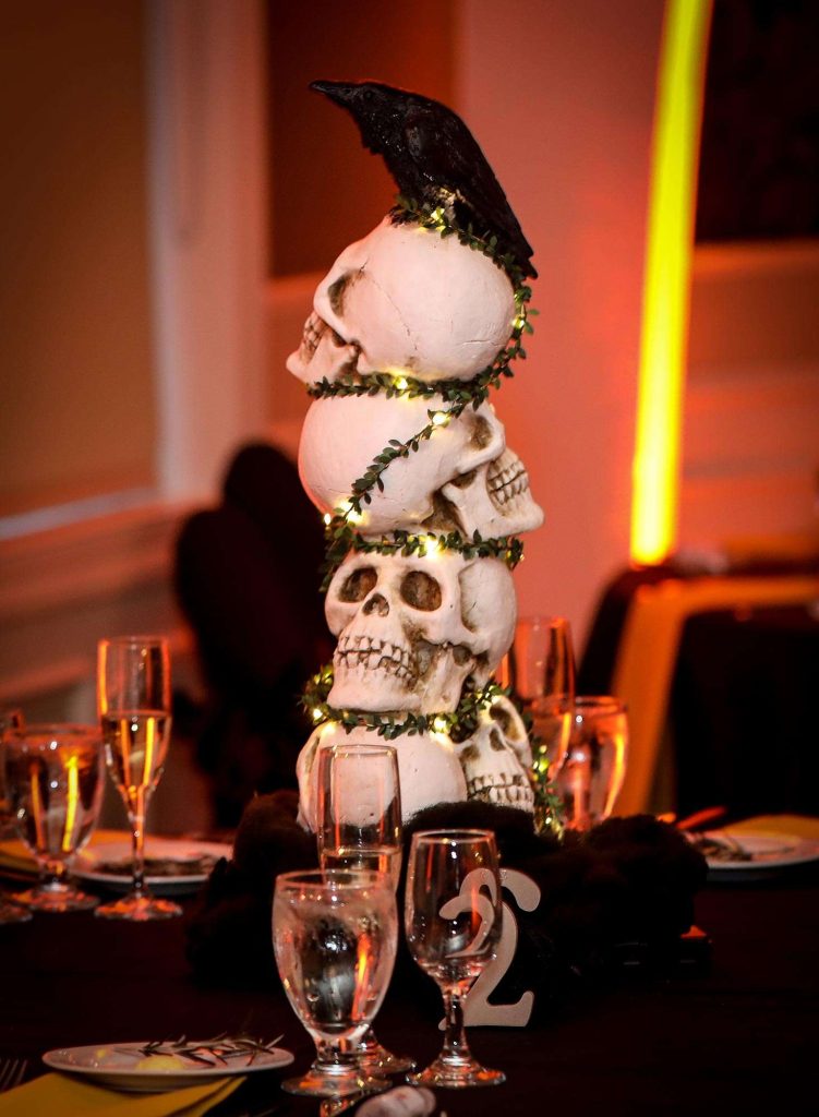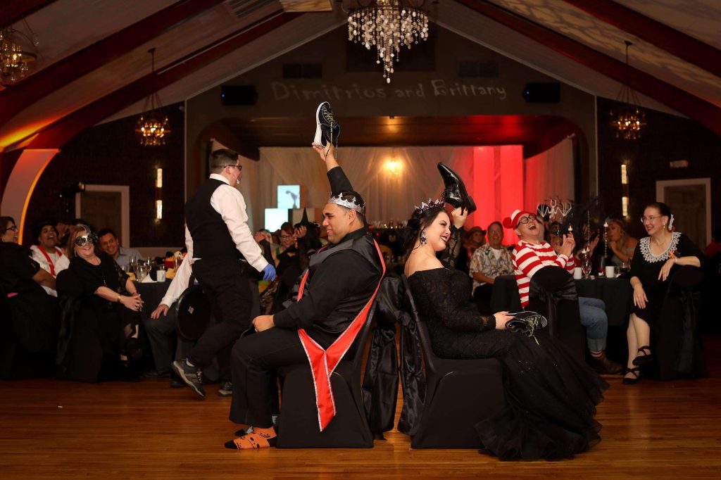 Brittany and Dimitrios dressed as King and Queen of the night, complete with capes and crowns. “Almost every guest wore a costume, and it was magnificent,” Brittany says. “We had Halloween projections on the ceilings, and on the stage we had video playing Halloween images. All of the centerpieces were handmade by us and will be used as Halloween decor for our home for years to come.” Brittany and Dimitrios also made all of the photobooth costumes, created three drink specials along with a custom bar sign, and more.