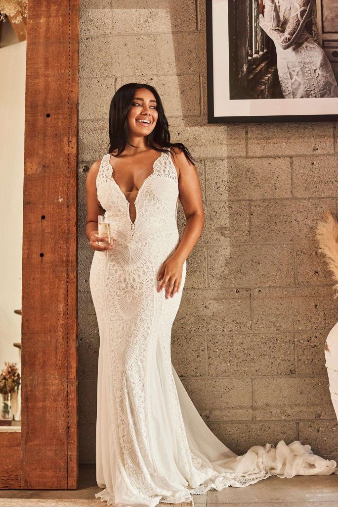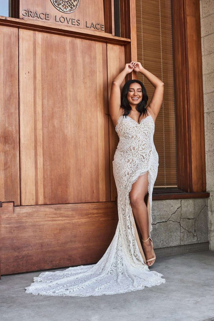 The latest collection features all new silhouettes, highly anticipated unique fabric combinations and new lace, exclusive to the Australian-made brand. True to its name, the highly visual new Mirror Lace consists of bold geometric shapes and is so intricate, it gives the illusion of beading without the discomfort and heaviness that comes with a beaded gown. Designed and developed in-house, the Mirror Lace joins the expert line-up of fabrics within the collection, including GRACE’s best-selling Crepe de Chine silk, silk chiffon, embroideries and stretch crepe.