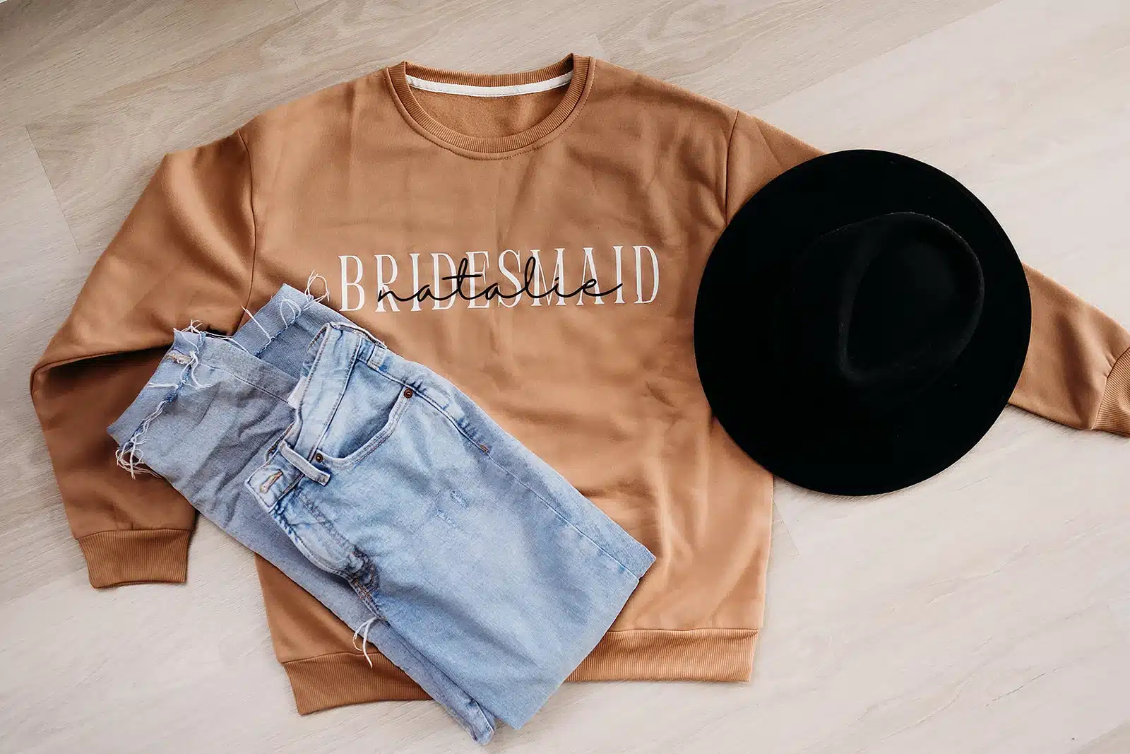 Bridesmaid proposals have become a whole event of their own, and the options are endless when it comes to creating something meaningful and fun. A cozy and practical idea is custom clothing, like a soft sweatshirt or hoodie embroidered with “Bridesmaid,” “Bride Tribe,” or their name. It’s something your friends can wear during wedding planning, bachelorette parties, or while getting ready on the big day.