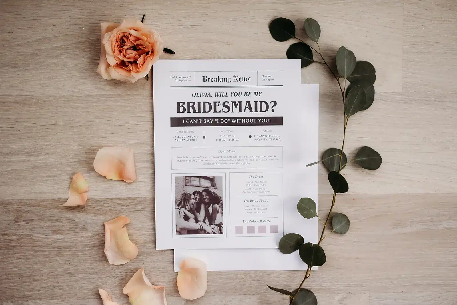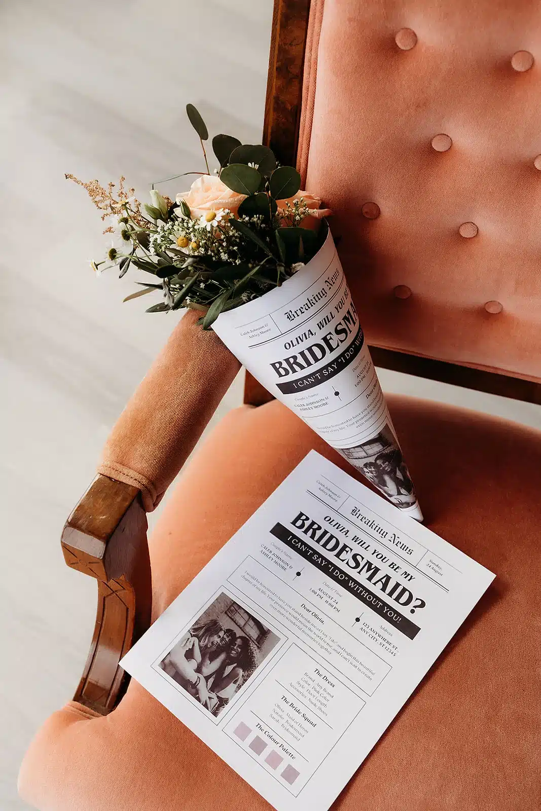 For a more creative presentation, a custom newspapers wrapped around a bouquet of flowers. The “newspaper” can feature a headline like “Extra! Extra! You’re a Bridesmaid!” along with photos, inside jokes, or wedding details printed on the page. It’s a unique and Instagram-worthy way to pop the question.