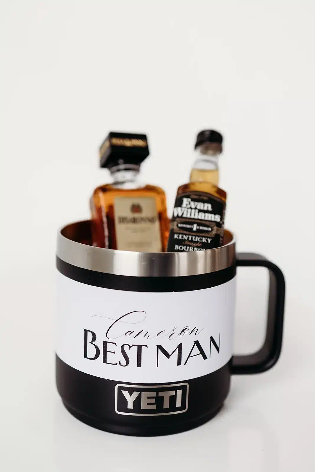 Groomsmen proposals tend to lean a little more laid-back, but that doesn’t mean they can’t be just as memorable. A classic option is a personalized YETI-style mug or tumbler, even taking the next step by engraving each groomsman’s name on it. Fill it with a few mini bottles of their favorite whiskey or bourbon, and you’ve got a gift that’s both practical and celebratory.
