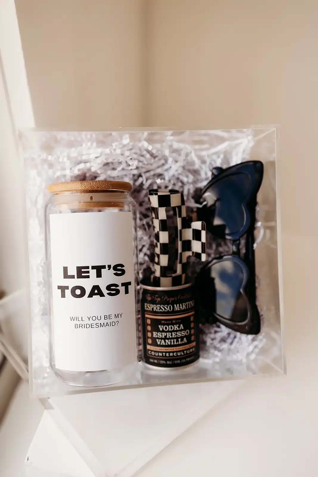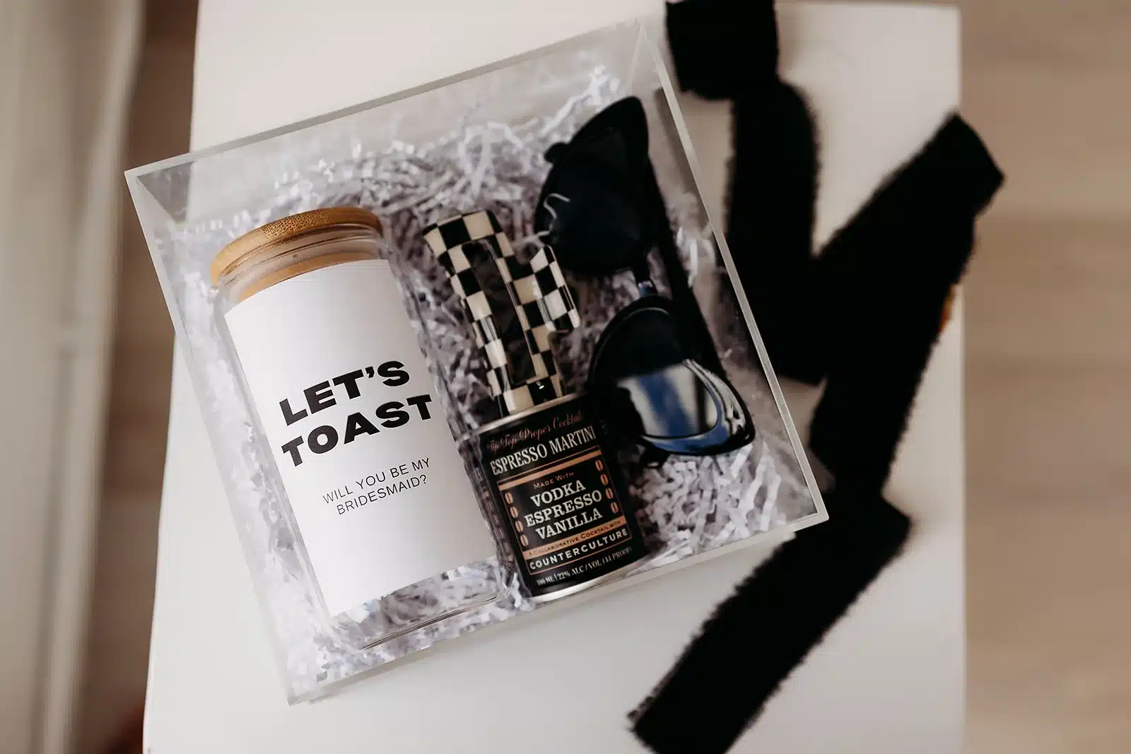 Another trending idea is a custom proposal box filled with fun little gifts. A clear acrylic box feels modern and elevated, and you can fill it with things like a mini drink, hair clip, sunglasses, and a custom champagne glass. Add their name or “Bridesmaid” on the box for a keepsake they’ll love long after the wedding.