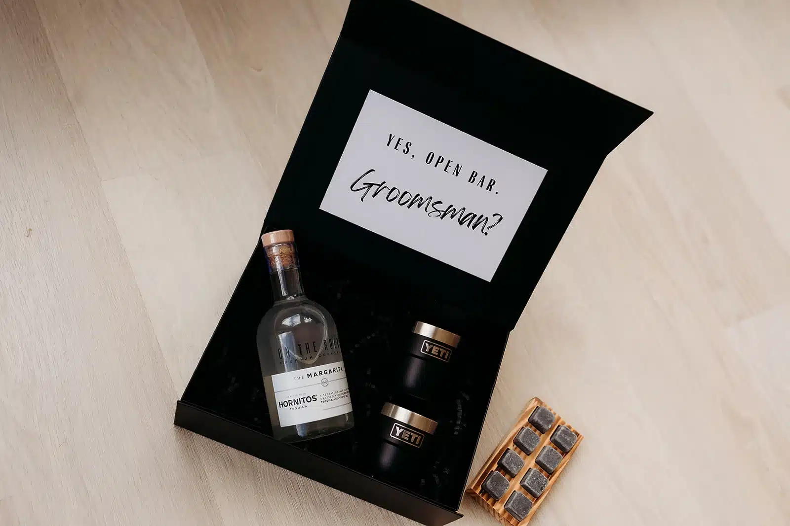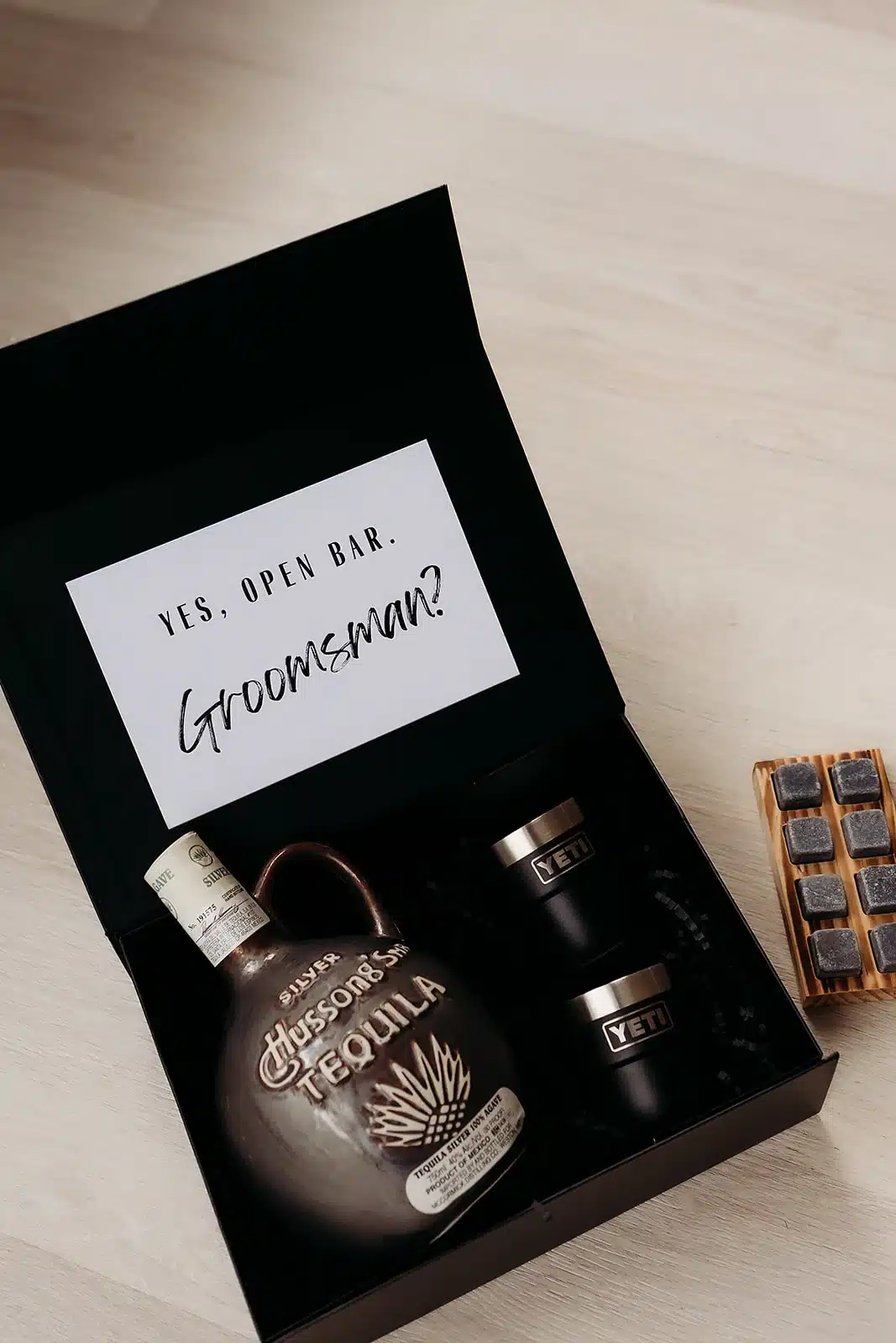 Another fun option is a custom groomsman box that plays into the celebration ahead. Boxes with sayings like “Groomsman?” or the always-popular “Yes, Open Bar?” are a playful way to ask the question. Inside, include a bottle of liquor, matching glasses, or even cigars for a celebratory vibe.