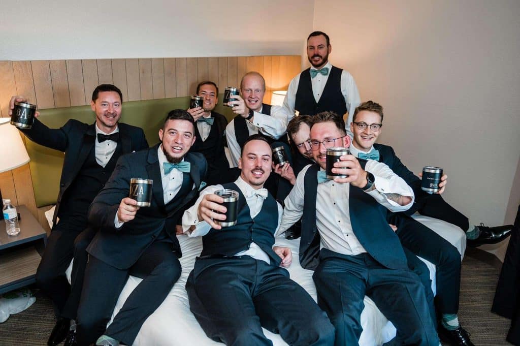 Hannah and Paul’s friends were in town visiting and helped Paul plan the perfect engagement. One evening after dinner, everyone went to Veterans Park at sunset for an “impromptu” photo shoot. In the middle of taking pictures, Paul got down on his knee and proposed to Hannah. Afterward, he surprised her yet again with an engagement party with all of their friends waiting for them.