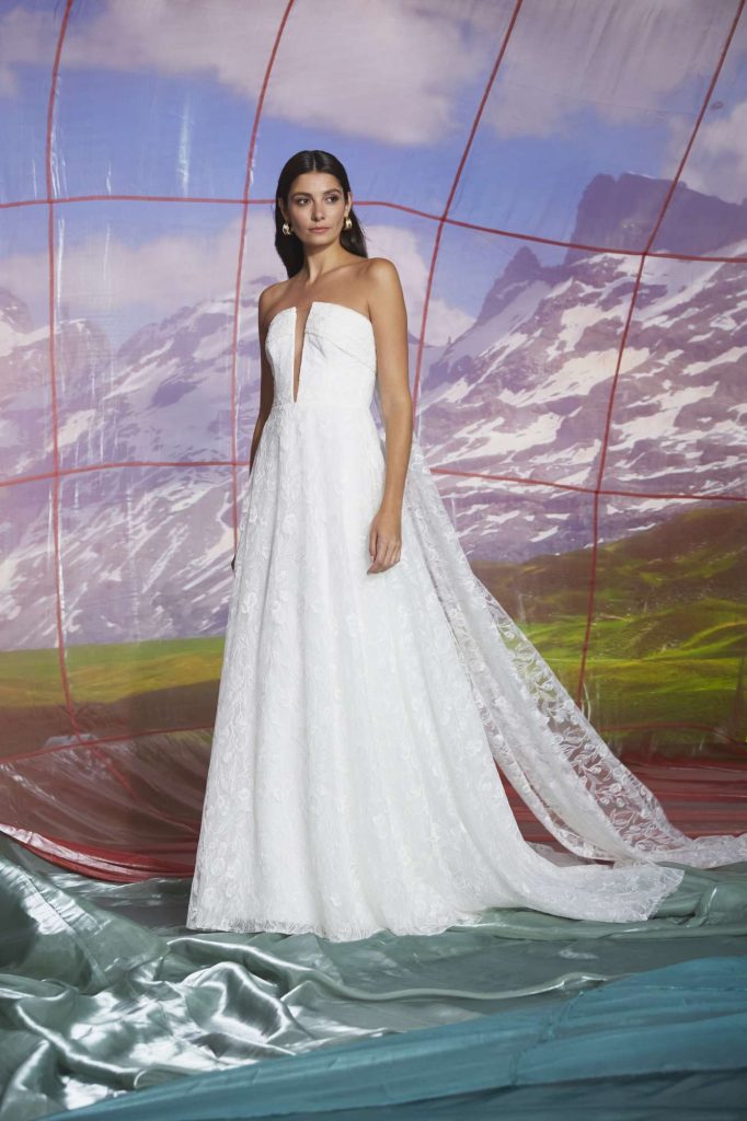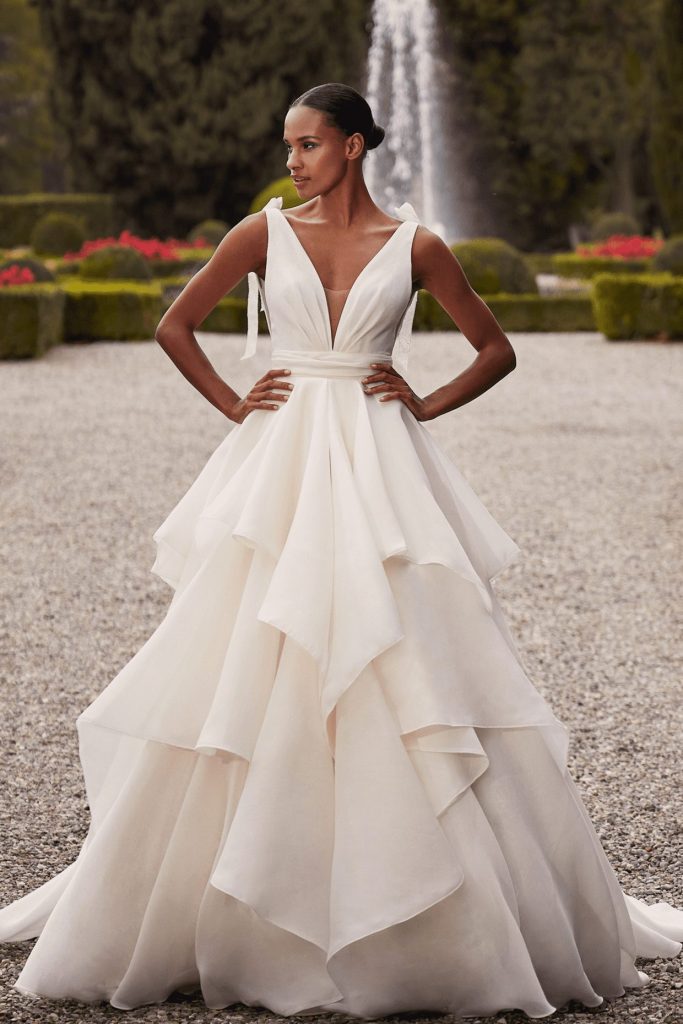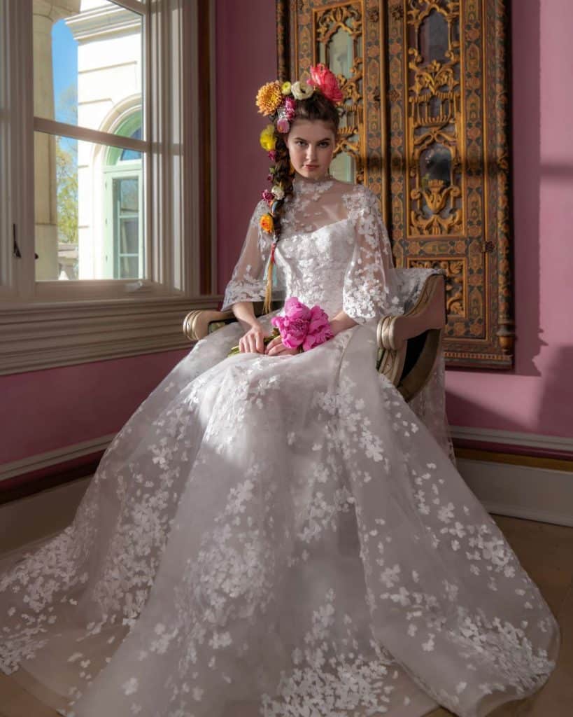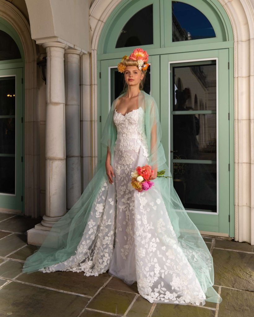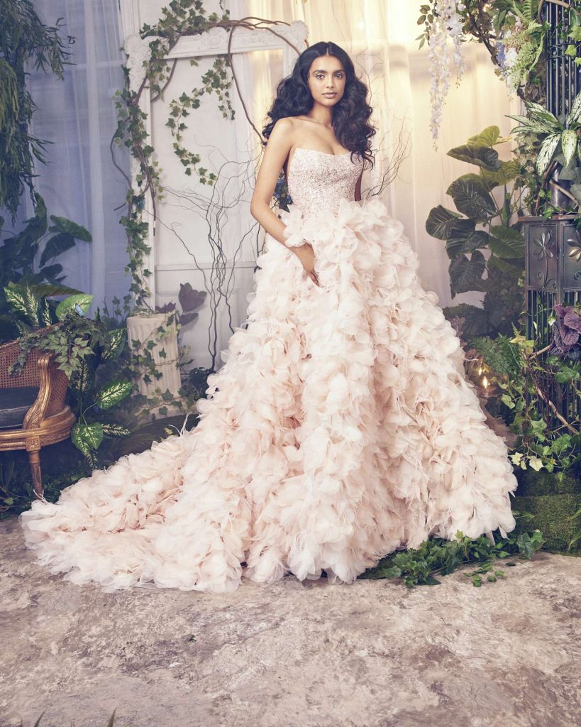 The Fall 2023, Kelly Faetanini Bridal Collection continues to focus on the unending potential of a custom gown and allowing each bride to have a unique and individual look. The inspiration is found in the character of Carrie Bradshaw and her fearless and timeless fashion choices. This collection continues to present brides with options for exactly how styled, dramatic, and fashion-forward they want to be with detachable trains, oversized bows, and optional sleeves. There are fun draping techniques that create exaggerated accents that are playful and feminine. There also is some Carrie-worthy texture and color, including black, blush, and feathers.