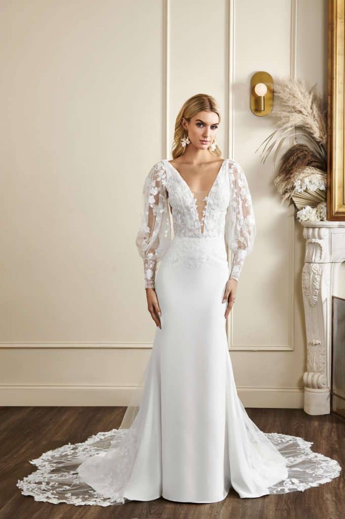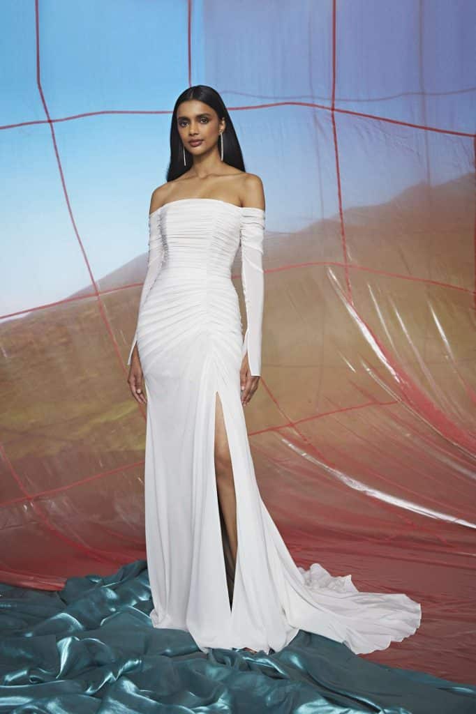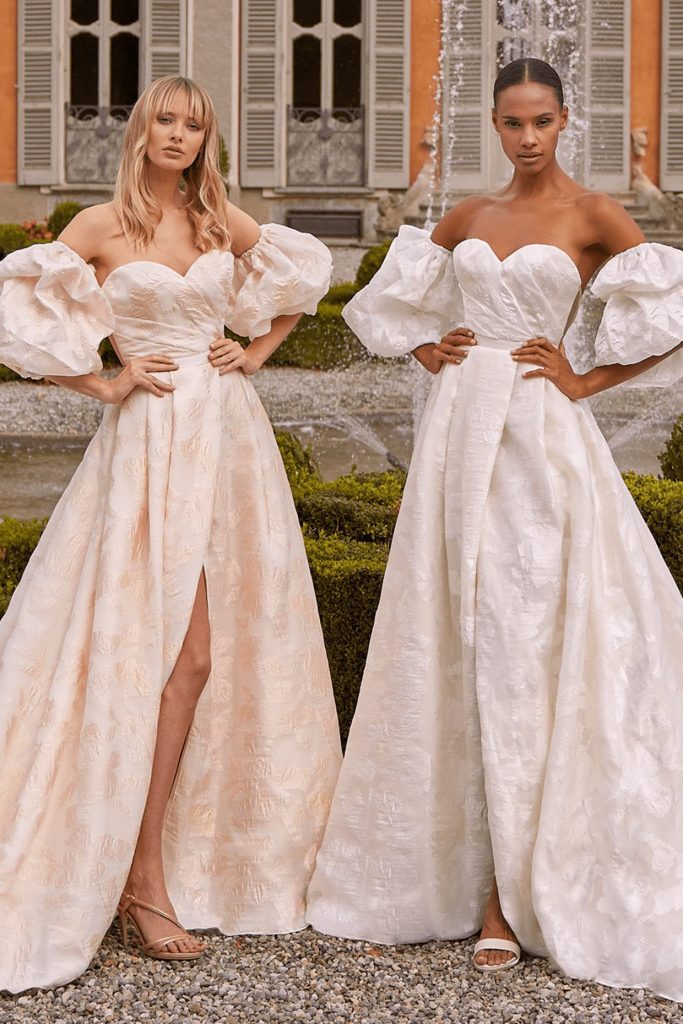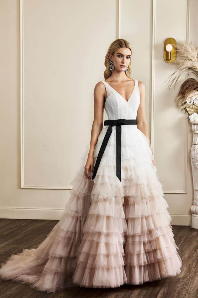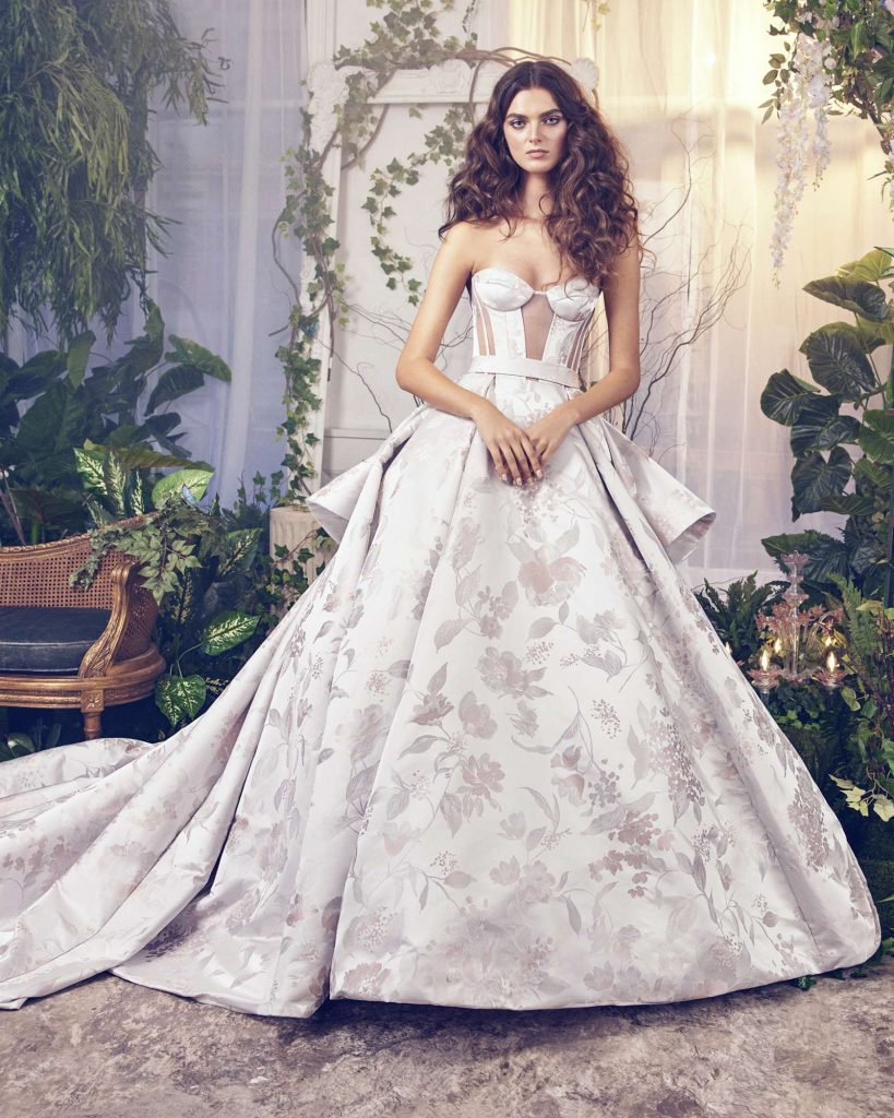 The Fall 2023, Kelly Faetanini Bridal Collection continues to focus on the unending potential of a custom gown and allowing each bride to have a unique and individual look. The inspiration is found in the character of Carrie Bradshaw and her fearless and timeless fashion choices. This collection continues to present brides with options for exactly how styled, dramatic, and fashion-forward they want to be with detachable trains, oversized bows, and optional sleeves. There are fun draping techniques that create exaggerated accents that are playful and feminine. There also is some Carrie-worthy texture and color, including black, blush, and feathers.
