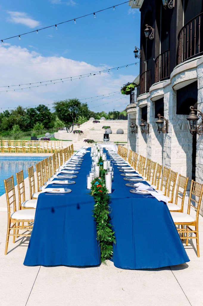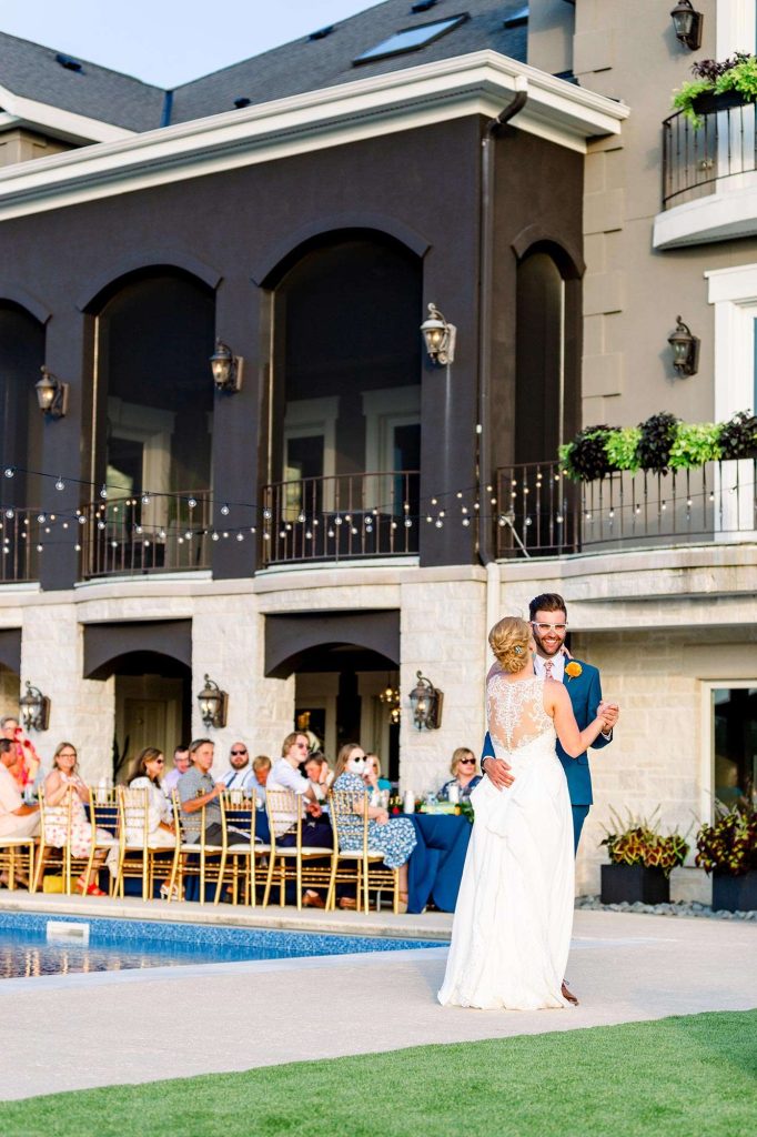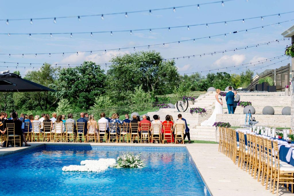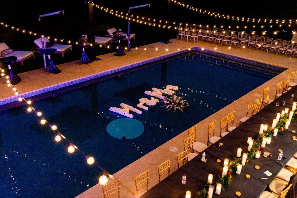 To help bring the backyard wedding day together, Grace’s stepmom turned to Oscar Sanchez from Ambrosia Events. “Oscar helped with everything from the start of the planning to the day-after clean up. He was great.” Ambrosia Events also provided linens, chairs, and decor such as greenery and floating flowers in the pool.
