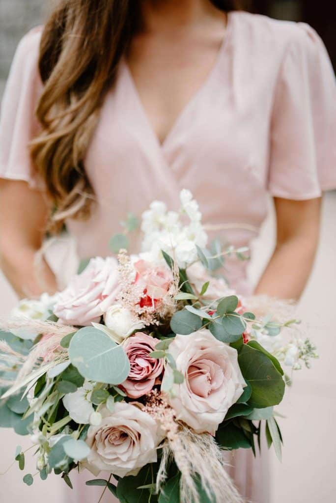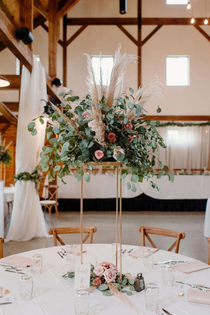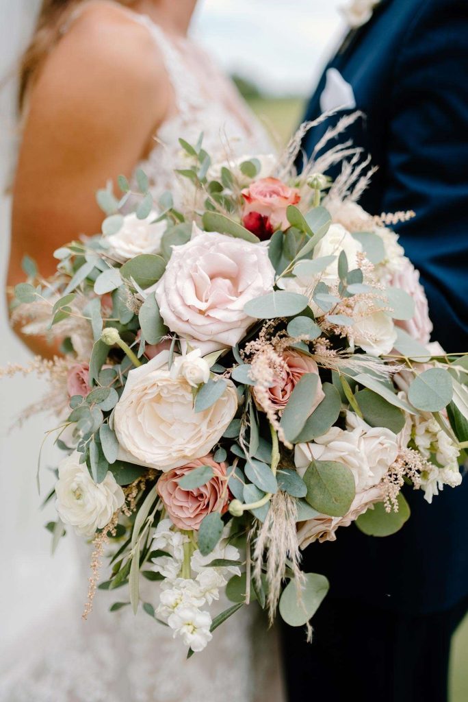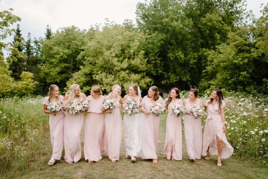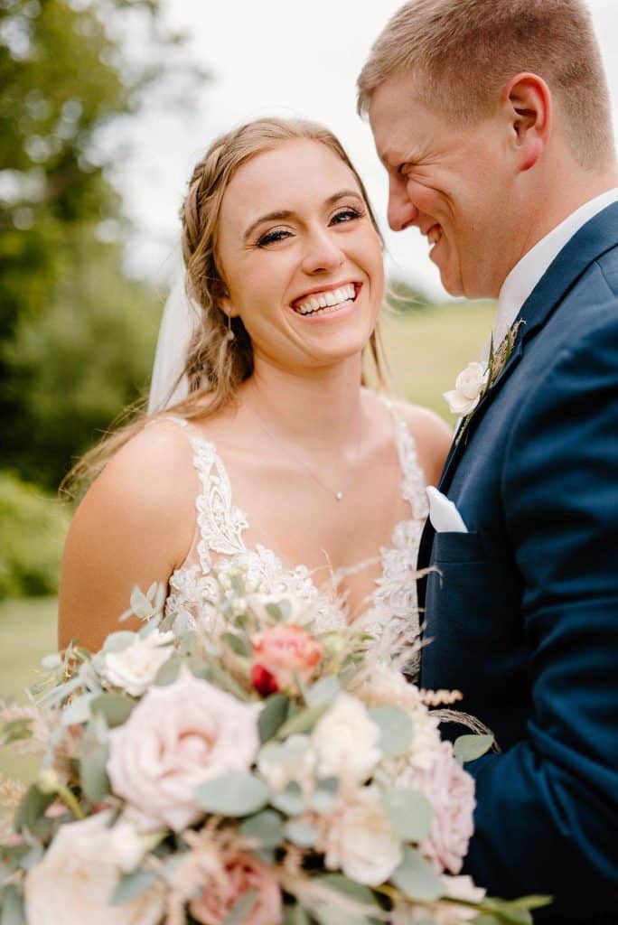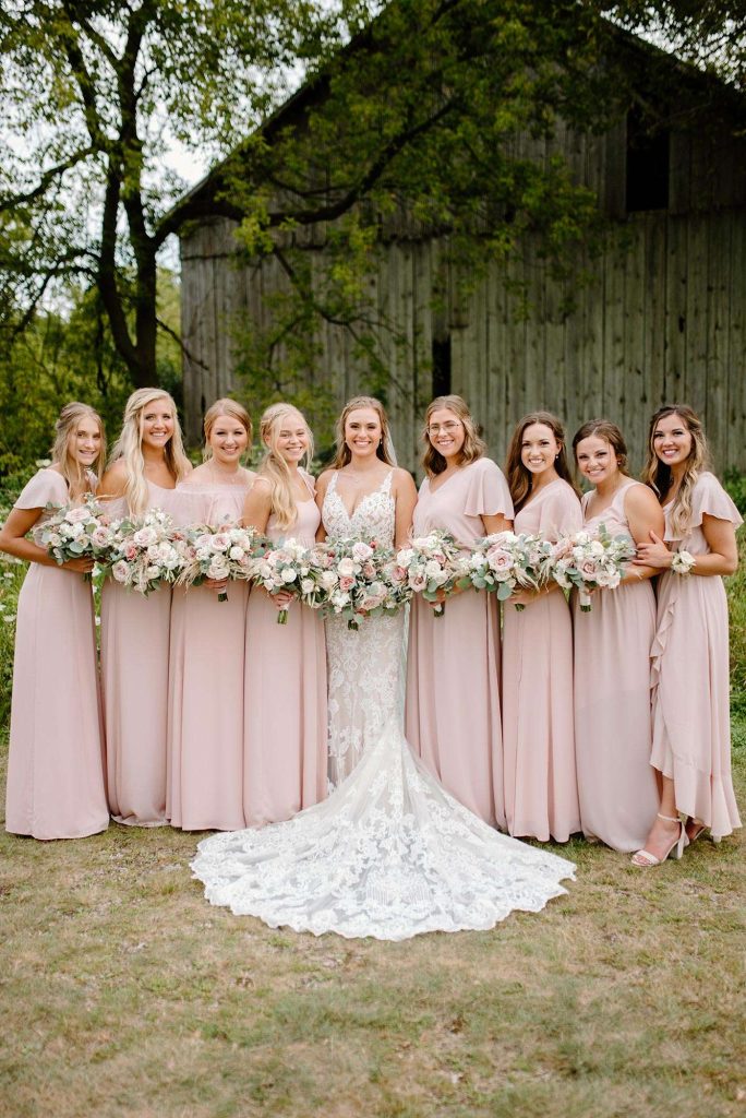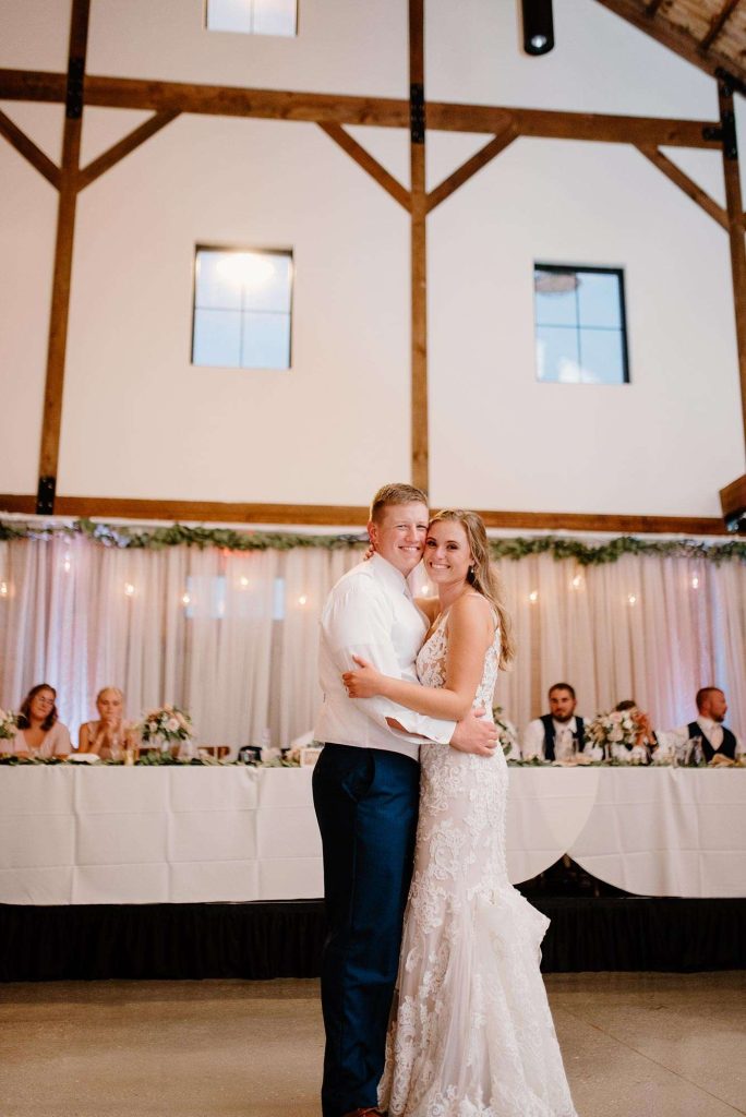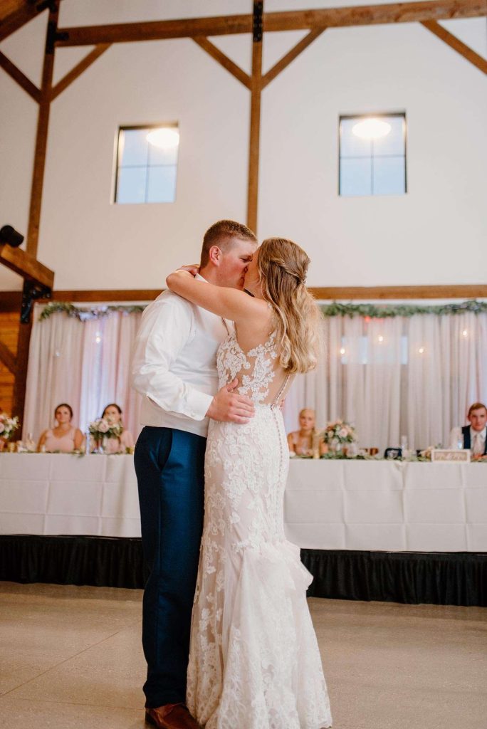Hailey and Adam planned an August wedding with a church ceremony and reception at The Barn at The Bog. The bridesmaids wore blush, and the floral color scheme was blush, dusty rose, white, greenery, and pampas grass. Hailey found her Morilee by Madeline Gardner gown at Bliss Bridal in Brookfield, WI. The overall theme: rustic boho.