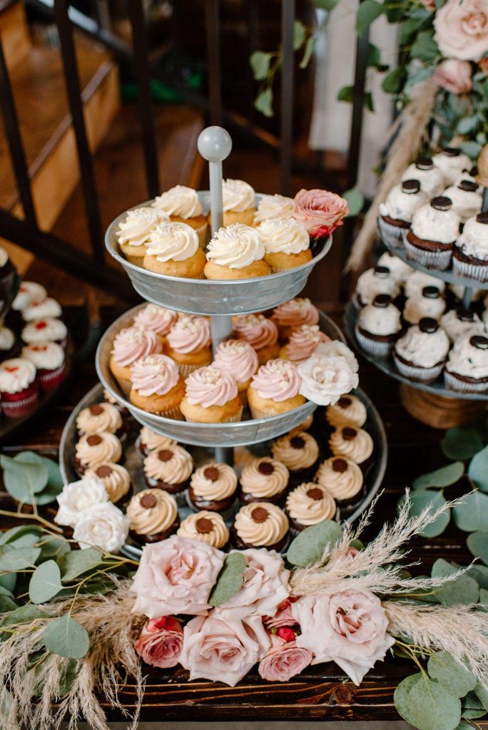 Dinner was also catered by The Bog. There was a plated choice of beef tenderloin, pecan-crusted chicken, or cheese ravioli. For dessert, there were assorted cupcakes for guests, as well as a chocolate cake with cookies-and-cream buttercream and chocolate ganache for the head table, which the bride and groom ceremoniously cut. There was also a campfire with s’mores to roast.