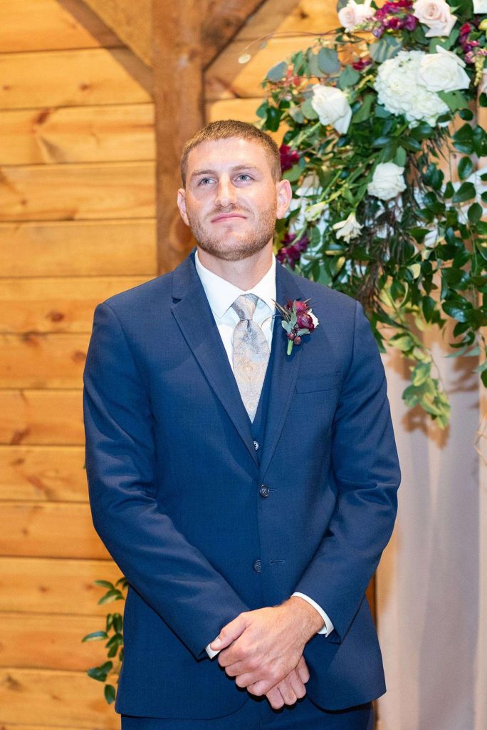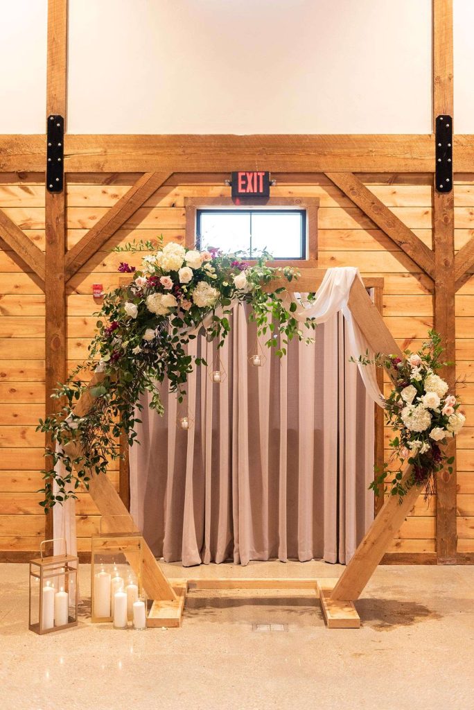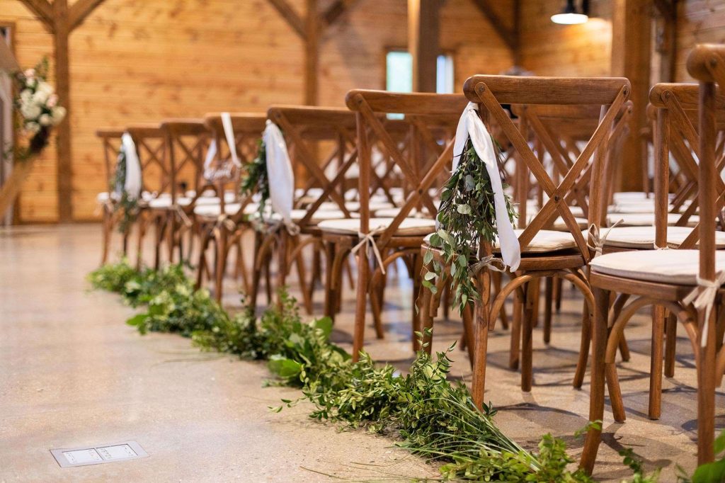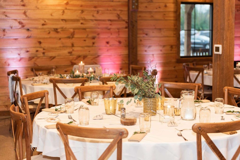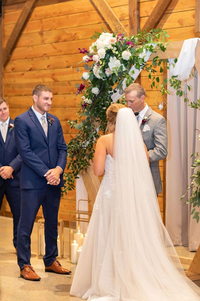 The bride and groom planned an organic-inspired wedding at the Barn at the Bog with neutral tones and a lot of greenery. “We both like very plain and simple things, so we aimed for a more simplistic, less-is-more approach. We used more loose greens and simple candle vases instead of having large centerpieces. We also incorporated geometric shapes throughout the wedding decor.”