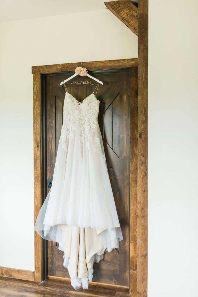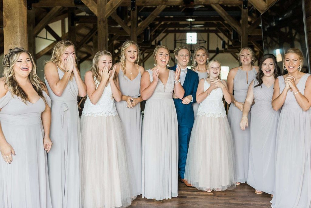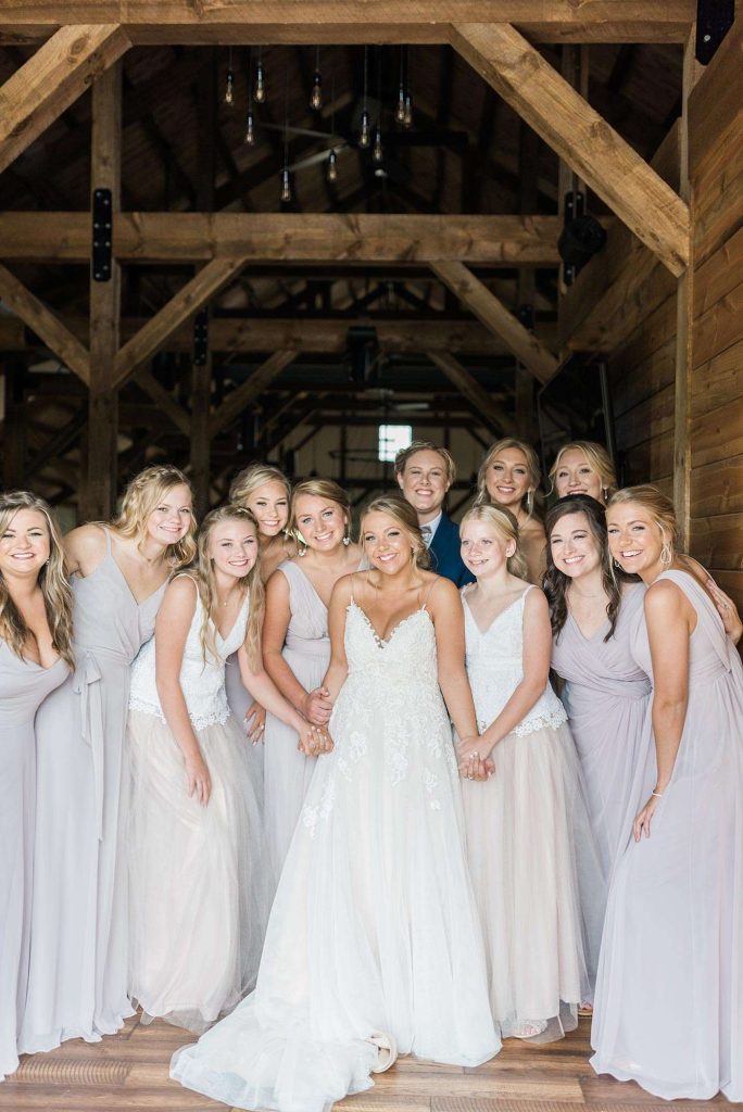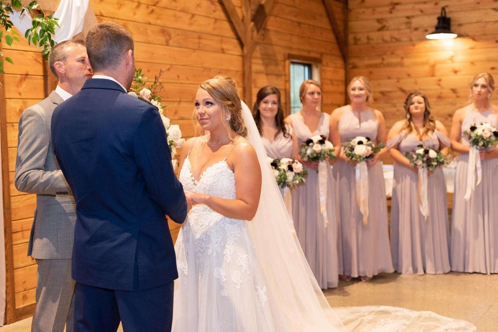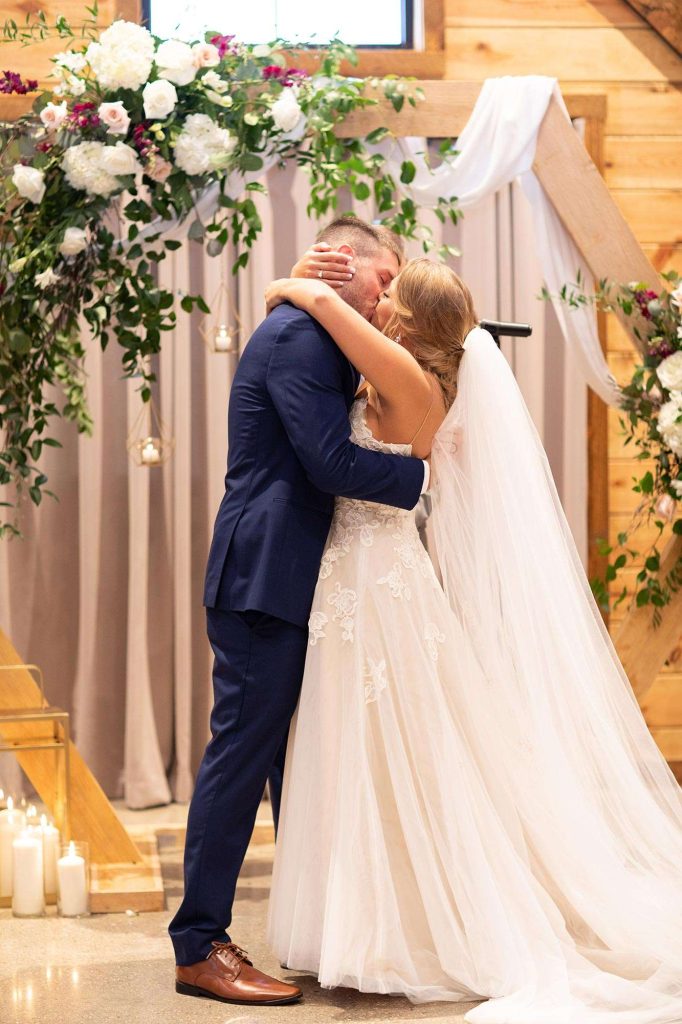 Haley’s TiAdora dress, which she found at Miss Ruby Bridal Boutique, matched the softness they were going for throughout their wedding. “My dress was champagne with ivory tulle over the top,” she says. Ivory was also incorporated throughout the ceremony — on ribbons for flower bouquets, ribbons lining the aisles, and fabric on their ceremony arch. The bridesmaids dressed in taupe and the groomsmen donned navy suits with taupe ties.