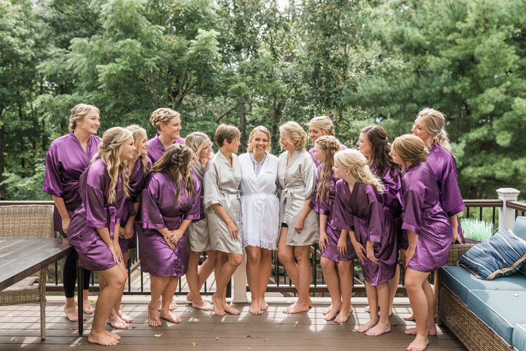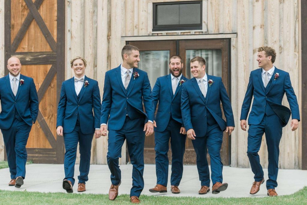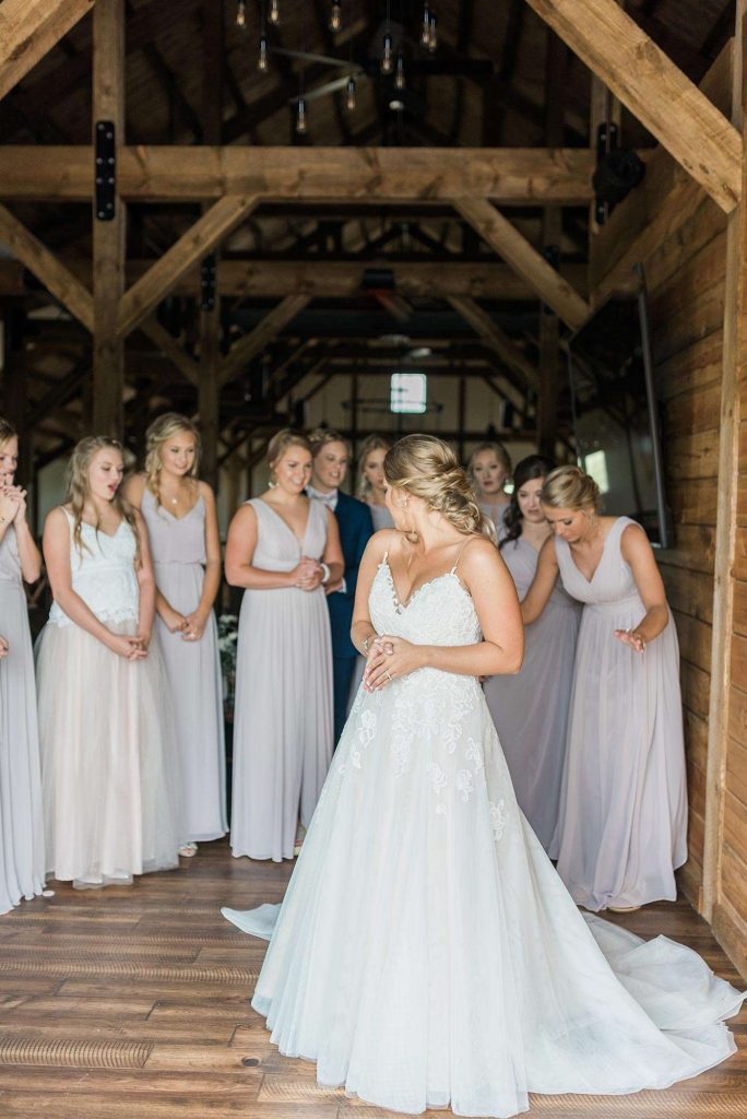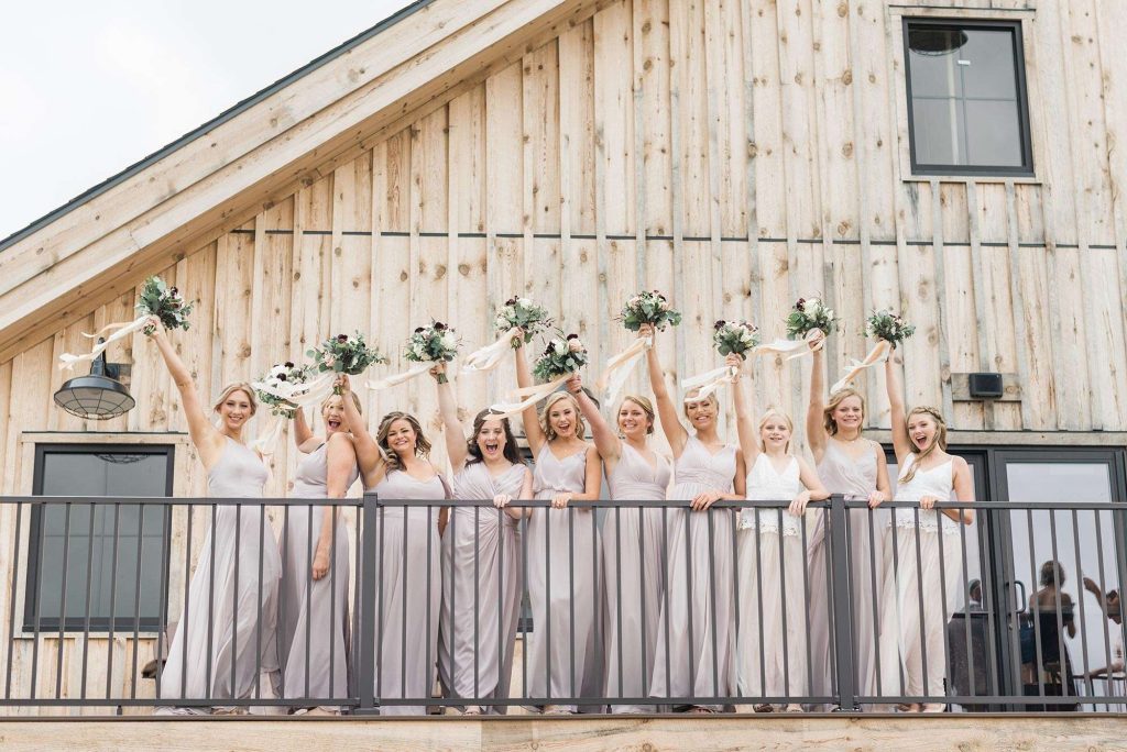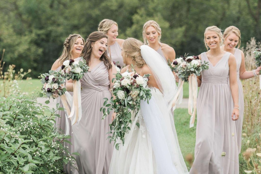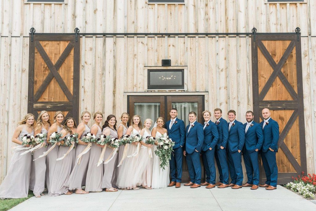 Haley’s TiAdora dress, which she found at Miss Ruby Bridal Boutique, matched the softness they were going for throughout their wedding. “My dress was champagne with ivory tulle over the top,” she says. Ivory was also incorporated throughout the ceremony — on ribbons for flower bouquets, ribbons lining the aisles, and fabric on their ceremony arch. The bridesmaids dressed in taupe and the groomsmen donned navy suits with taupe ties.