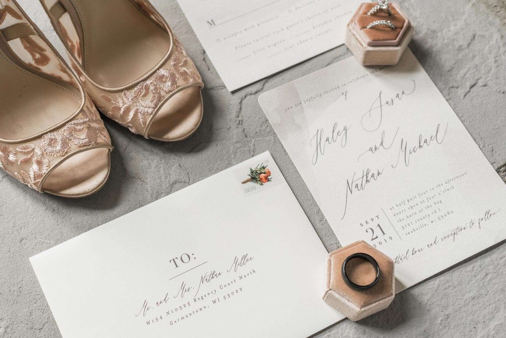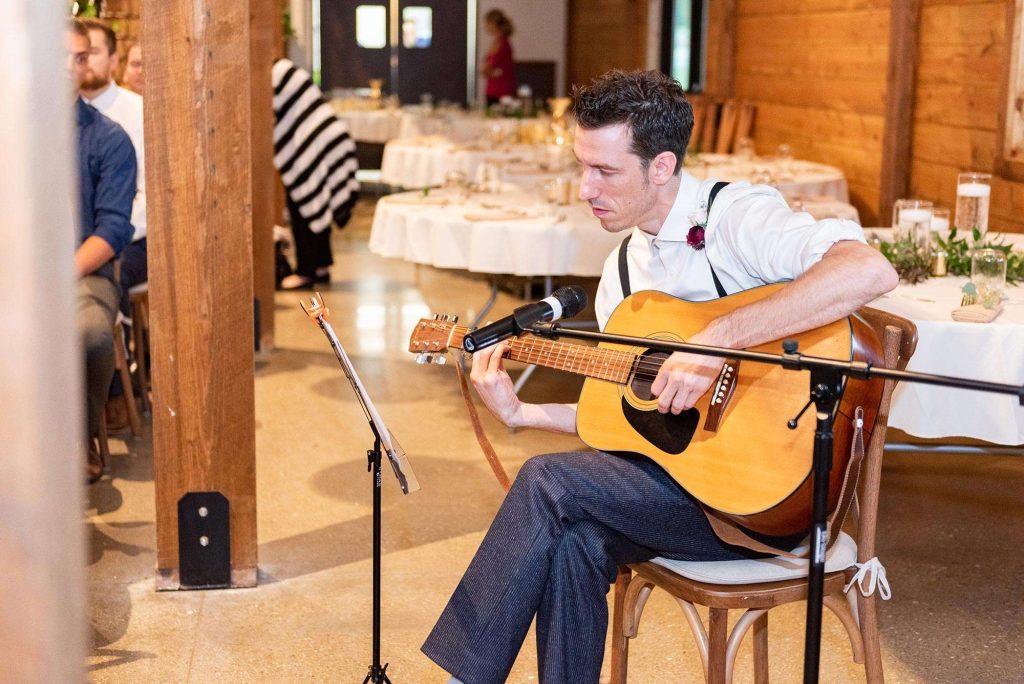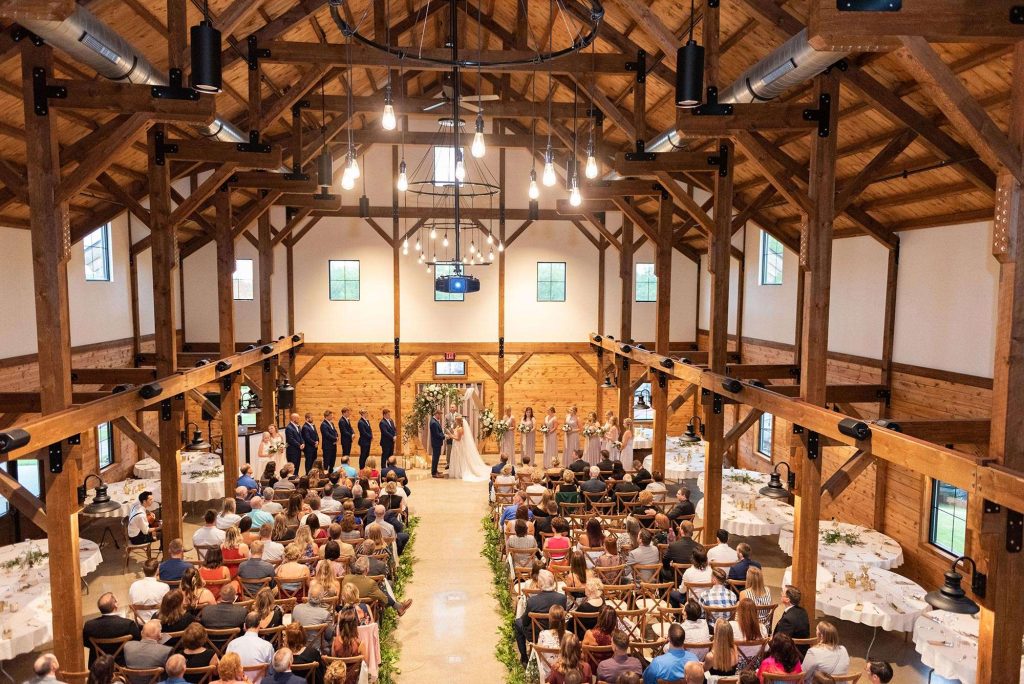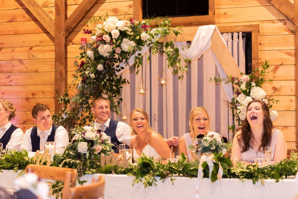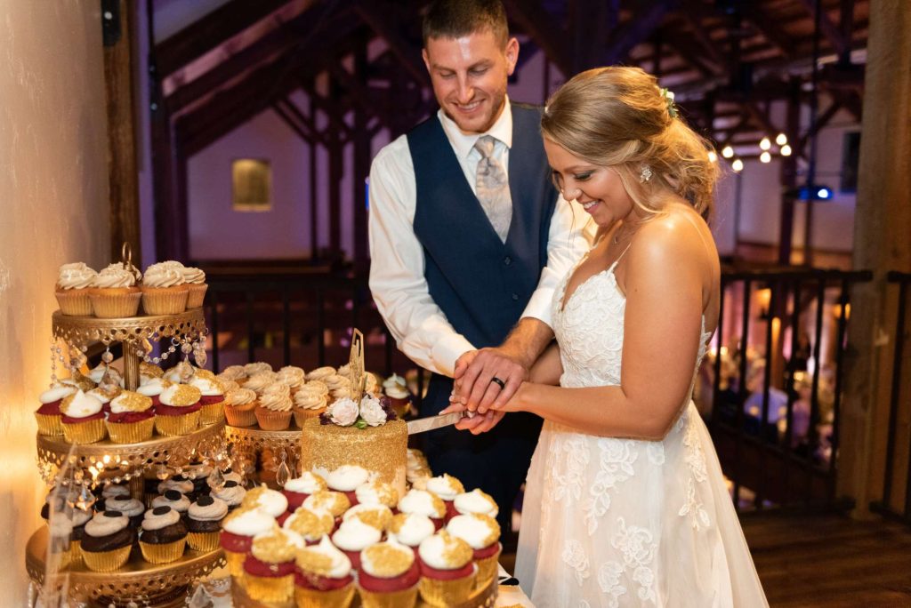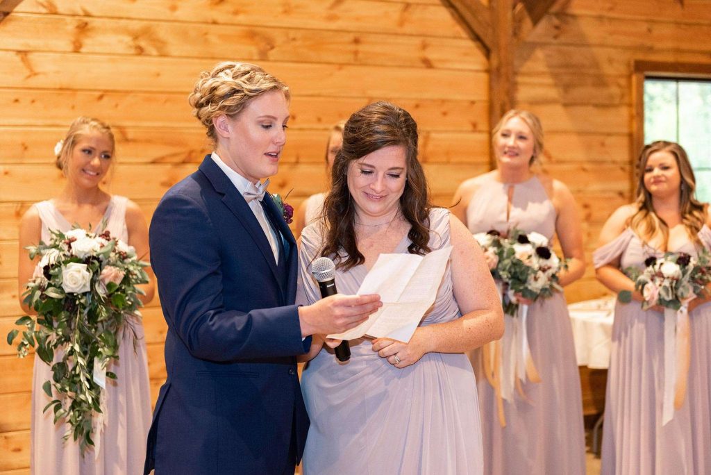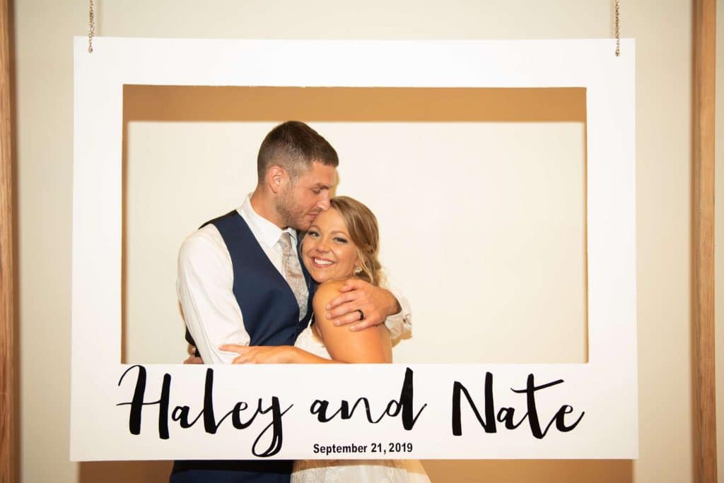 Nate and Haley’s ceremony, held at the Barn at the Bog, was so full of personal touches, it’s hard for them to pick a single favorite one. Haley’s uncle officiated the wedding, while another uncle played the guitar and sang. Their ceremony arch was home-built by Nate and his dad. Family members shared readings of their choice: Nate’s sister read a poem and Haley’s aunt chose a reading shared at her own wedding. “We wrote and shared our own vows, too.”