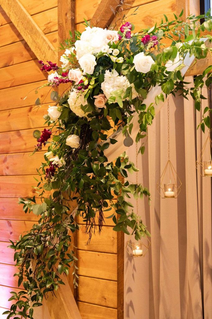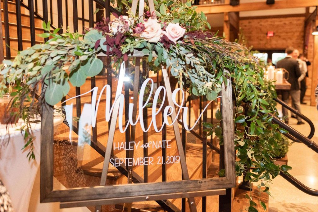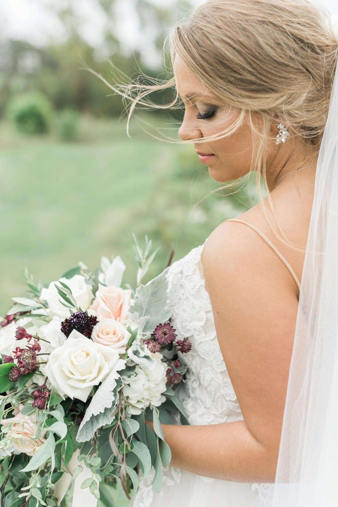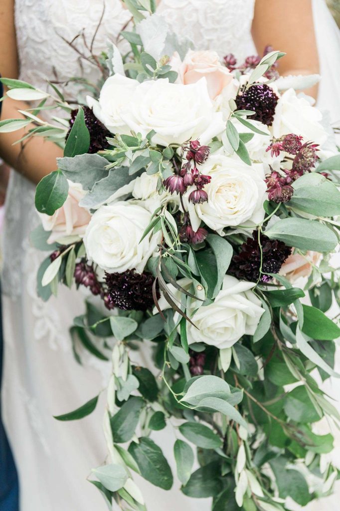 The arrangements were mostly greens with blooms in shades of white and cream with pops of plum- and wine-colored flowers. Nate and Haley worked with Bank of Flowers for all their arrangements. “We can’t recommend them highly enough. They went above and beyond!” Haley says owner Melissa was especially helpful: “I wanted bouquets that had a lot of texture and dimension. I showed Melissa pictures of what I liked and described things I wanted to change, as well as my overall vision for the wedding. Our arch pieces looked outstanding and I audibly gasped when I saw my gorgeous bouquet.