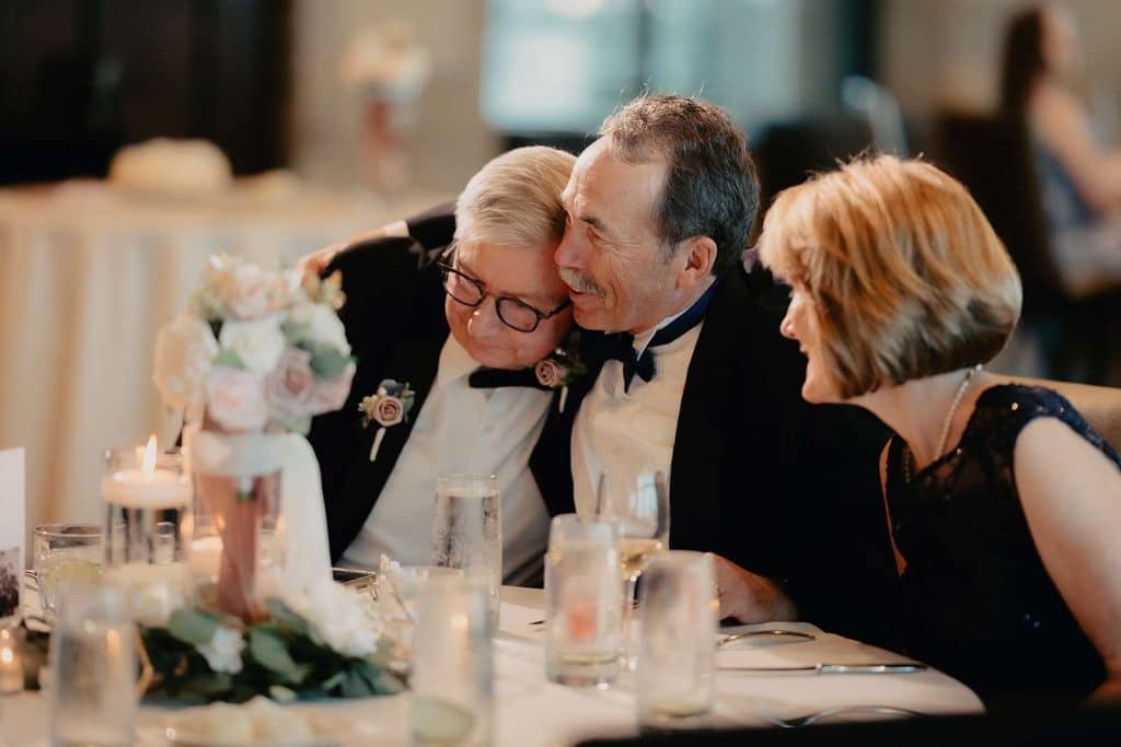 “There were a few things that made our reception extra special to us. In lieu of a generations dance, we had all of our guests sit after our first dances and then all married couples stood up to start. The DJ had couples kiss and sit down after calling out certain increments of years of marriage. After 53 years, we had two couples left and everyone counted up year by year until 61 years – where both couples kissed as sat! It was such a coincidence that Drew’s grandparents (the Millers) and my aunt and uncle (the Jacobs) have each been married for 61 years! We then surprised each couple with a bouquet of roses and then invited all couples to the dance floor to honor their love.