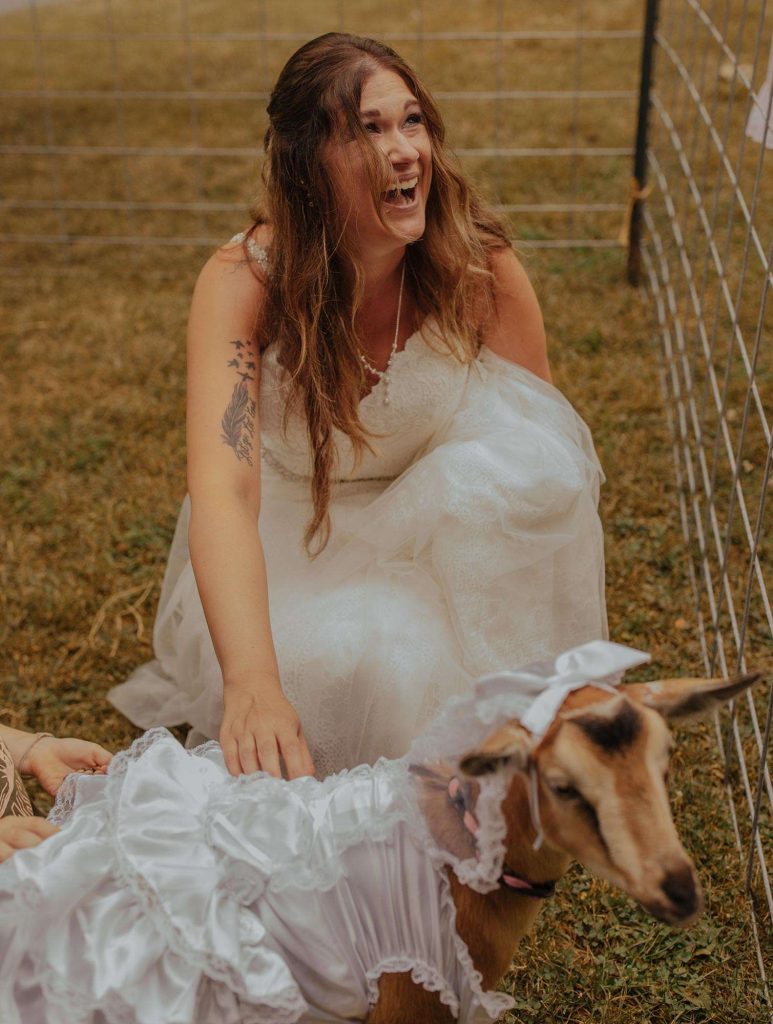 “We had 10 goats on site for two hours for people to pet and take pictures with! It was awesome! We also had a photo booth and cornhole boards for people to sign as our guest book.” To prompt folks to sign the boards? A funny “Please sign our cornholes” sign.