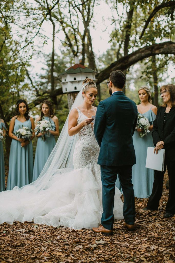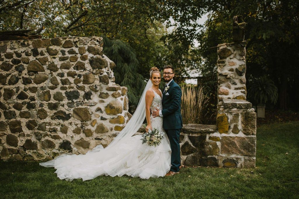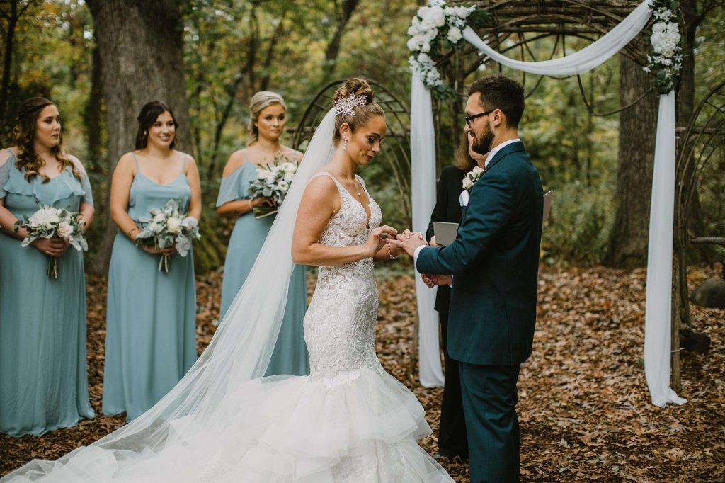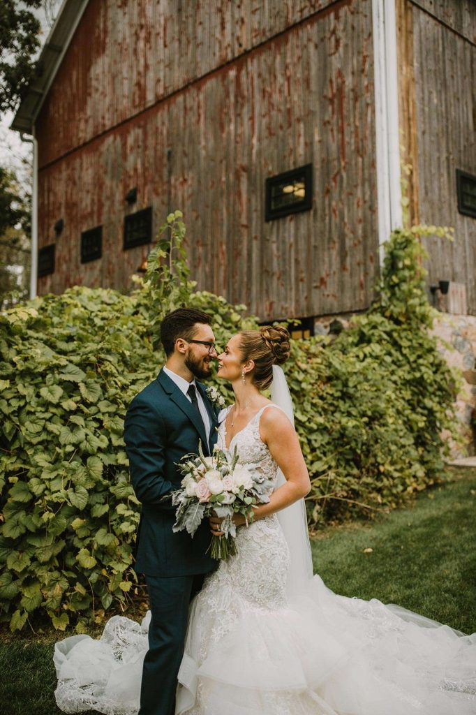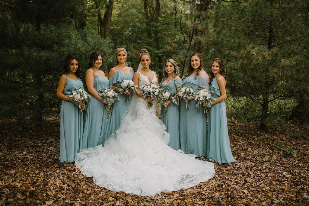 The two planned an October wedding with a rustic farmhouse vibe at The Farm at Dover in Kansasville, Wisconsin. Jessica found her dress at Bella Bianca’s. They went with a color scheme of dusty and navy blue. Due to COVID, some of the bridesmaids’ dresses were backordered and postponed to ship after the wedding. “Some of the girls ended up in dresses they didn’t choose, but they were all so awesome about it with no complaints!”