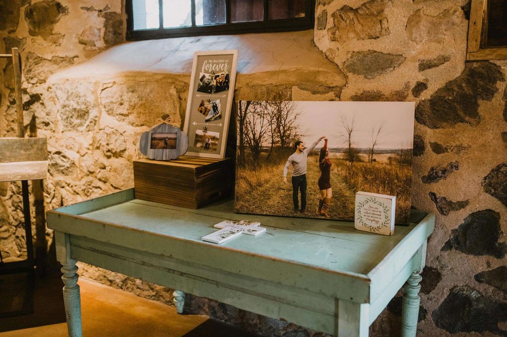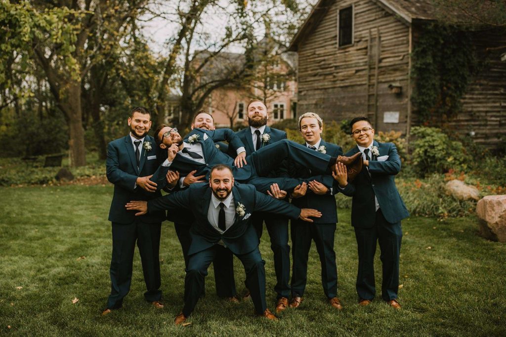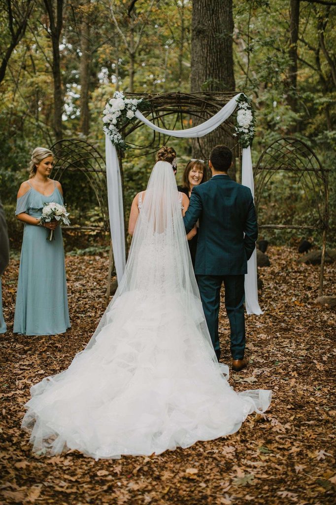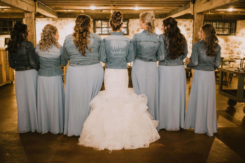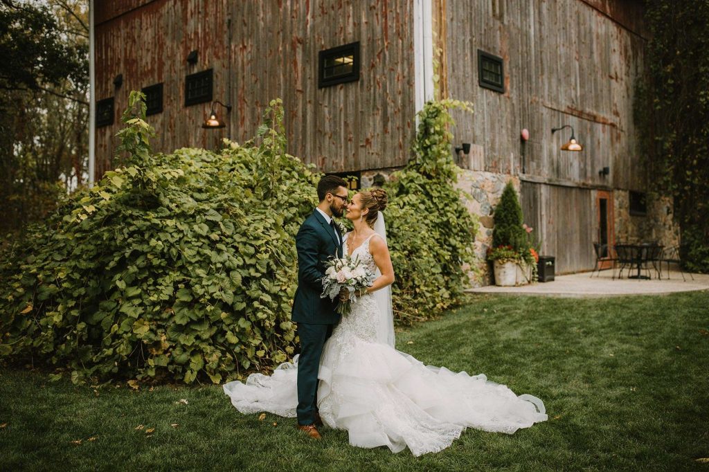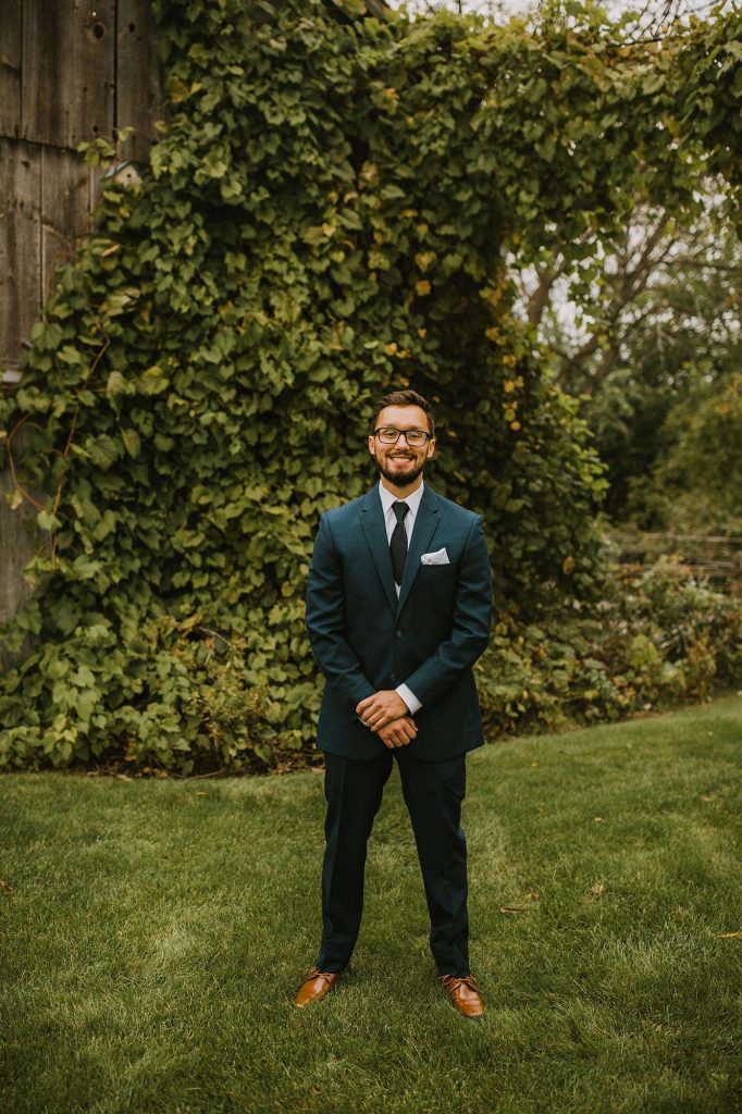The two planned an October wedding with a rustic farmhouse vibe at The Farm at Dover in Kansasville, Wisconsin. Jessica found her dress at Bella Bianca’s. They went with a color scheme of dusty and navy blue. Due to COVID, some of the bridesmaids’ dresses were backordered and postponed to ship after the wedding. “Some of the girls ended up in dresses they didn’t choose, but they were all so awesome about it with no complaints!”