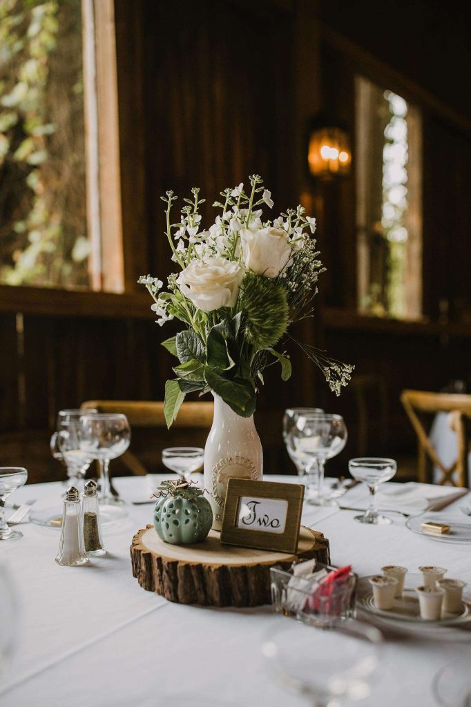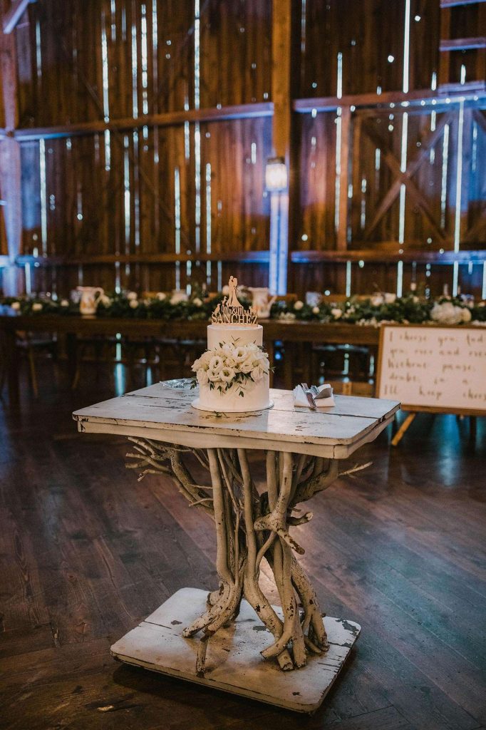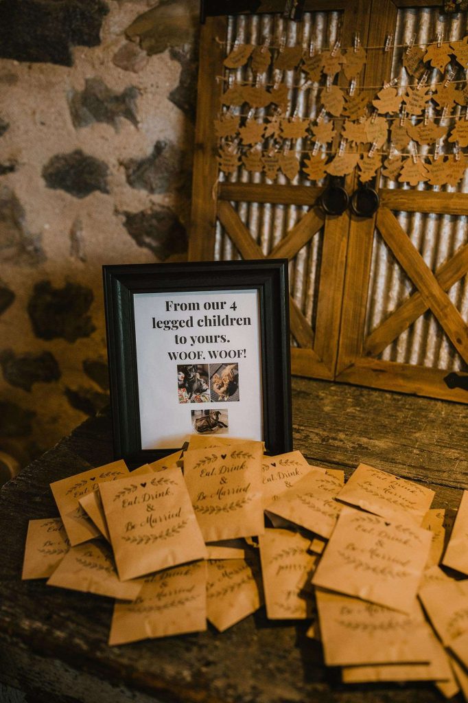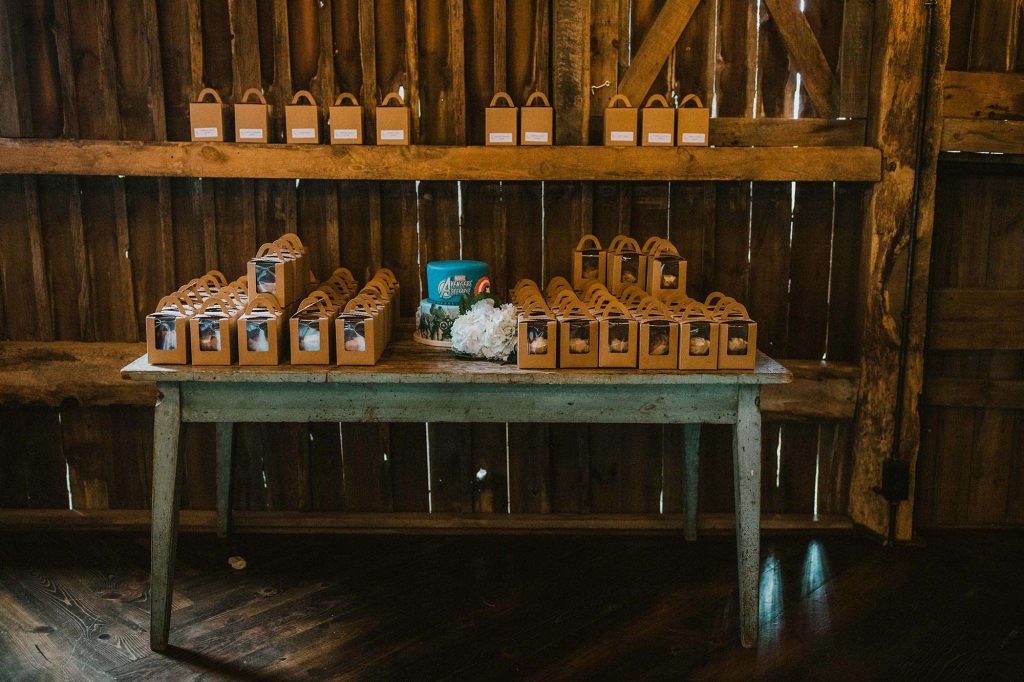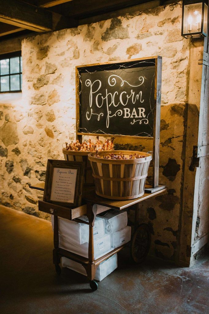 Dinner was catered by Chef Jacks. “Food was scrumptious! Drinks were endless. Desserts were cupcakes individually boxed—our idea, because of Covid.” To set the scene, Justin and Jessica added some DIY touches through the popcorn cart, signage, centerpieces, and guest favors.
