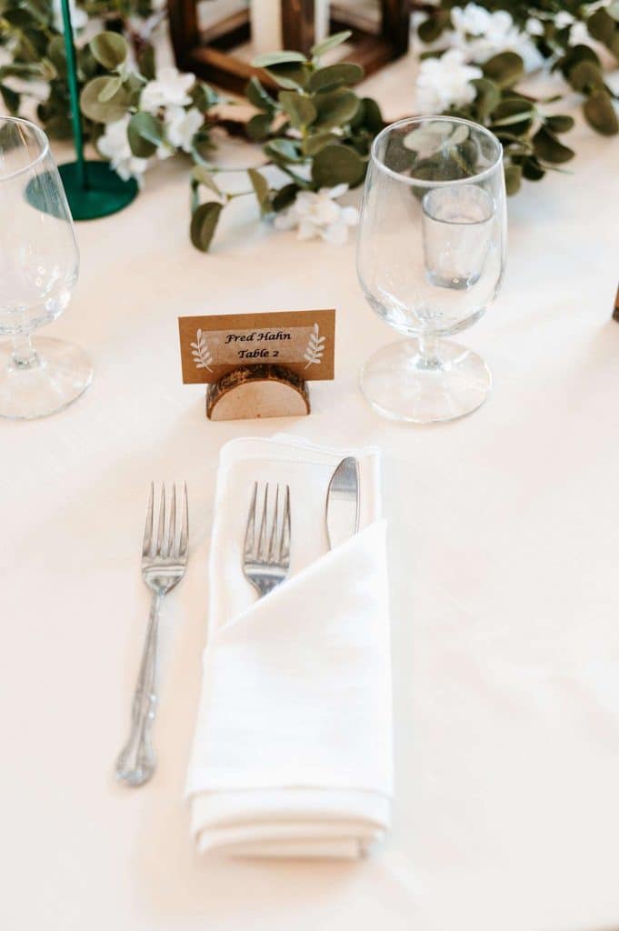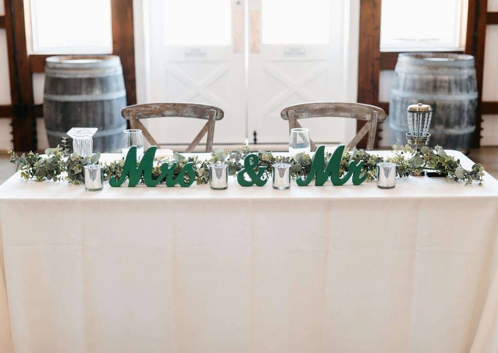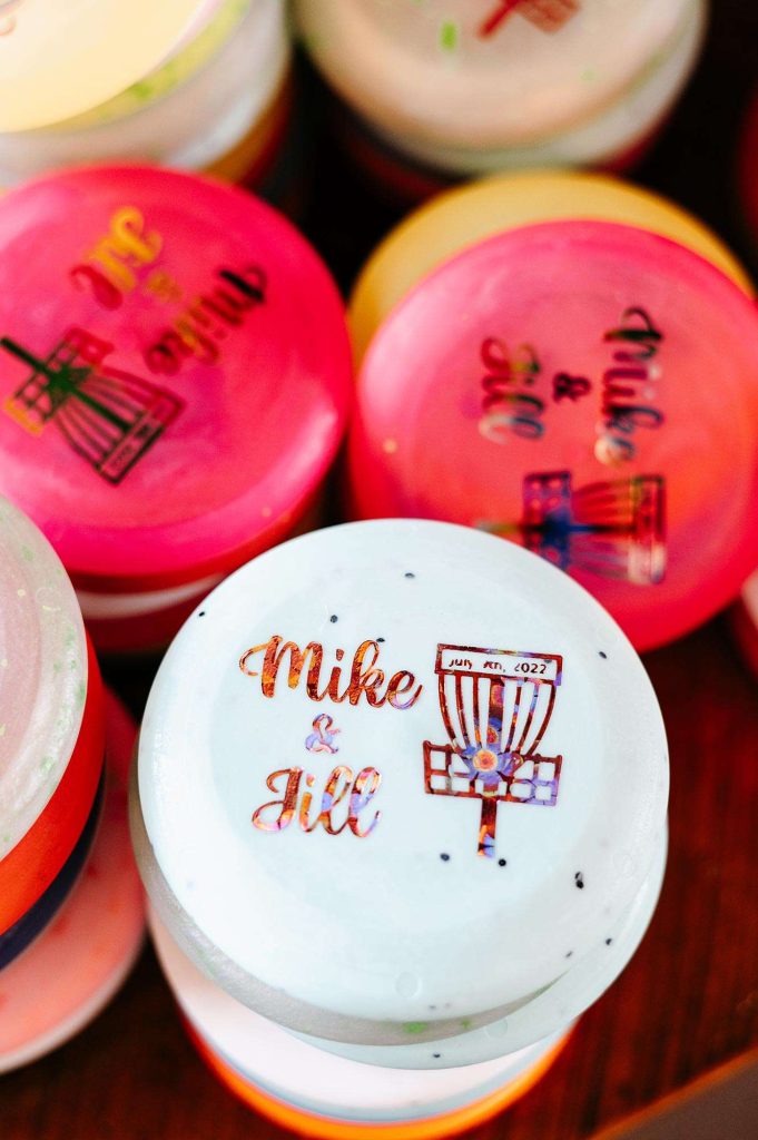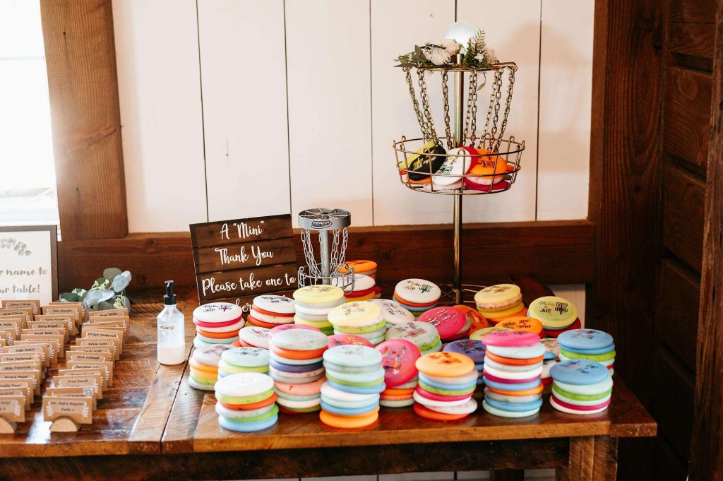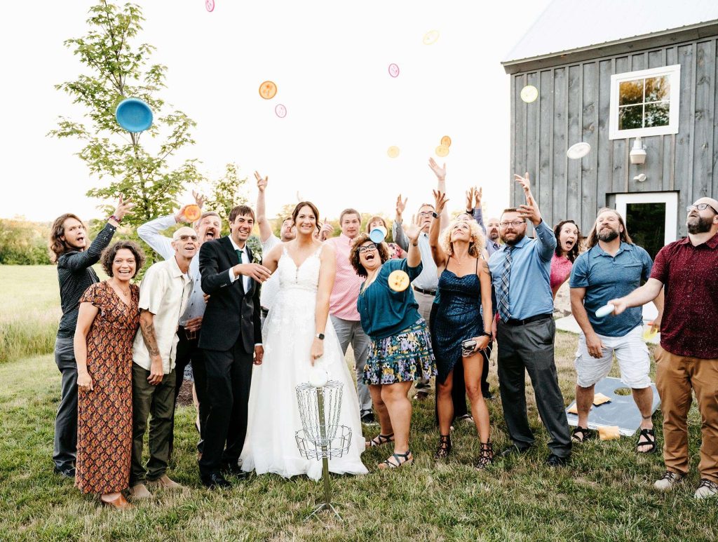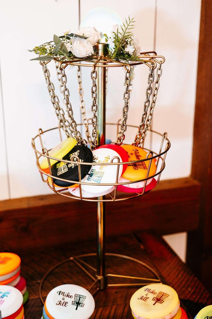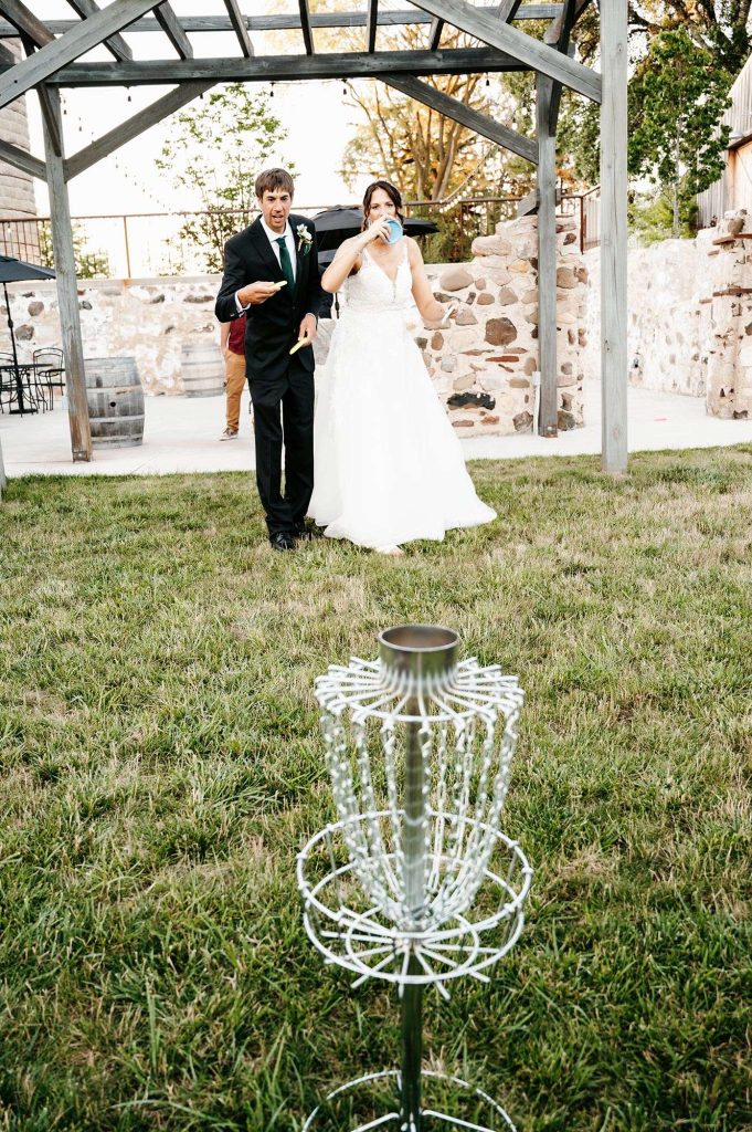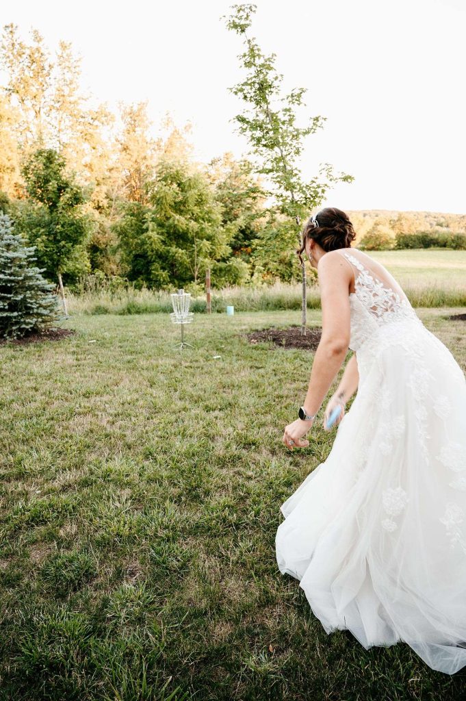 Following the ceremony, guests were able to easily move into the reception right on the Lilac Acres property. “We had passed apps, and guests were able to get drinks and socialize. We had a game of corn hole set up as well as a mini disc golf basket. As favors, we gave out mini disc-golf discs with our names on it, so people were able to grab them and play a mini game the whole night. It warmed our hearts that our guests were able to find a love of the game that brought us together.