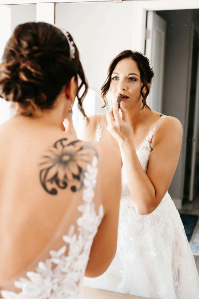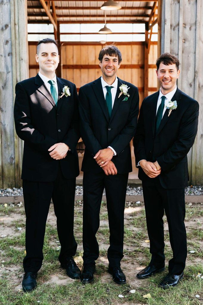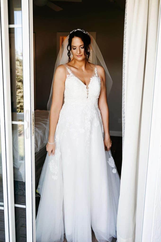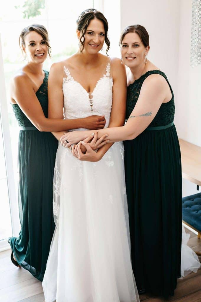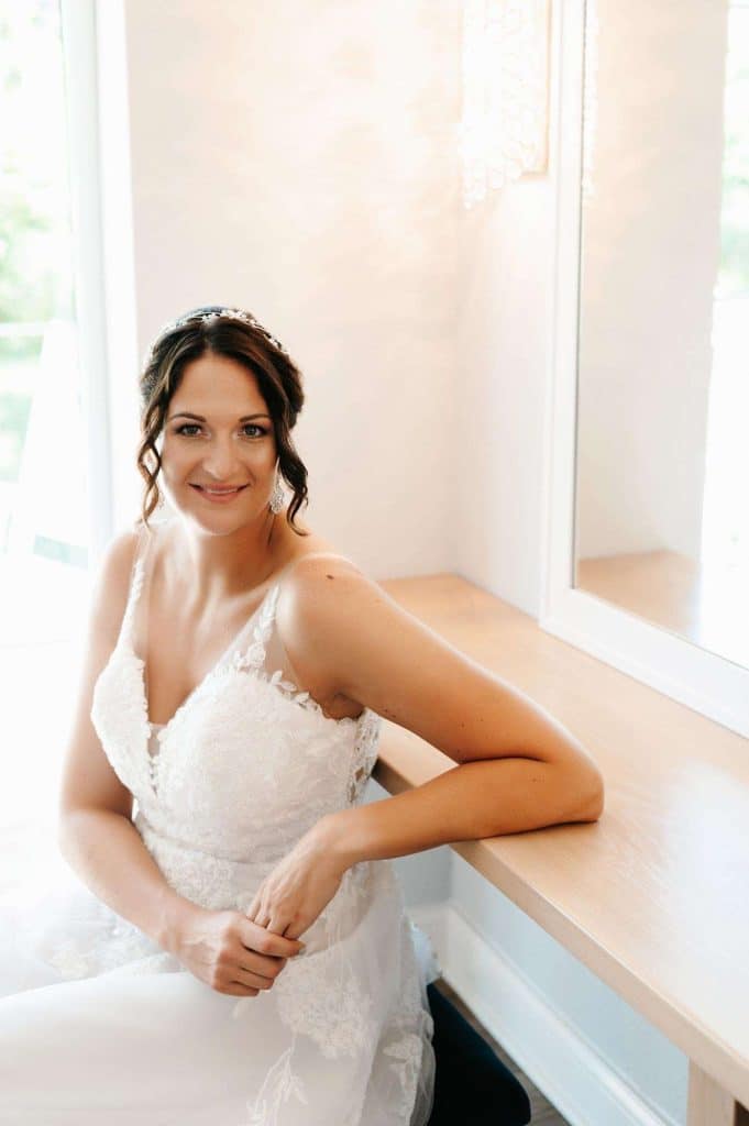 Mike and Jill planned a July wedding with a rustic, minimal theme and a dash of disc golf. Their colors were emerald green, wood tones, ivory and black. Jill found her Allure Bridal wedding dress at Bliss Bridal in Brookfield. “Since I’m almost 6’4″ I needed a dress that was going to be long enough for me,” Jill explains. “I tried on about 15 dresses. The dress I chose was the first one that really felt like me. I felt comfortable and so beautiful. It was the first and only dress that both the moms said WOW to when I came out of the dressing room. I knew that was the one when I got the response from them.”
