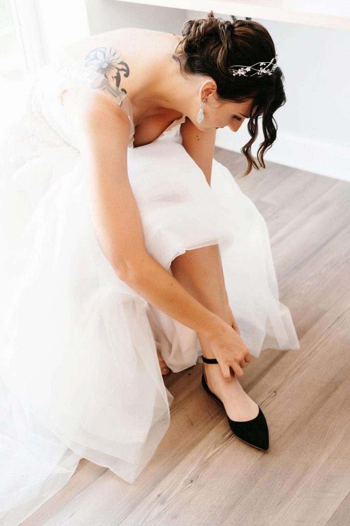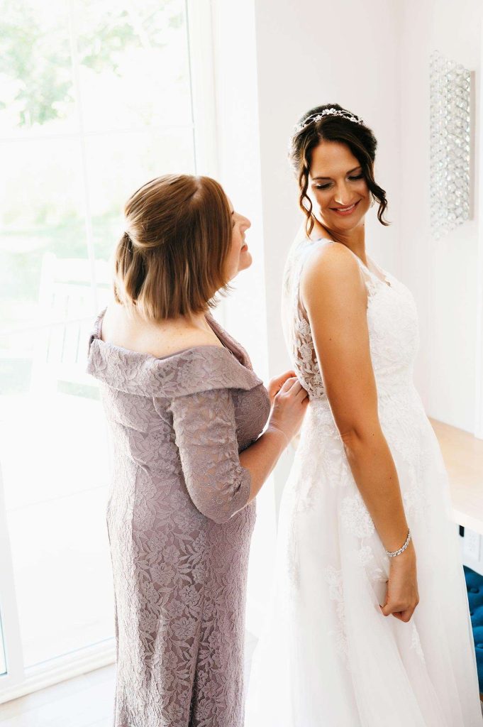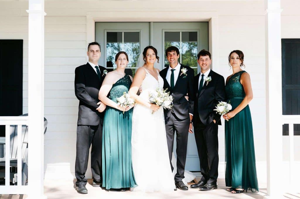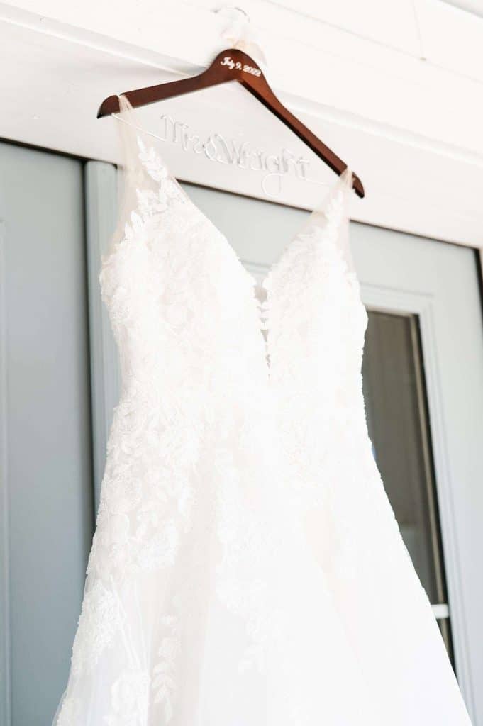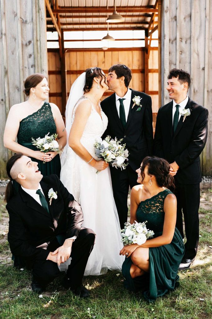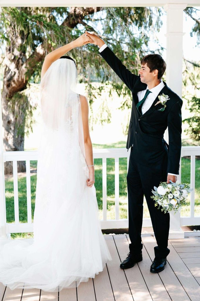 Mike and Jill planned a July wedding with a rustic, minimal theme and a dash of disc golf. Their colors were emerald green, wood tones, ivory and black. Jill found her Allure Bridal wedding dress at Bliss Bridal in Brookfield. “Since I’m almost 6’4″ I needed a dress that was going to be long enough for me,” Jill explains. “I tried on about 15 dresses. The dress I chose was the first one that really felt like me. I felt comfortable and so beautiful. It was the first and only dress that both the moms said WOW to when I came out of the dressing room. I knew that was the one when I got the response from them.”