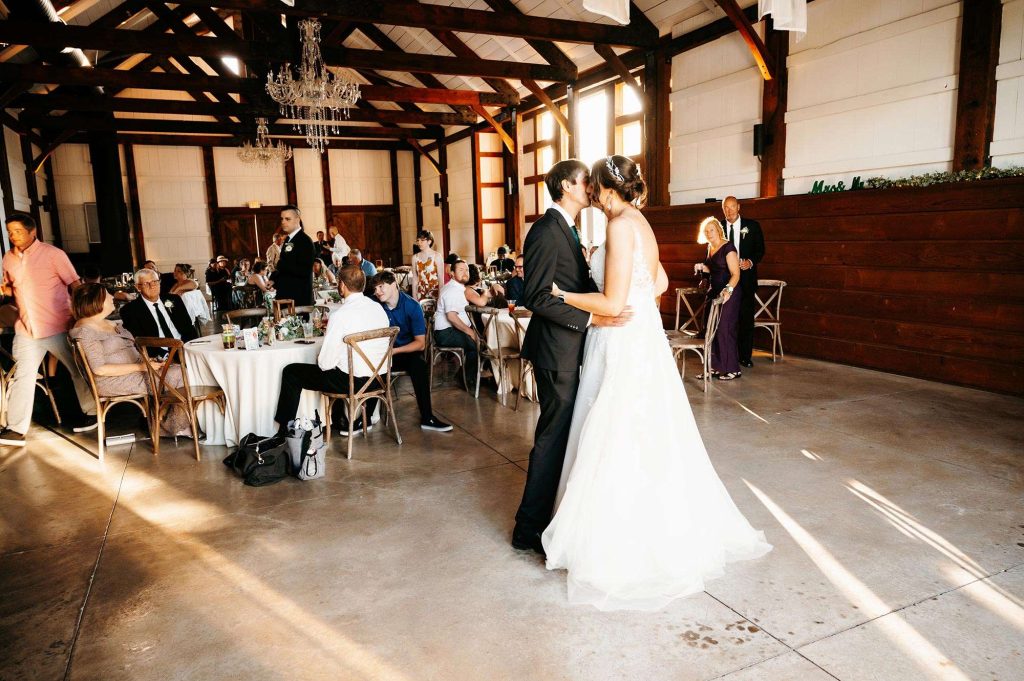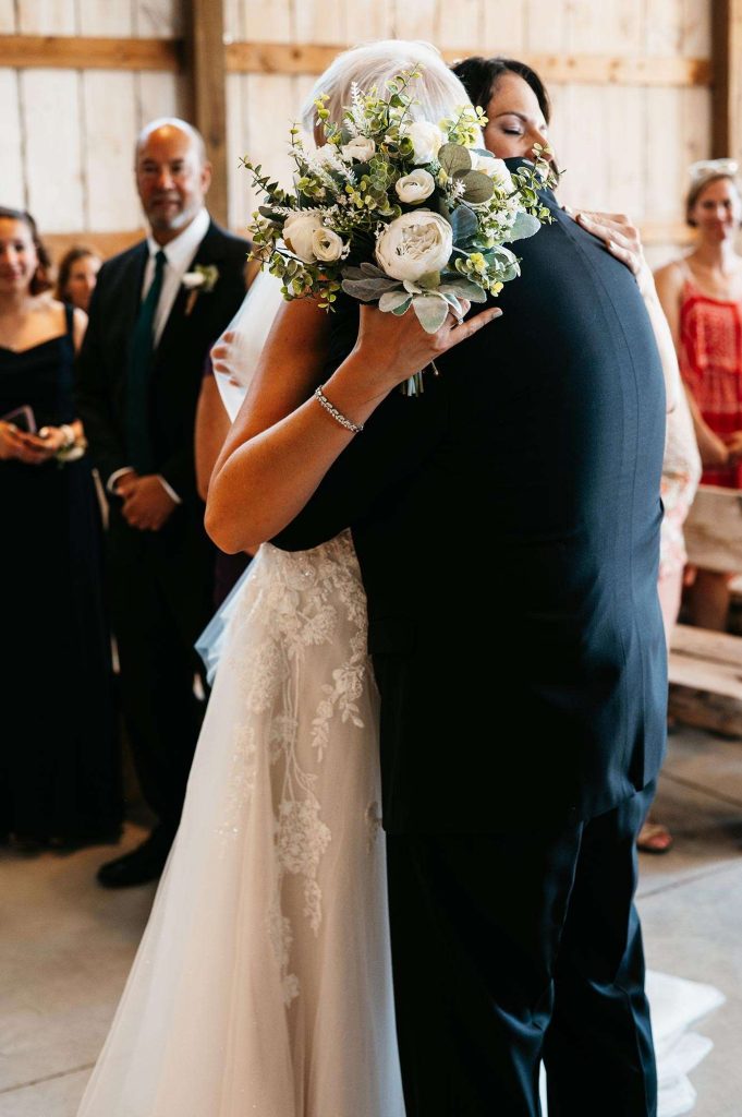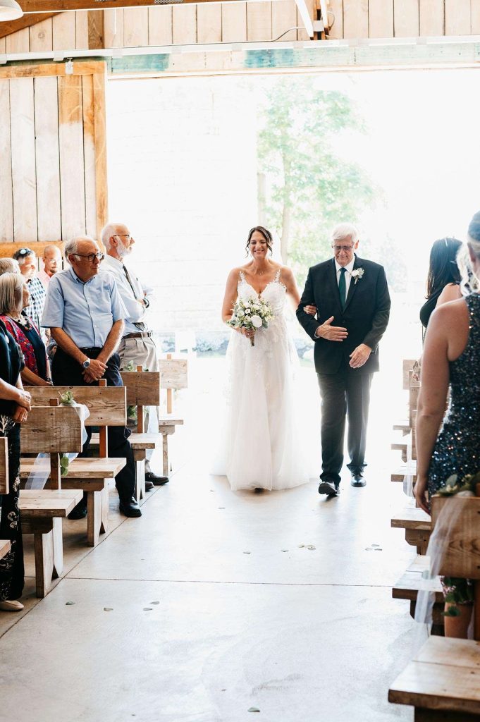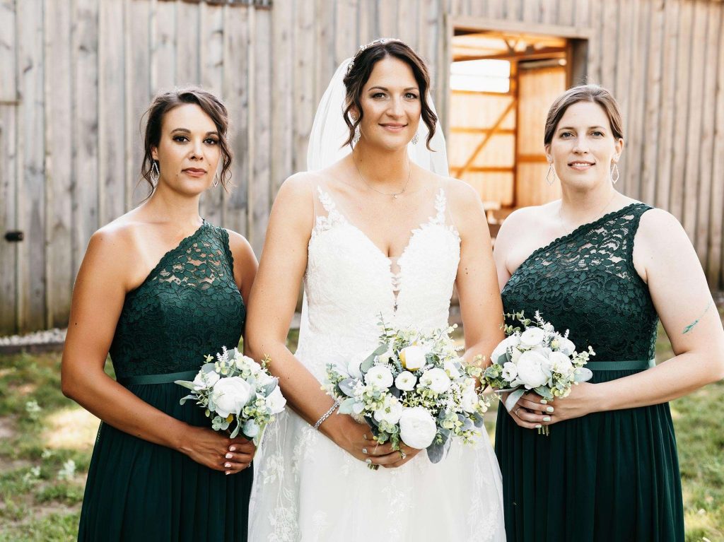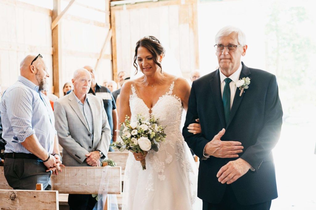 Jill and Mike decided on an all-in-one ceremony and reception at Lilac Acres Farm. “We were able to get married, have the reception, and stay overnight at the same property.” Lilac Acres is chock full of thoughtful amenities that make for a wonderful wedding. The barn has air conditioning and heating for optimal comfort whatever the weather. They provide everything from tables and chairs to full bar services. The barn has maintained its rustic feel, but with updated amenities like real bathrooms. “It was just easy. And the chandeliers made it stand out, adding elegance to the rustic aesthetic.”