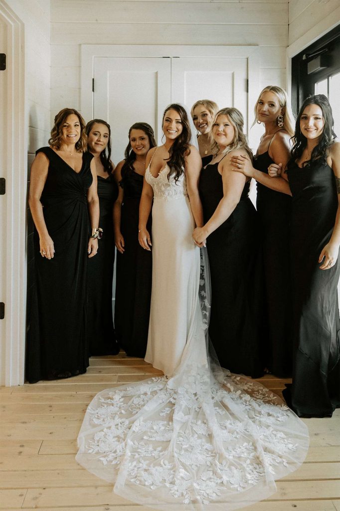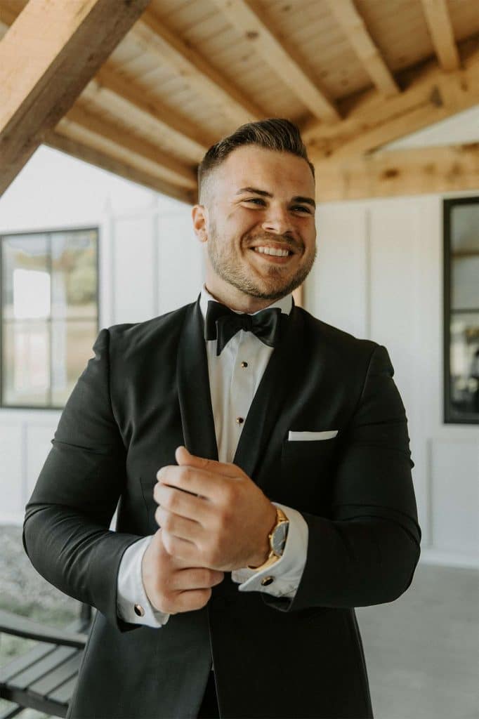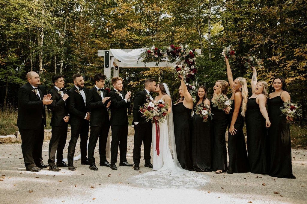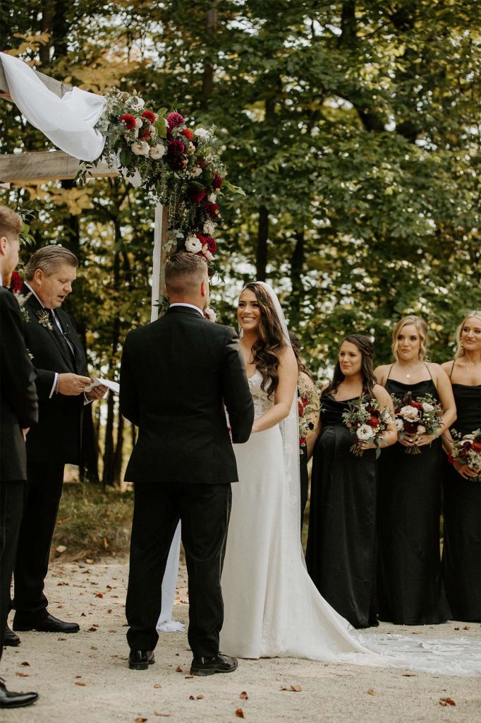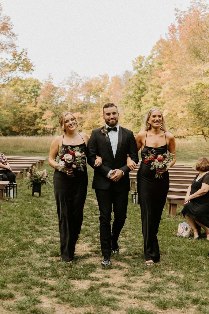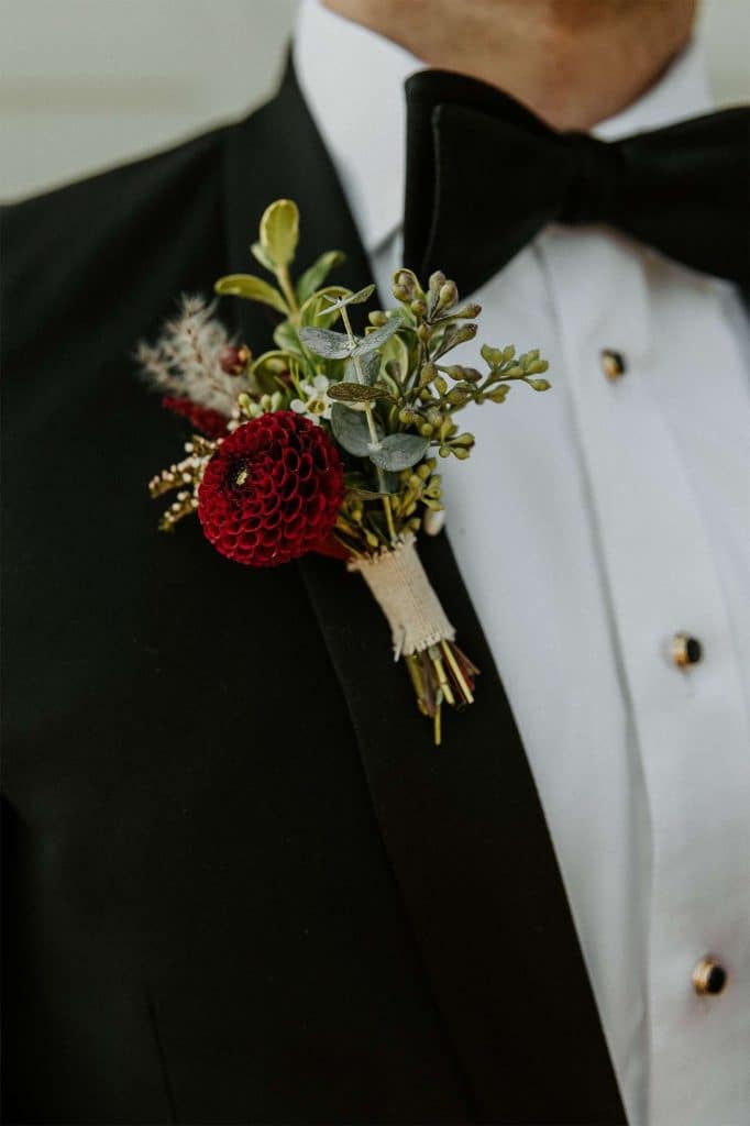 Katelyn and Tommy made their wedding a black tie event. “We had all of our guests wear black formal attire, as well as the bridesmaids and groomsmen. We wanted a modern, classic black tie event with a bit of a boho twist.” The colors of the day were black, gold, and white with maroon accents in the flowers.
