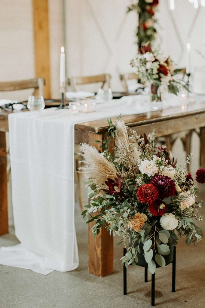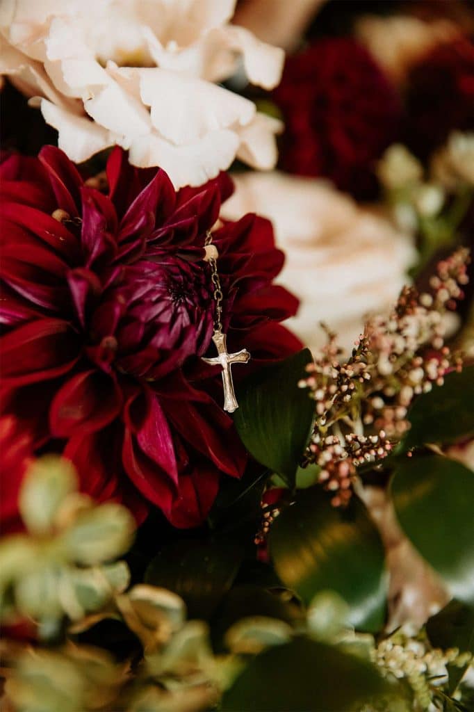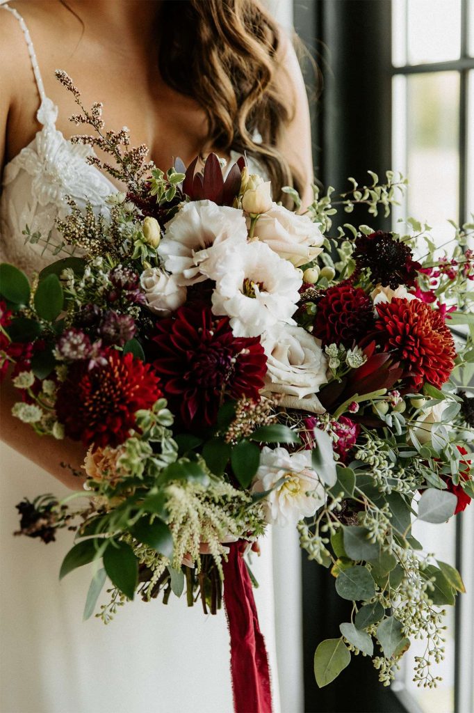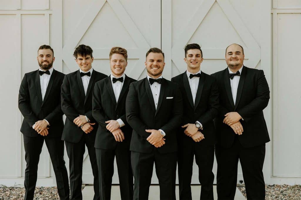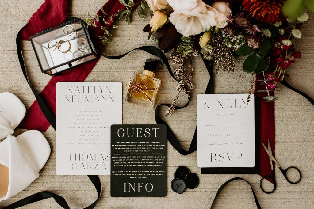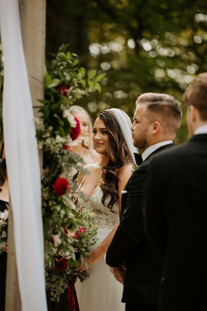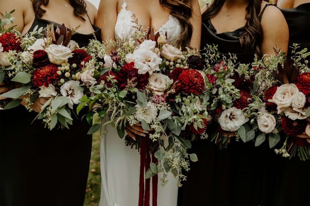 Katelyn and Tommy made their wedding a black tie event. “We had all of our guests wear black formal attire, as well as the bridesmaids and groomsmen. We wanted a modern, classic black tie event with a bit of a boho twist.” The colors of the day were black, gold, and white with maroon accents in the flowers.