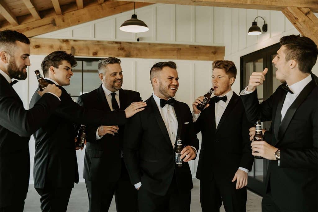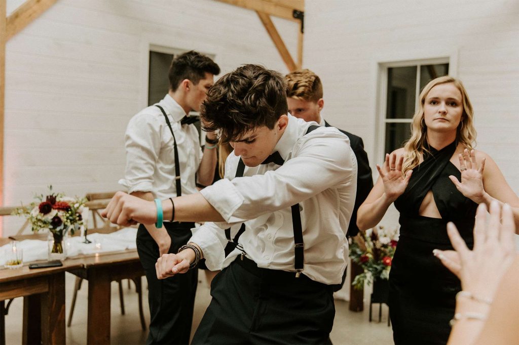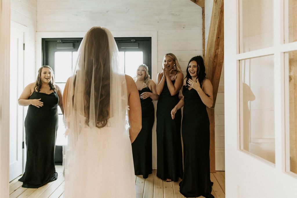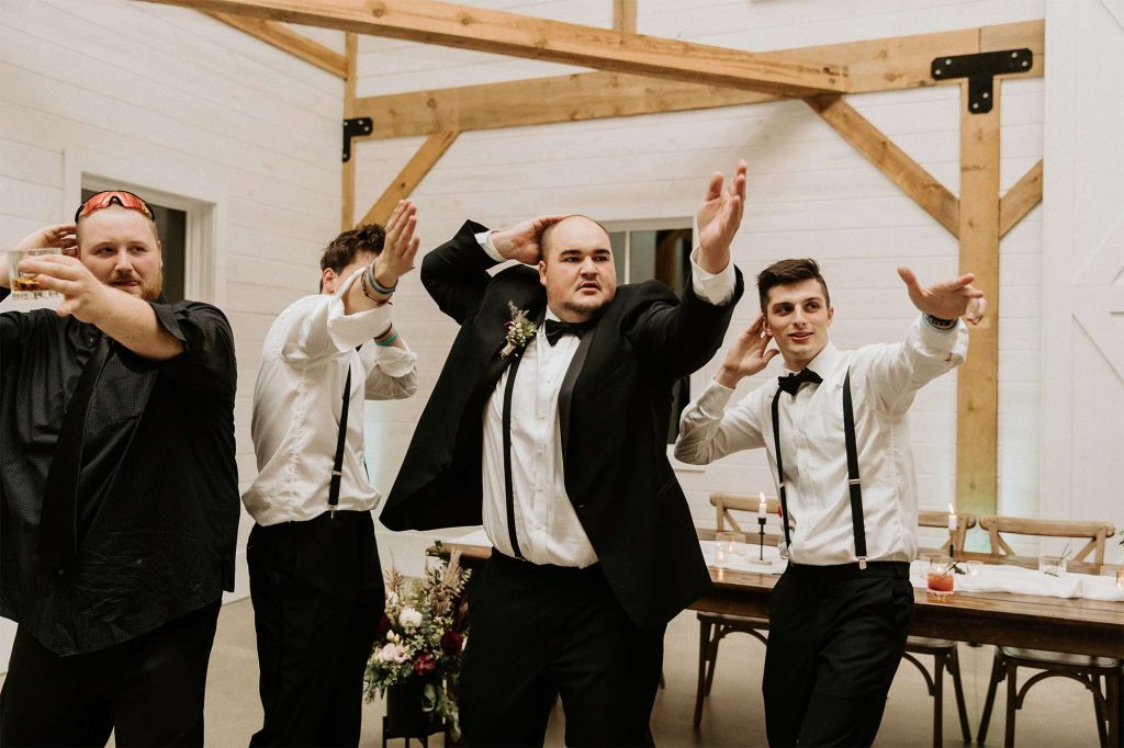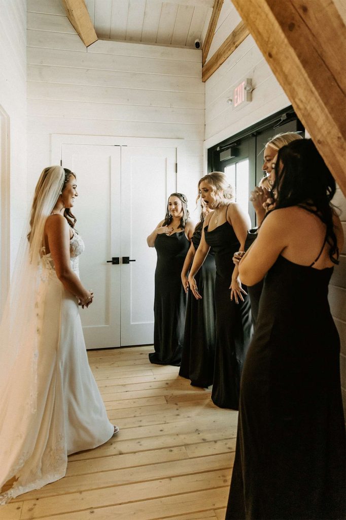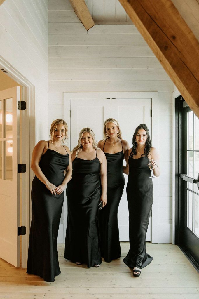 Katelyn and Tommy made their wedding a black tie event. “We had all of our guests wear black formal attire, as well as the bridesmaids and groomsmen. We wanted a modern, classic black tie event with a bit of a boho twist.” The colors of the day were black, gold, and white with maroon accents in the flowers.