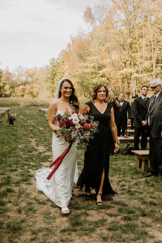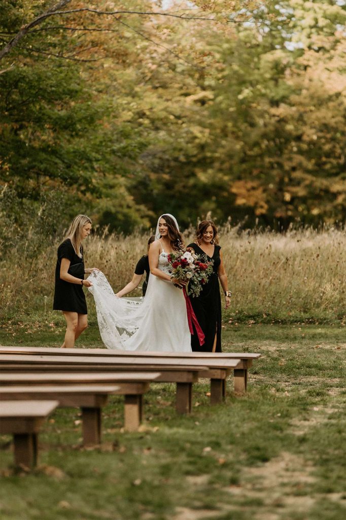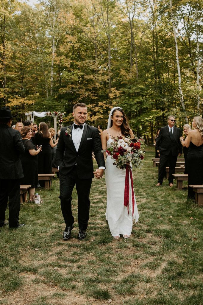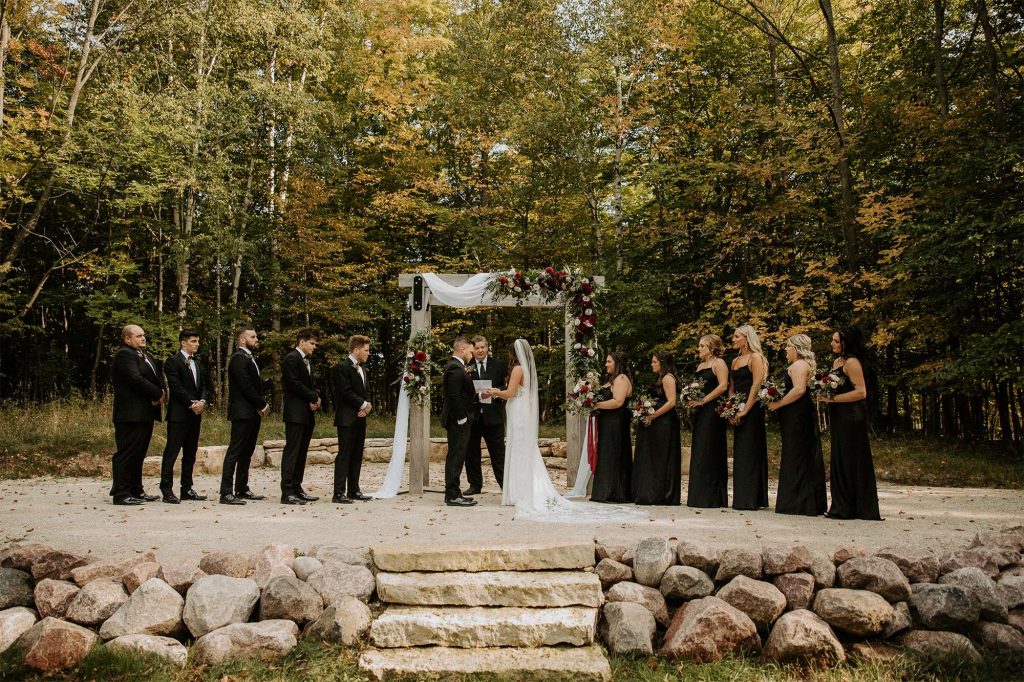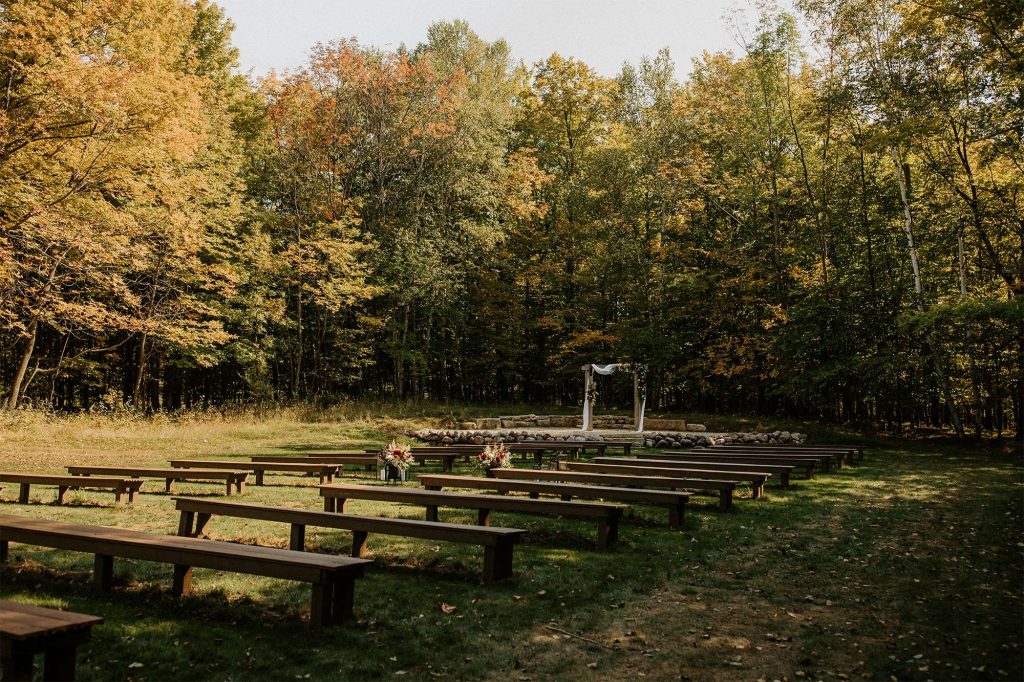 With both the ceremony and reception held at Northern Haus, the ceremony itself took place outdoors in the Forest Retreat area of the venue, surrounded by tall trees and fall colors. Guests could enjoy a welcome cocktail and were invited to choose their seat rather than sit on the bride or groom’s side.