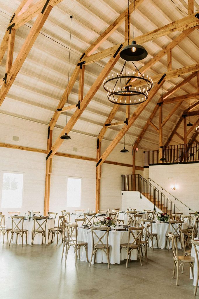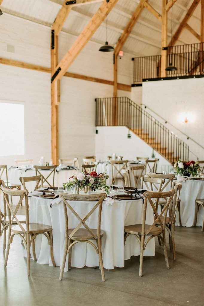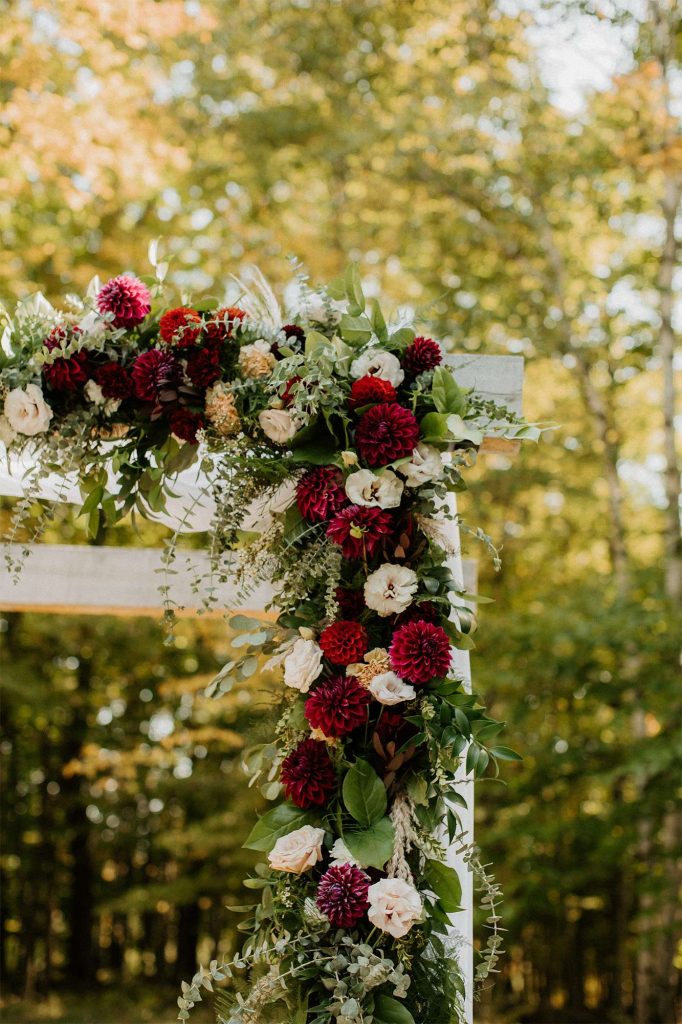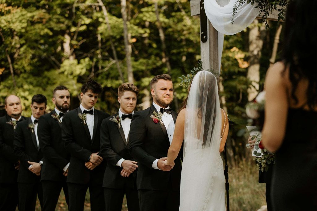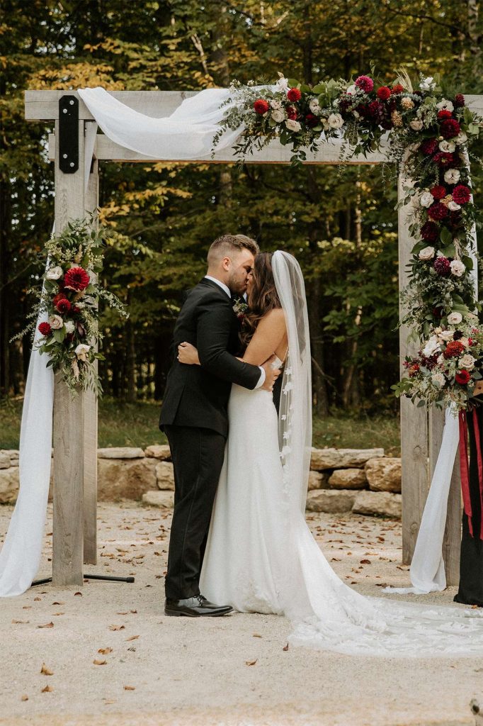 With both the ceremony and reception held at Northern Haus, the ceremony itself took place outdoors in the Forest Retreat area of the venue, surrounded by tall trees and fall colors. Guests could enjoy a welcome cocktail and were invited to choose their seat rather than sit on the bride or groom’s side.