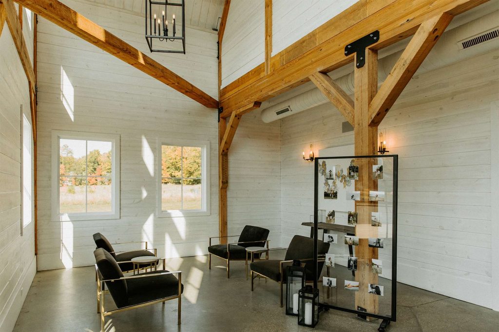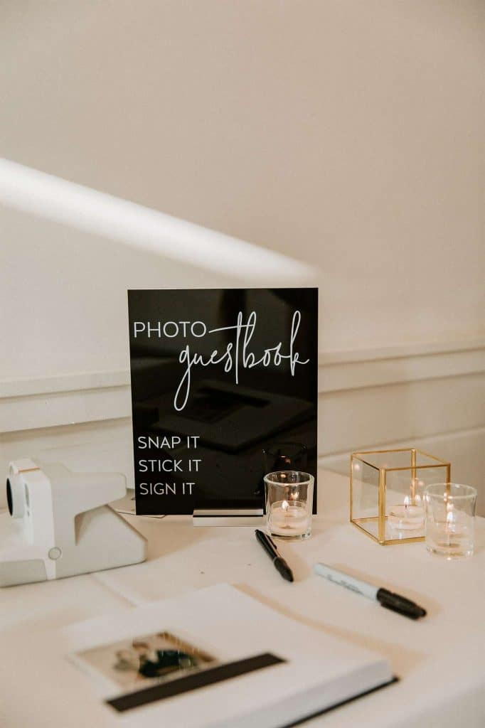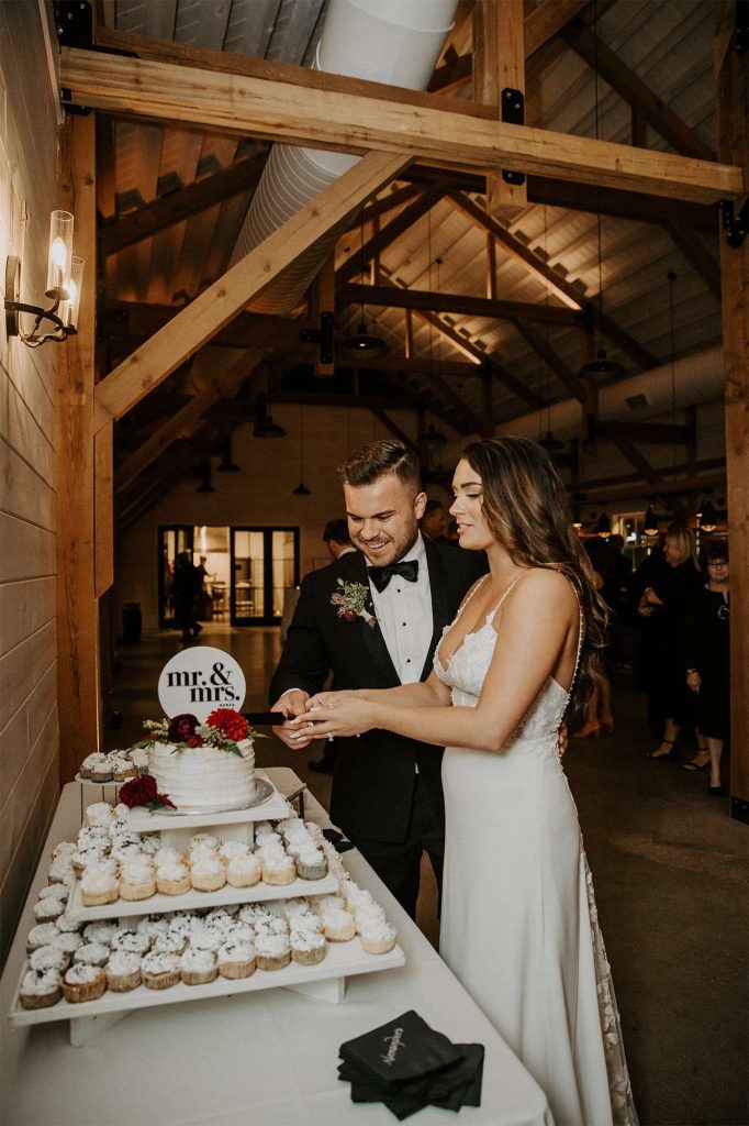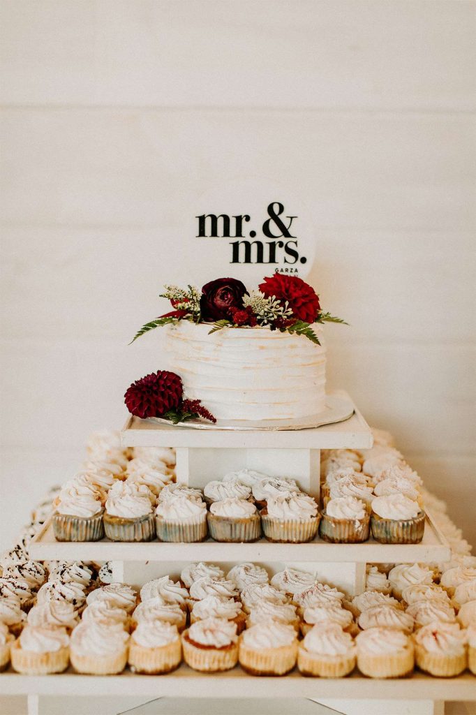 There was a large fire pit for guests to cozy up to and socialize, as well as yard games and a covered patio with rocking chairs. In the venue’s upstairs loft, there was an interactive photo booth. “Guests could take stills, boomerangs, and gifs together, and share via social media. We also had a polaroid camera for our guest book so people could snap selfies and stick and sign them in the book.”