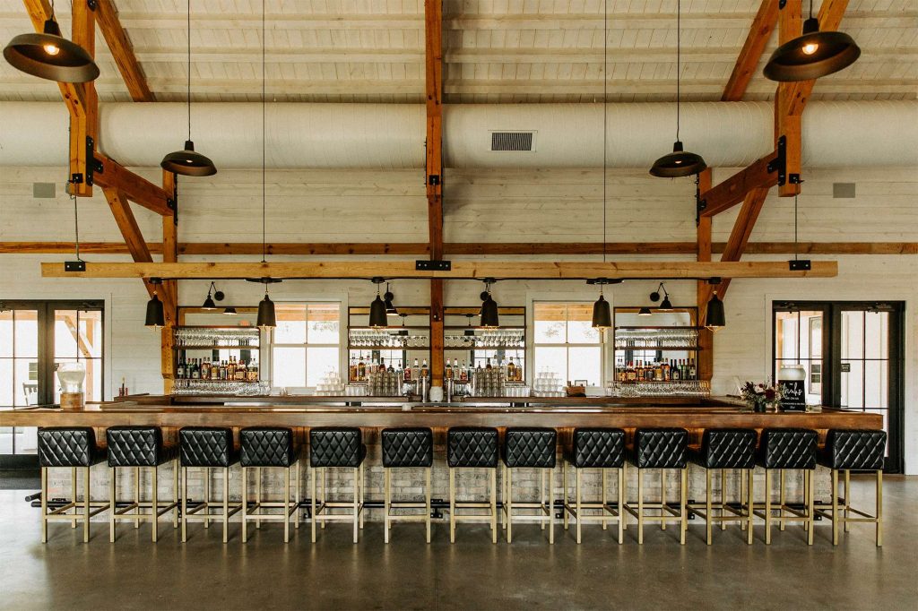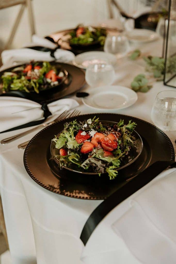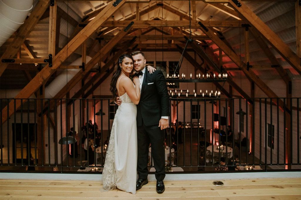 The reception was held both indoors and outside at the venue. As guests exited the Forest Retreat, they were greeted by a champagne wall. Cocktail hour began right away with passed hors d’oeuvres. “Our passed hors d’oeuvres included bacon wrapped water chestnuts, glazed potstickers, caprese skewers, and goat cheese lingonberry bruschettas. Our personal favorites were the potstickers and bruschettas.”
