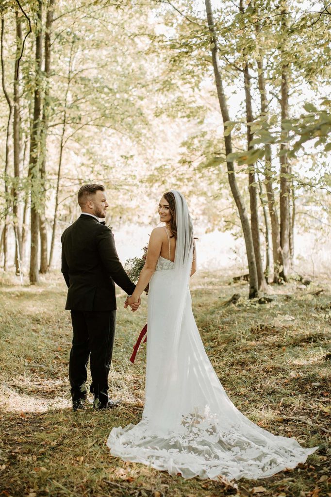 “We were married by a close family friend and had about 85 people in attendance. Our favorite parts of the ceremony were being surrounded by our families and closest friends as we said our vows to each other. Being outdoors made it so much more romantic and special. Fall is our favorite season, and we had such a perfect sunny and 65-degree day. The leaves were actually falling off the trees as we walked down the aisle as a married couple.”