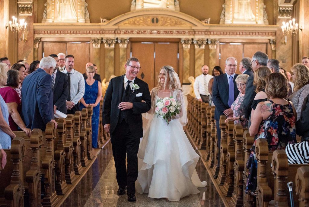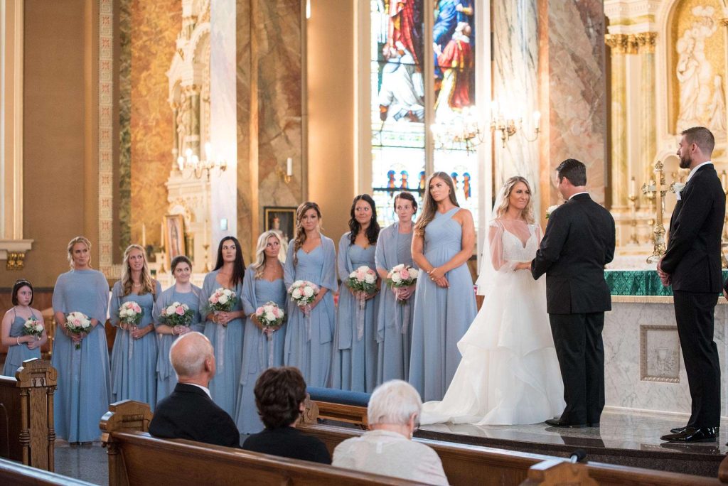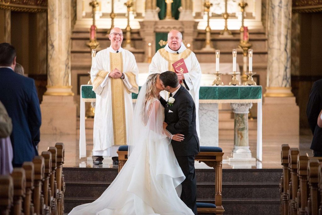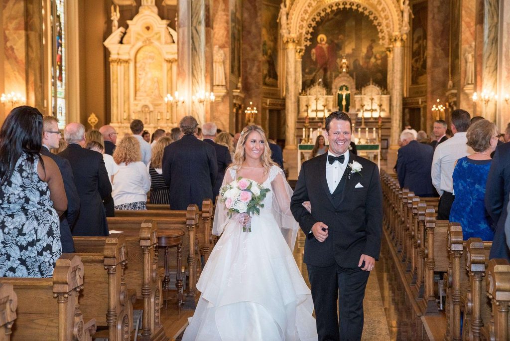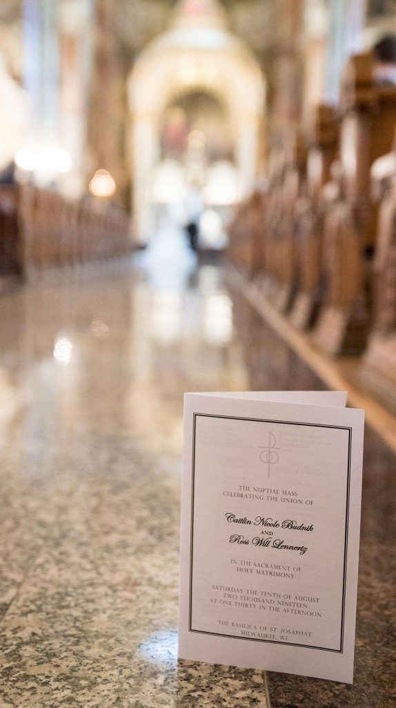Kati and Ross had their wedding ceremony at the Basilica of St. Josaphat. “Just being there in such a beautiful holy church, we felt truly blessed.” Kati says she’ll never forget the moment she walked down the aisle to Ross in her Hayley Paige gown (which she found at Bliss Bridal in Brookfield).