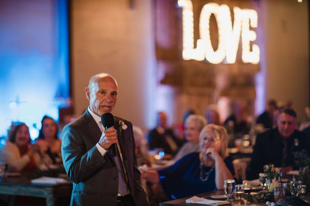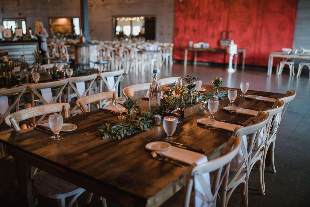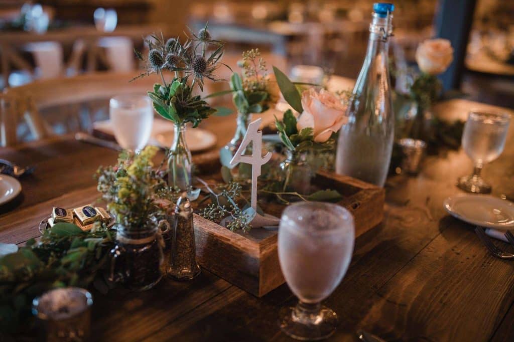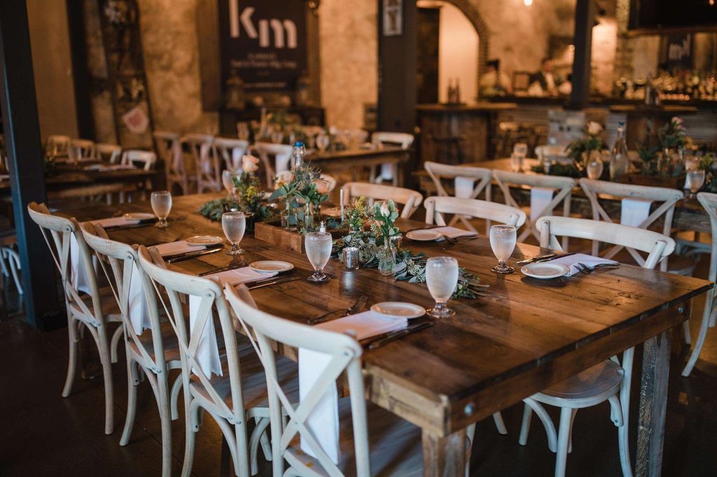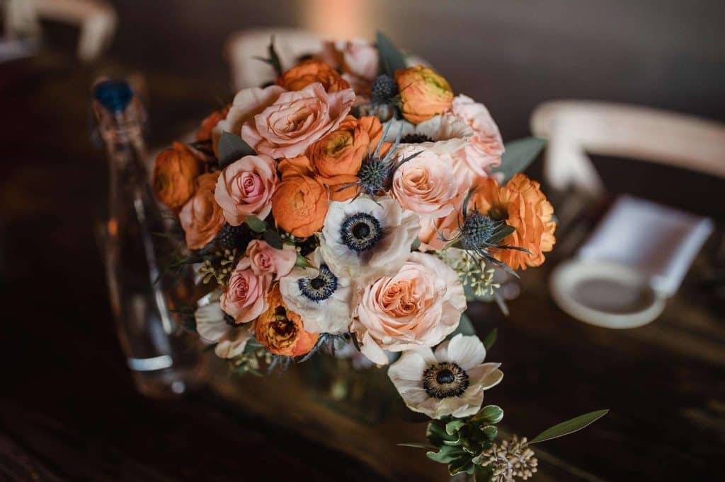 The tables were decorated with flowers by Alfa Flowers. “There was lots of candlelight with small vintage cases lining all the tables, filled with fresh colorful flowers and eucalyptus garland running through them,” Katie says. “I went with more muted base colors so that the pops of brightly-colored flowers would really stand out.”