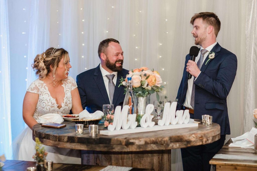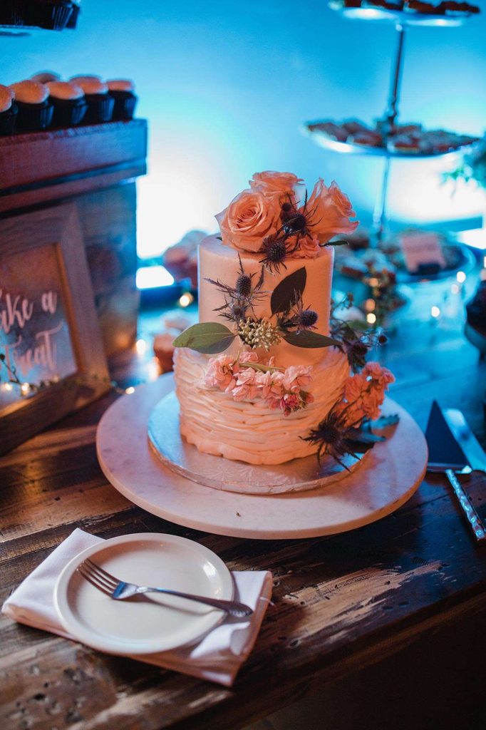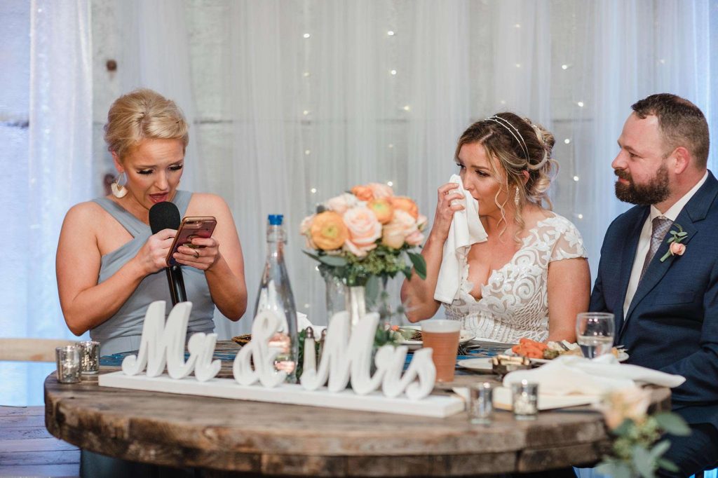 Tuscan Hall Catering provided three hand-passed appetizers during cocktail hour: crab rangoon phyllo cups, raspberry-brie bites, and gyro bites. “People raved about the gyro bites. They were basically mini gyros, and who doesn’t like that with a cocktail?” Each guest arrived at their seat to find a plated salad and bread roll. Entering the buffet line, there were two entrée choices: chicken marsala and grilled skirt steak. On the side: garlic red mashed potatoes and wild rice pilaf—”both fantastic!”