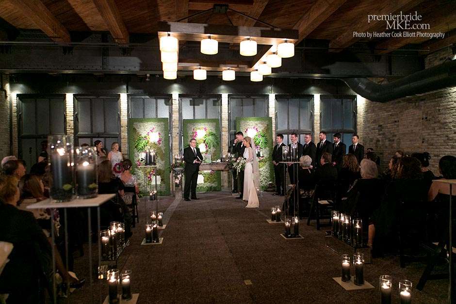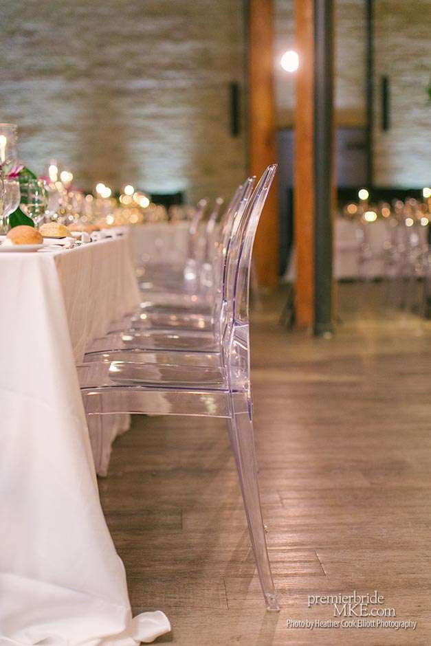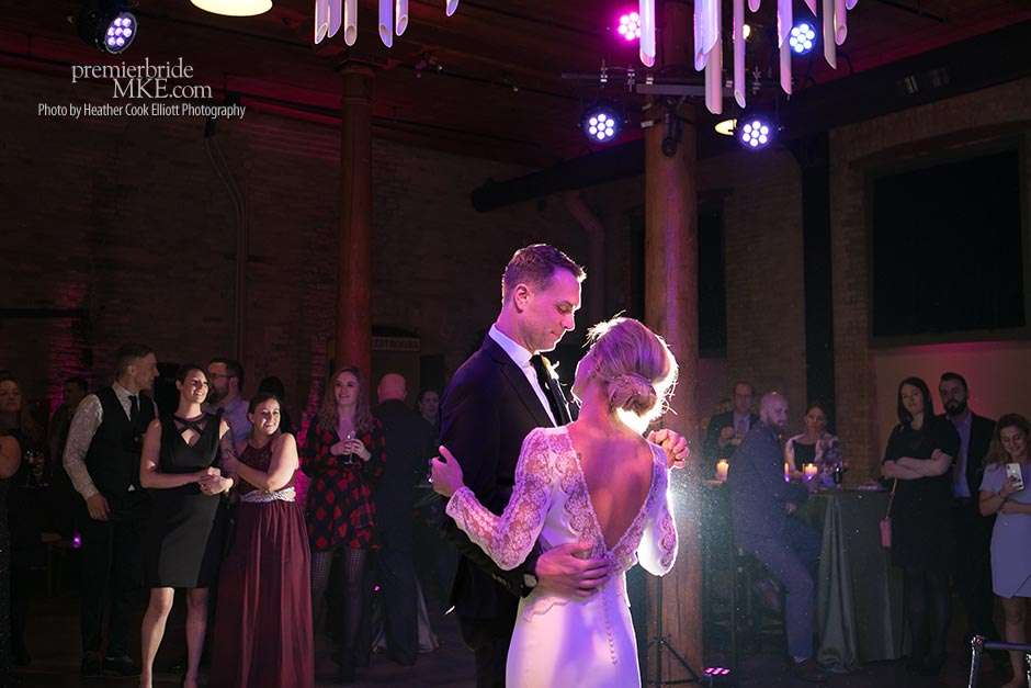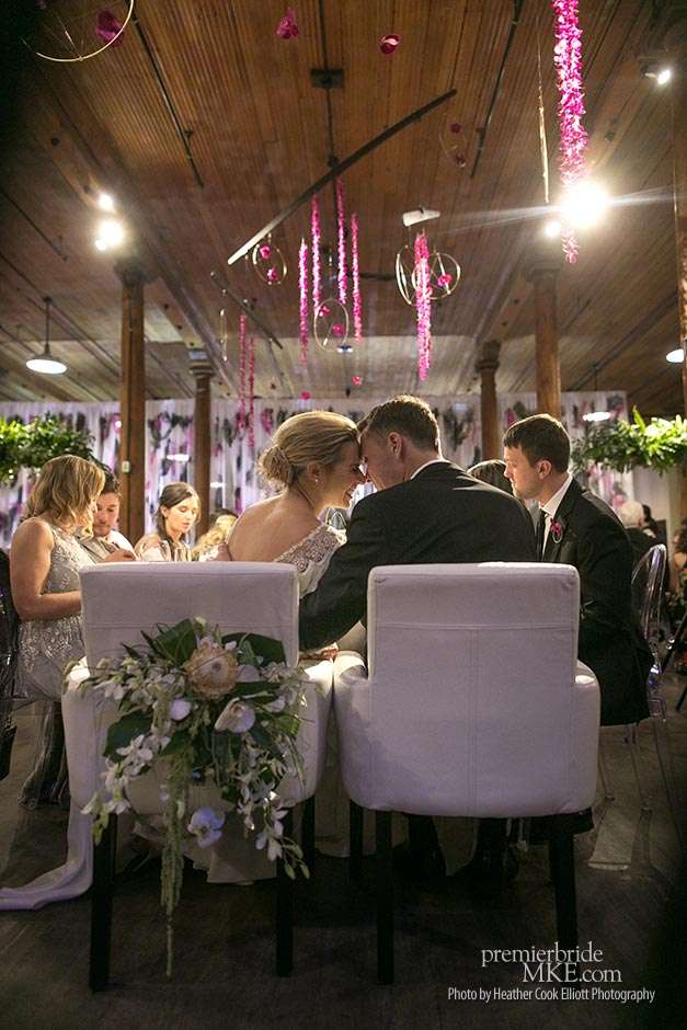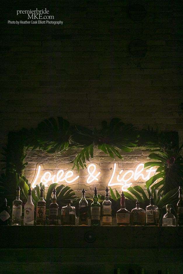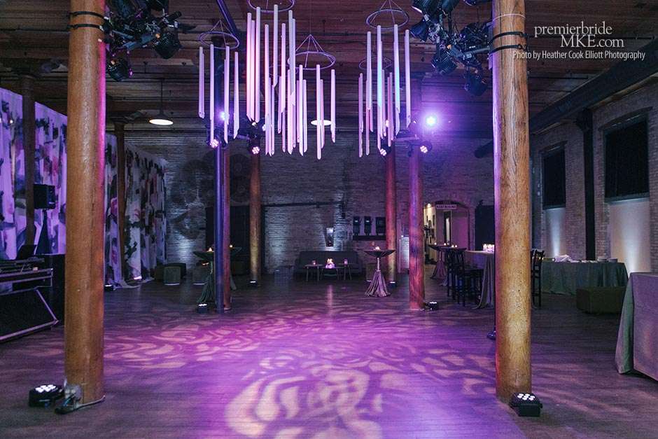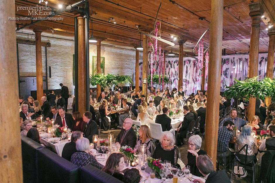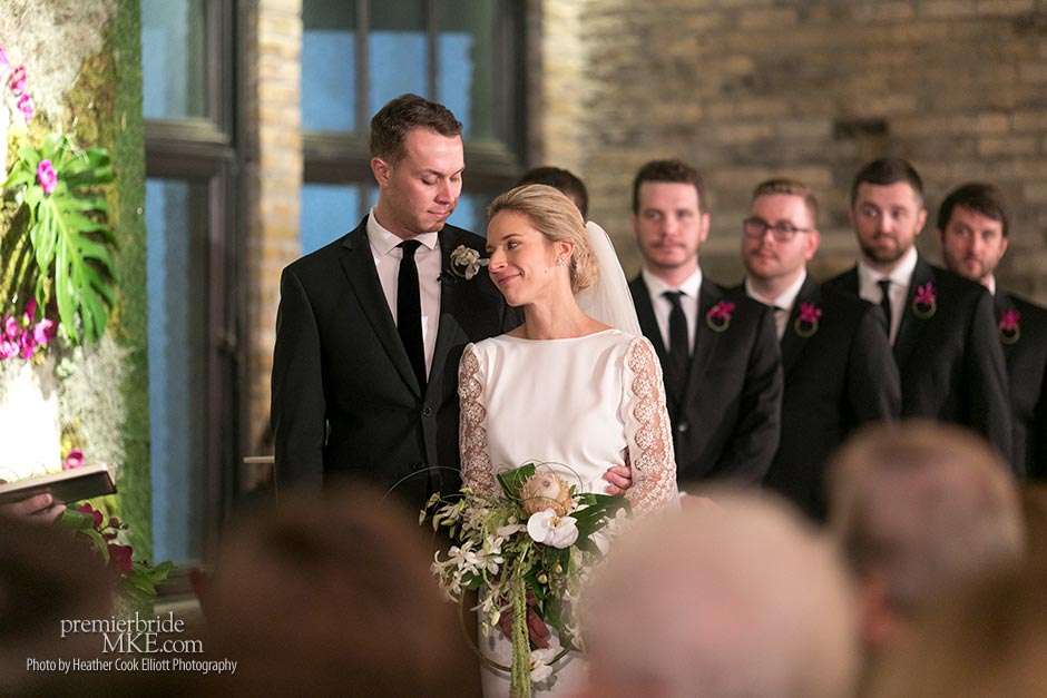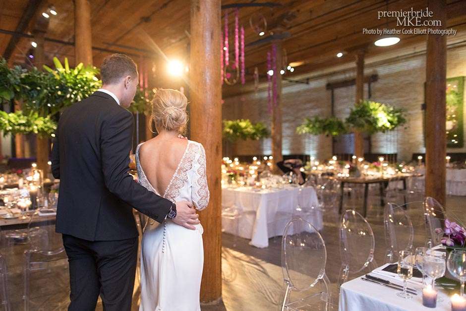 Though the two planned a January wedding at the Pritzlaff, they were determined to keep things as bright and summery as the music that brought them together. “The Pritzlaff was the first venue we saw and we knew immediately we wanted to get married there. We loved the feeling the building gives—historic yet modern, open rooms, cream city brick, wood ceiling and structures, a beautiful built-in bar. A huge reason we chose the Pritzlaff was that we could create our very own vision and customize every little detail if we wanted.”