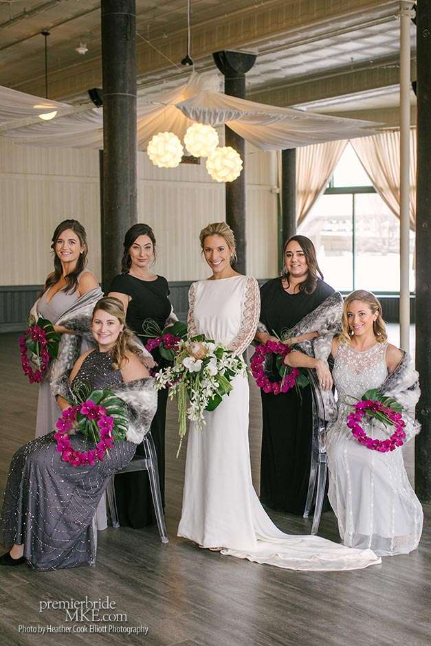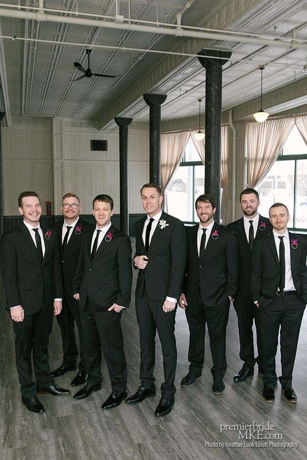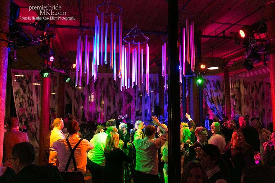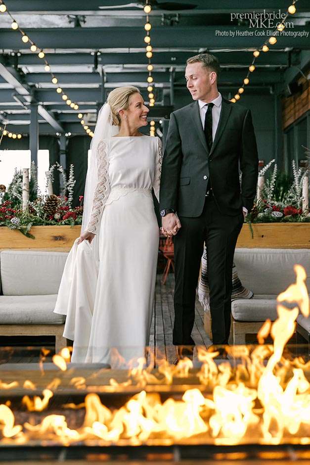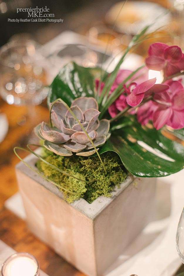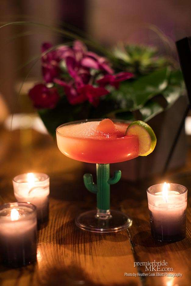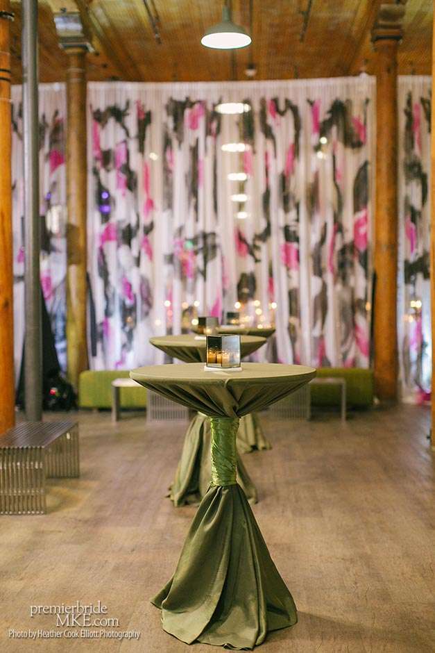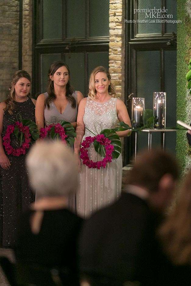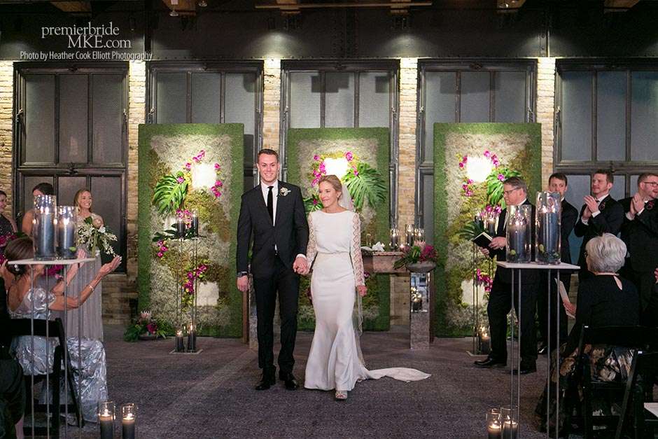 Though the two planned a January wedding at the Pritzlaff, they were determined to keep things as bright and summery as the music that brought them together. “The Pritzlaff was the first venue we saw and we knew immediately we wanted to get married there. We loved the feeling the building gives—historic yet modern, open rooms, cream city brick, wood ceiling and structures, a beautiful built-in bar. A huge reason we chose the Pritzlaff was that we could create our very own vision and customize every little detail if we wanted.”
