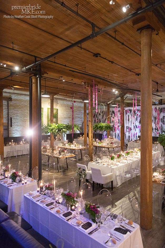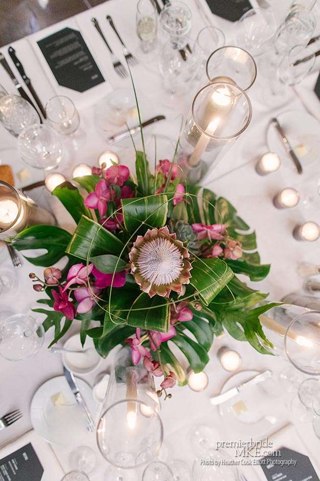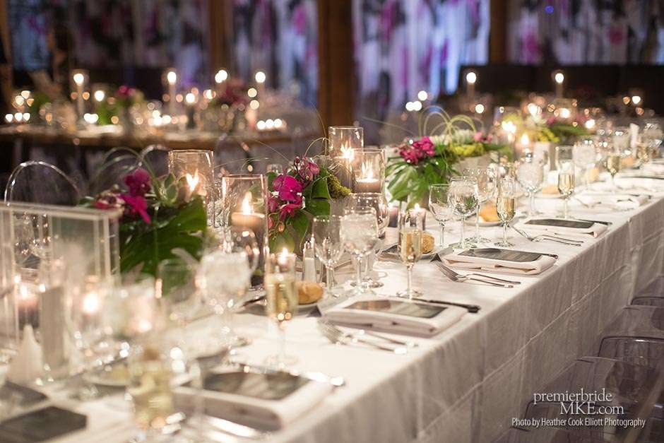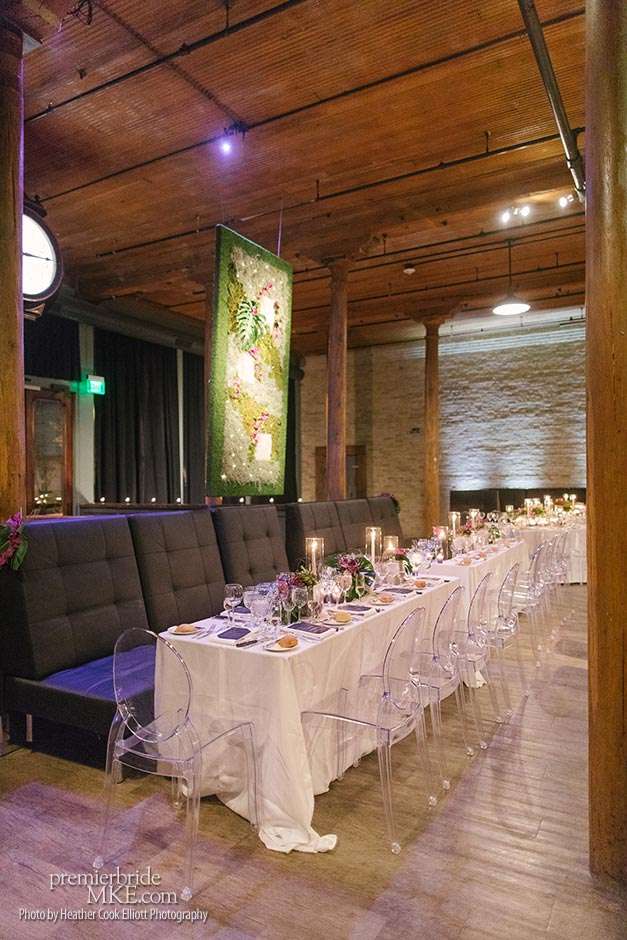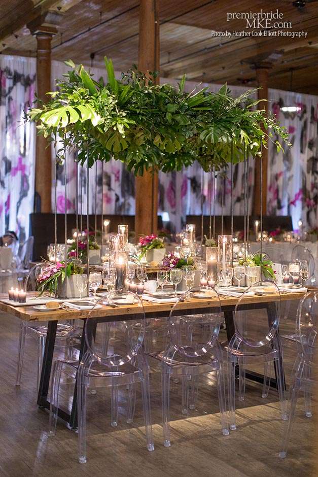 In addition to the stunning ceremony walls, there were also lush centerpieces, hanging living walls, and orchid mobiles to further fill the Pritzlaff with warm, tropical flair. Patrick and Kimmie also opted for a mix of seating, combining black banquet and wood tables with leather and ghost lucite chairs. The effect is gorgeously eye-catching and special.