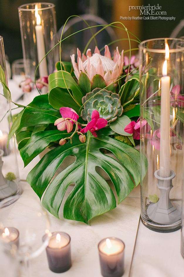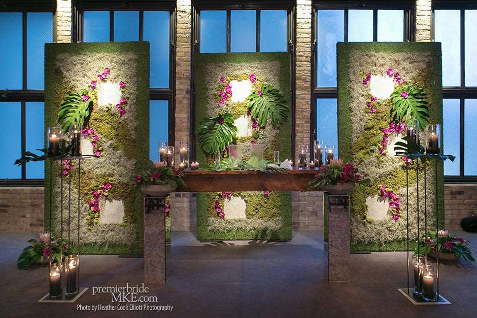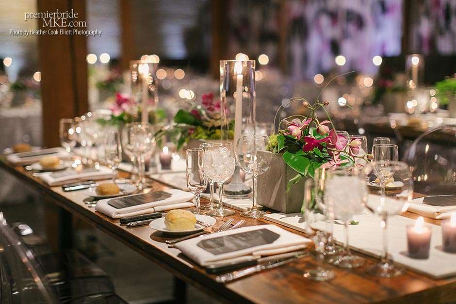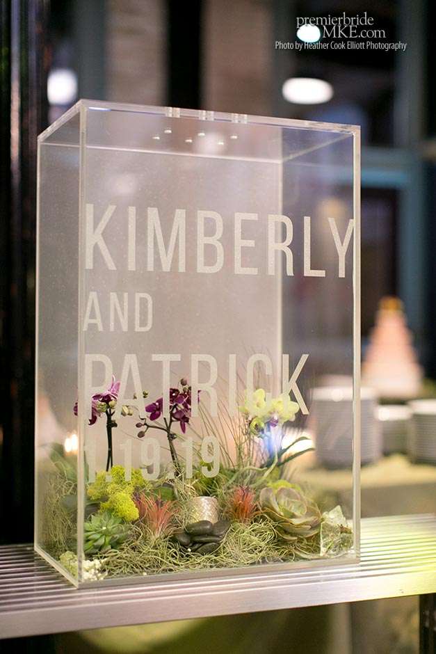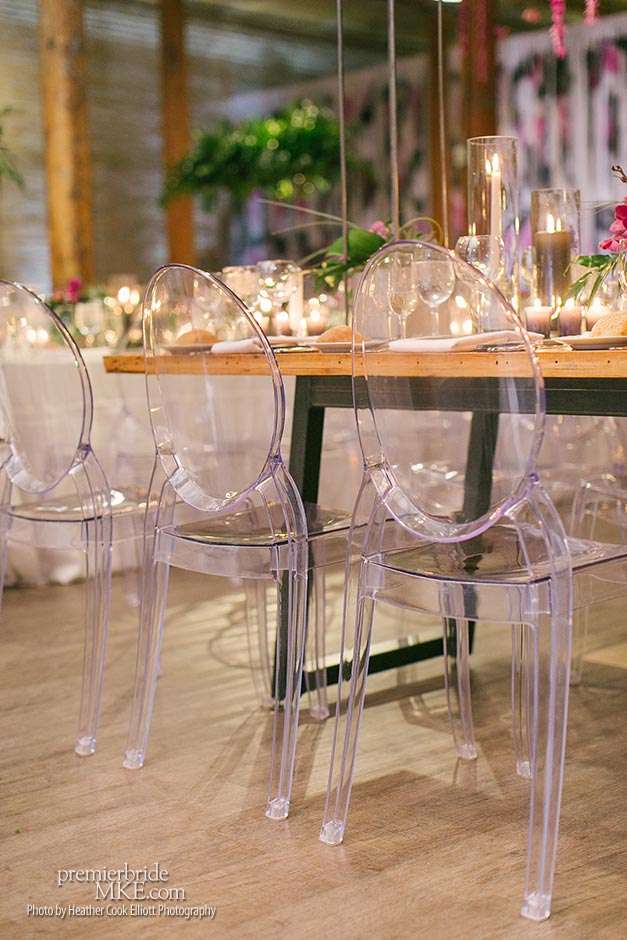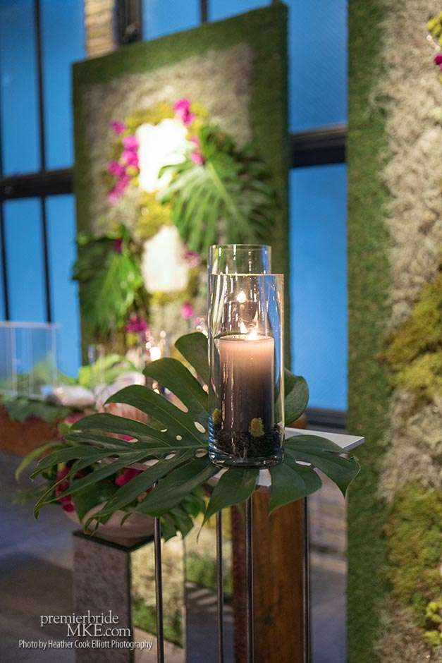 In addition to the stunning ceremony walls, there were also lush centerpieces, hanging living walls, and orchid mobiles to further fill the Pritzlaff with warm, tropical flair. Patrick and Kimmie also opted for a mix of seating, combining black banquet and wood tables with leather and ghost lucite chairs. The effect is gorgeously eye-catching and special.